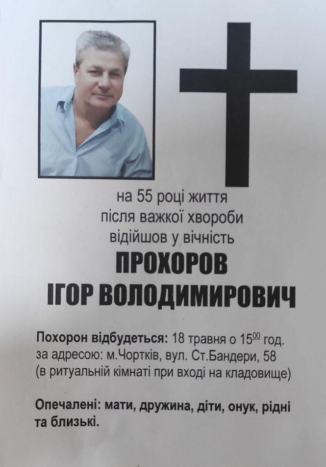 Сумну звістку про смерть майора Прохорова Ігора Володимировича повідомили у Чортківському військовому комісаріаті