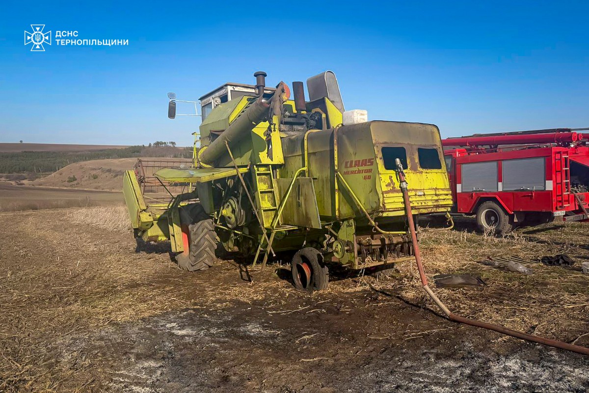 - 14:58 — с. Підлісне Монастириської ТГ. Горів комбайн. Вогнем знищено електричну частину двигуна та пошкоджено моторний відсік. Рятувальникам вдалося врятувати техніку.