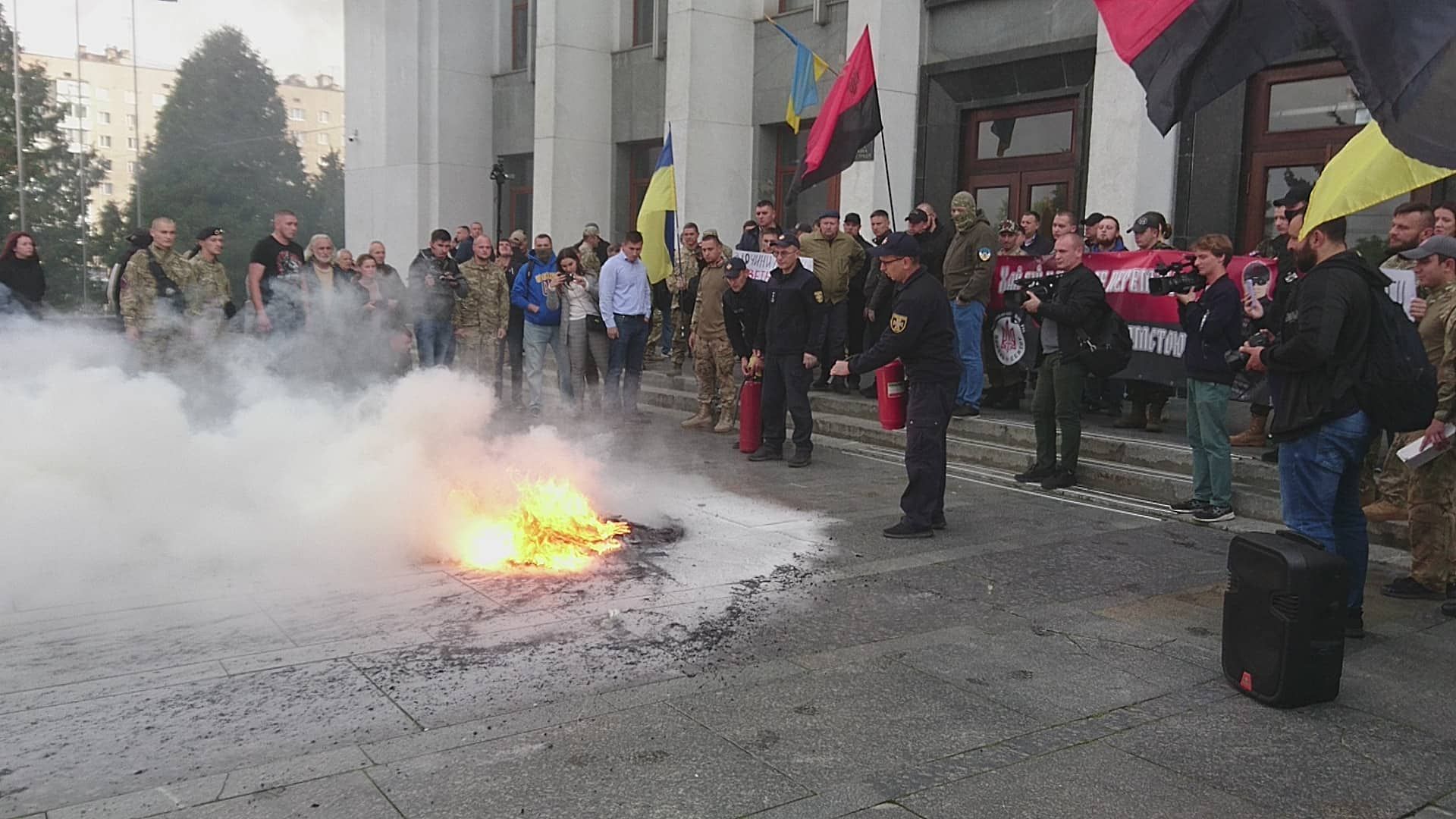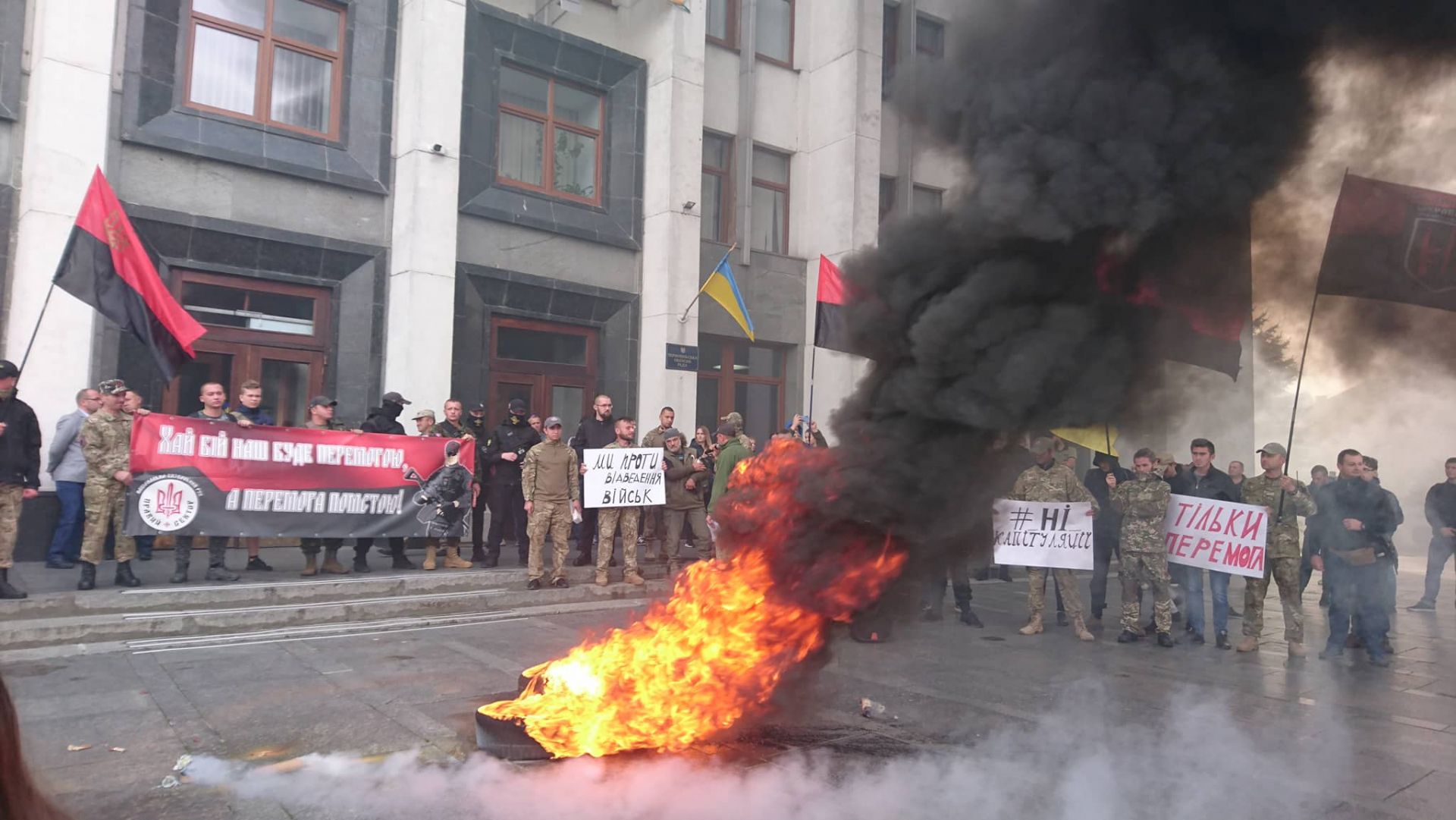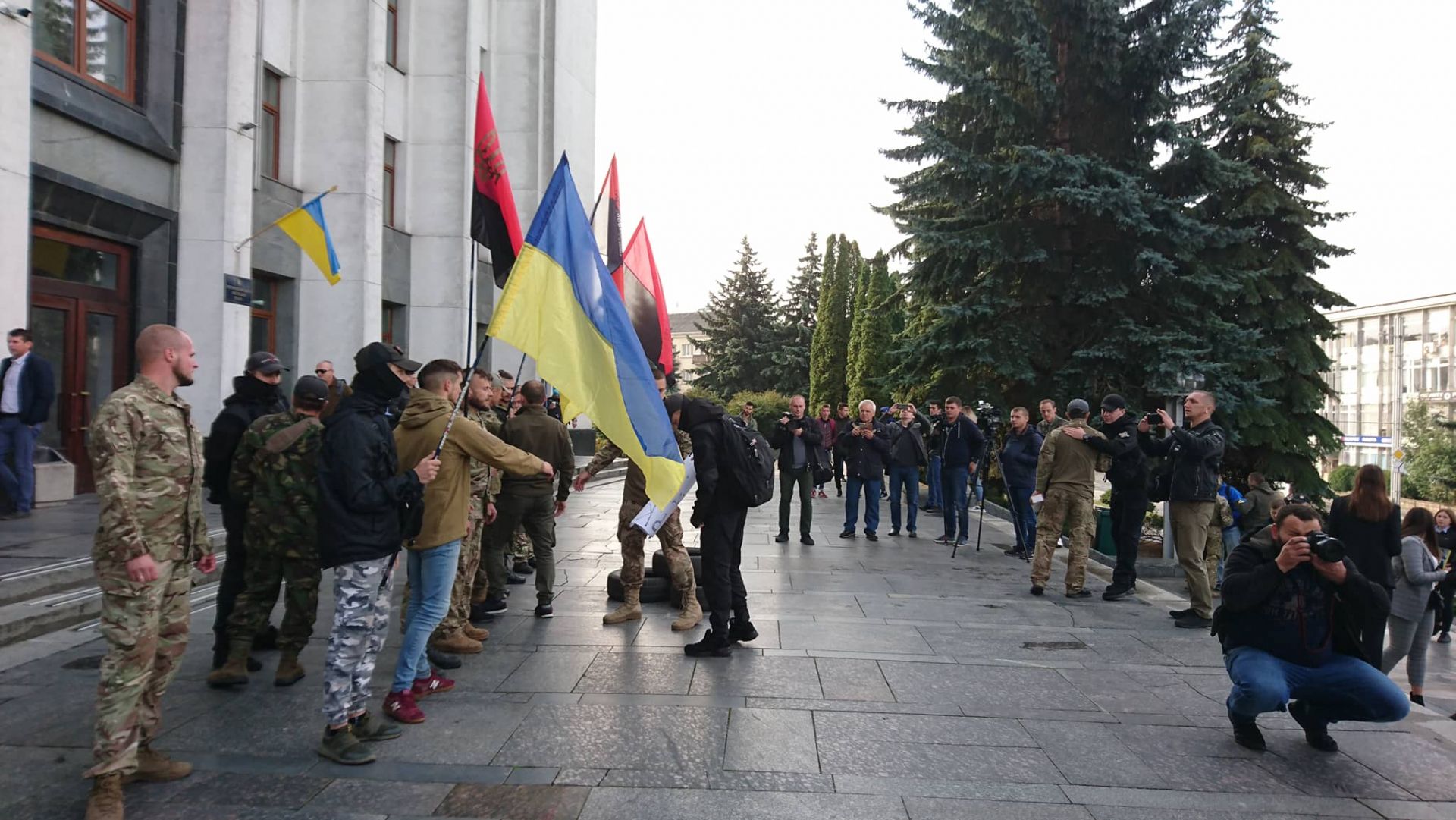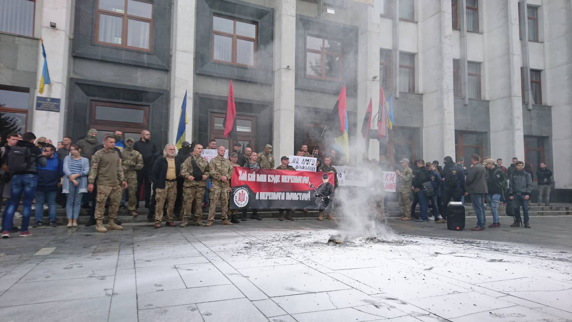Вранці 26 вересня під стінами ОДА зібралися добровольці на акцію протесту. Людей було чимало: усі у формі, з прапорами та плакатами, на яких написані були вимоги.