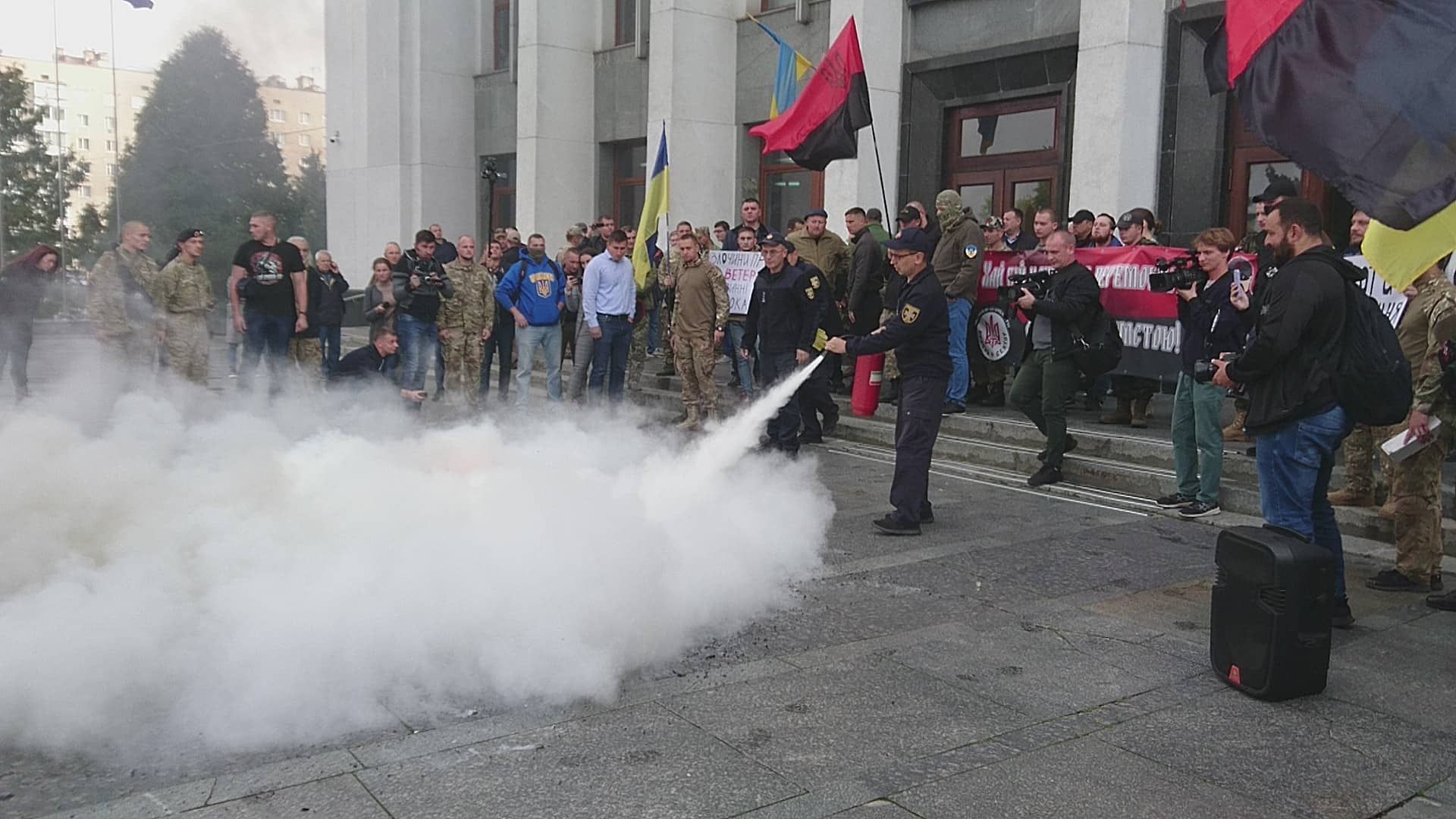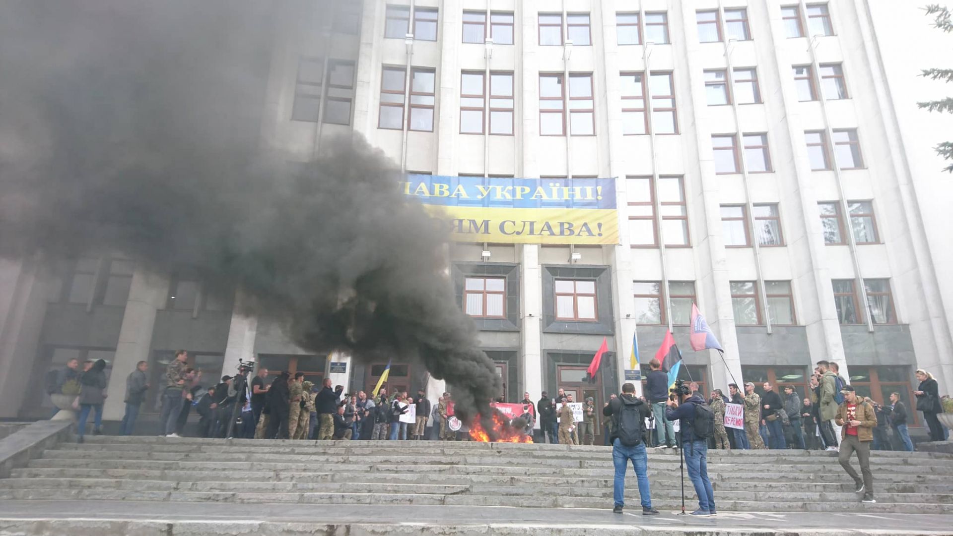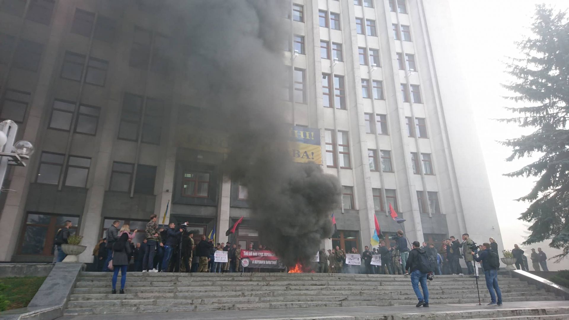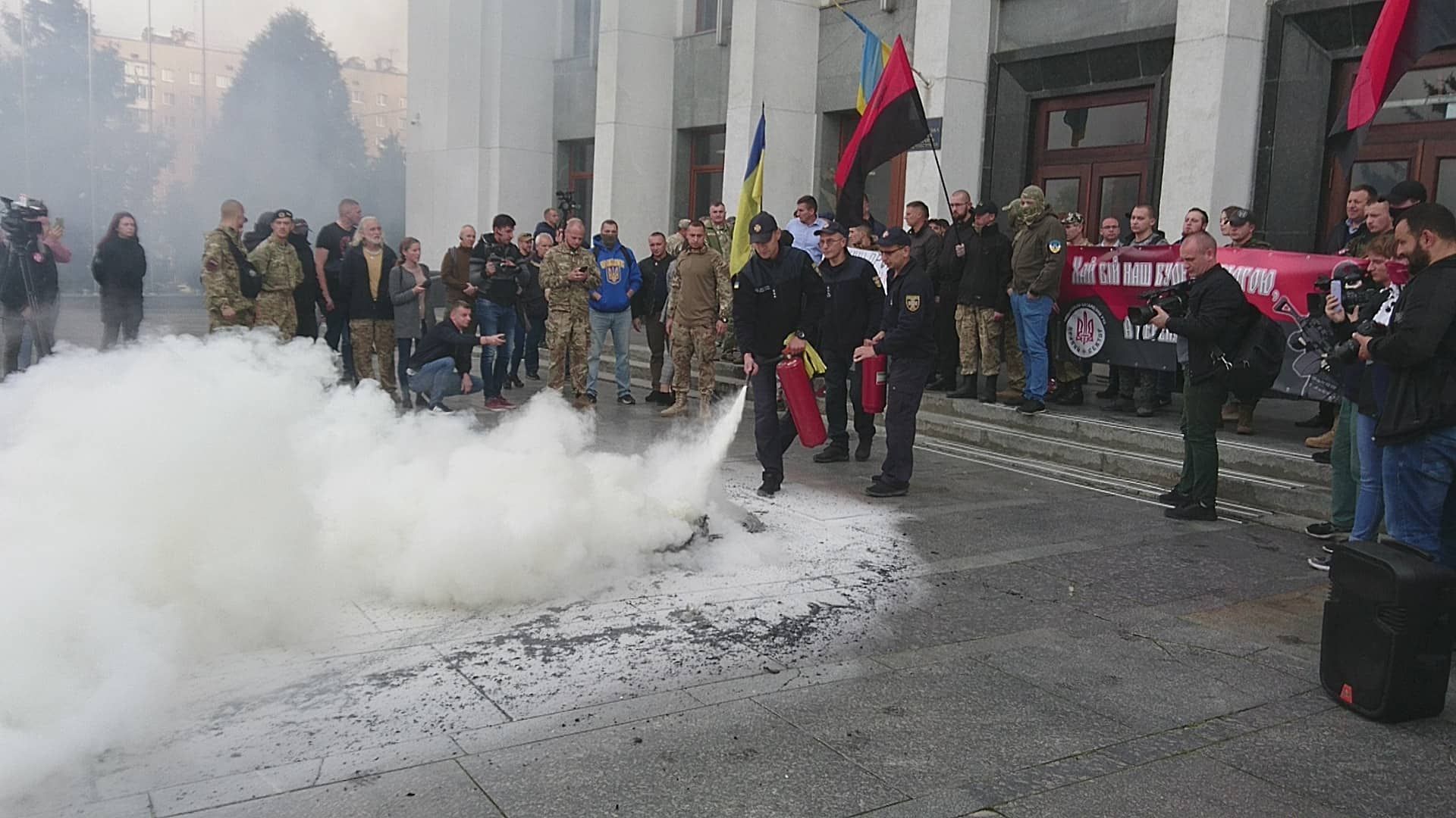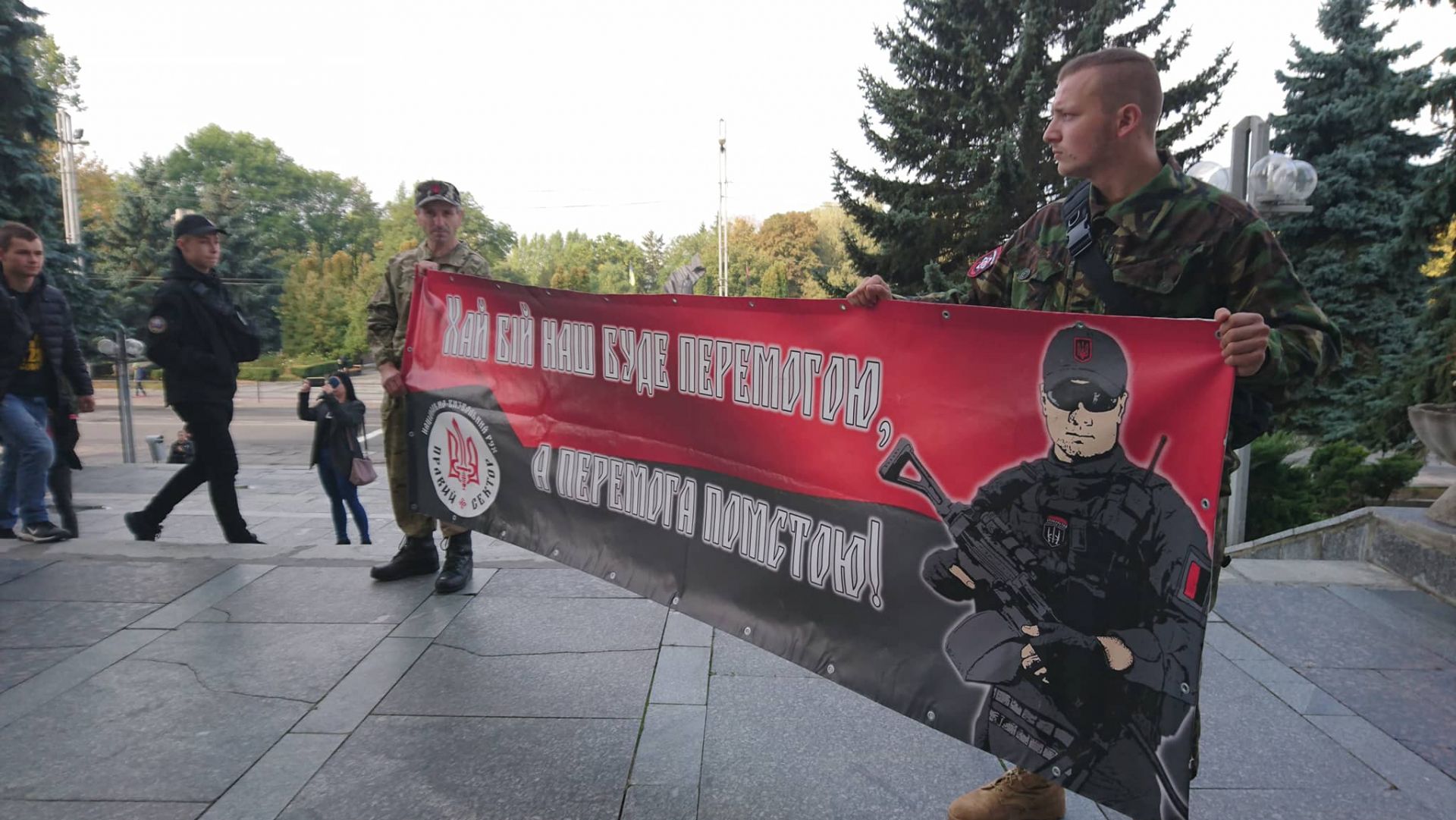 Вранці 26 вересня під стінами ОДА зібралися добровольці на акцію протесту. Людей було чимало: усі у формі, з прапорами та плакатами, на яких написані були вимоги.
