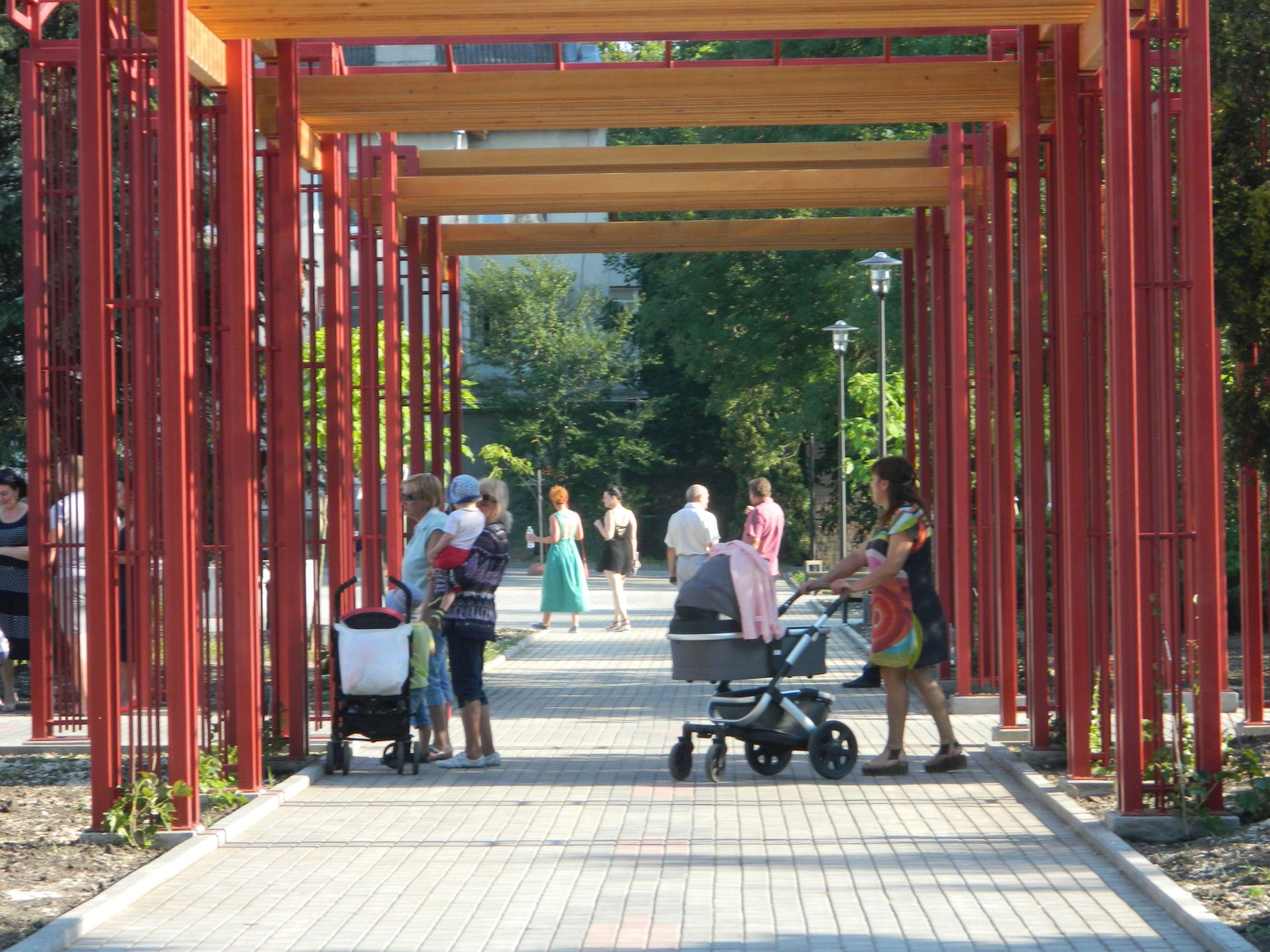 - Тут зроблені пішохідні доріжки, велосипедні, повністю освітлення, також оновили пам’ятник Бандері, він вже потребував реконструкції, - розповів журналістам міський голова Сергій Надал. - Висадили 26 катальп і також збільшили площу газонів на сто квадратних метрів. Тобто є ще один відкритий громадський простір у місті Тернополі. Ми врахували бажання старшого покоління і побажання молодих людей. І в результаті вийшов такий симбіоз: в дусі сучасних європейських таких стриманих ліній зроблено, але з використанням наших національних кольорів – червоно-чорного, візерунку. З’явилась пергола, яка має свій оригінальний вигляд. Посаджений поруч з перголою виноград, який буде досить так активно рости і створить місце для відпочинку.