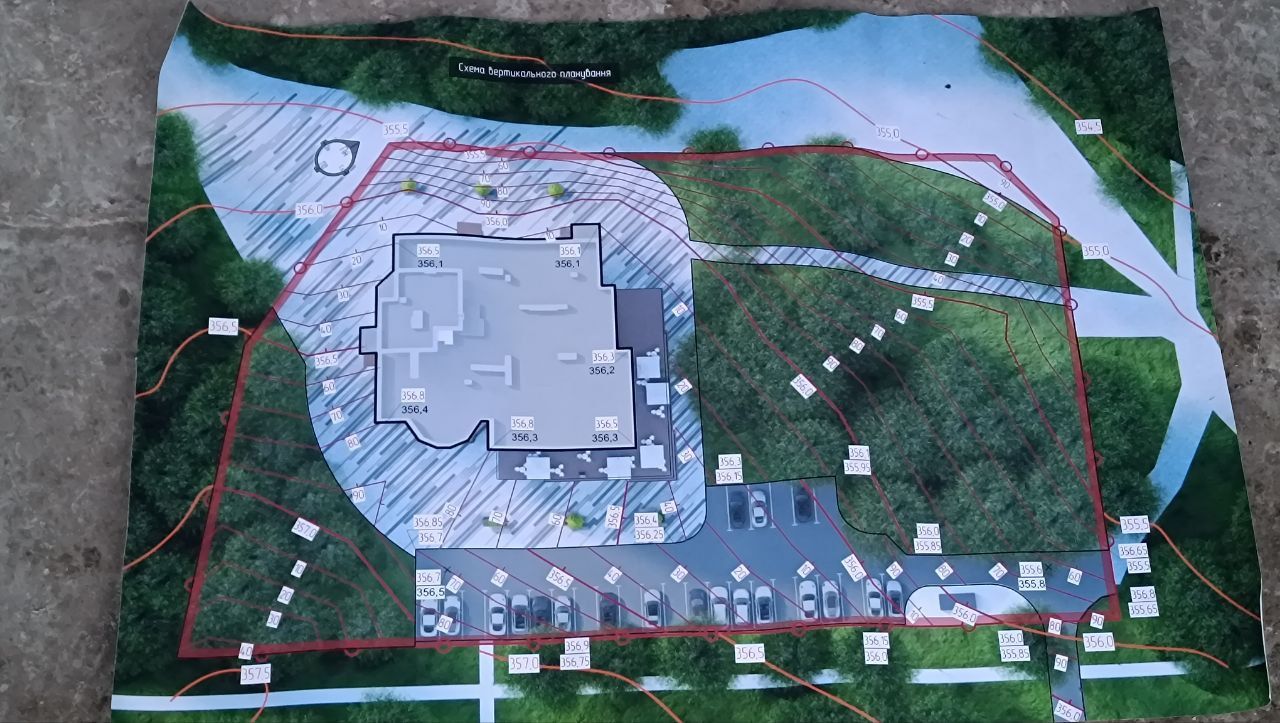 На місці робітники також показали плакат — візуалізацію того, як територія має виглядати після проведення робі. Тут є парковка, під яку вже розрили землю, доріжки навколо «академії», відпочинкова зона, де розміщені об’єкти, схожі на столики зі стільцями.
