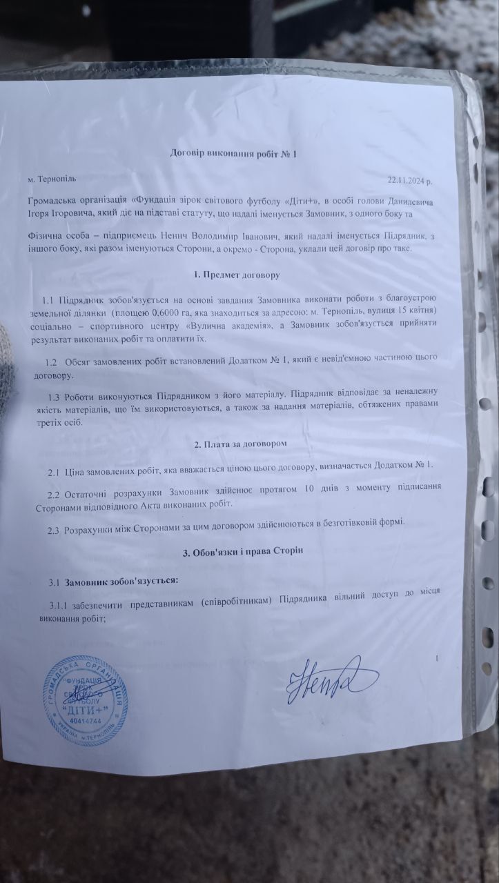 Проводять благоустрій та облаштовують парковку. Так пояснили розриту землю біля «Вуличної академії» журналісту «20 хвилин» робочі. На запит надали контакти підрядника і замовника робіт, а також договір. Відповідно до документу, ФОП Володимир Ненич, тобто підрядник, за завданням замовника — це громадська організація «Фундація зірок світового футболу «Діти+» в особі голови Ігоря Данилевича, проводять благоустрій ділянки.
