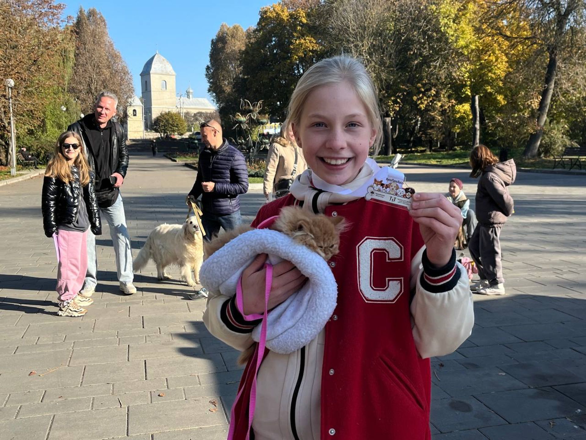 Тернополянка Катерина вперше завітала на забіг тварин. Дівчинка каже, її кішці Йоді лише три місяці, але вона спокійно себе поводить, бо довіряє своїй господині.