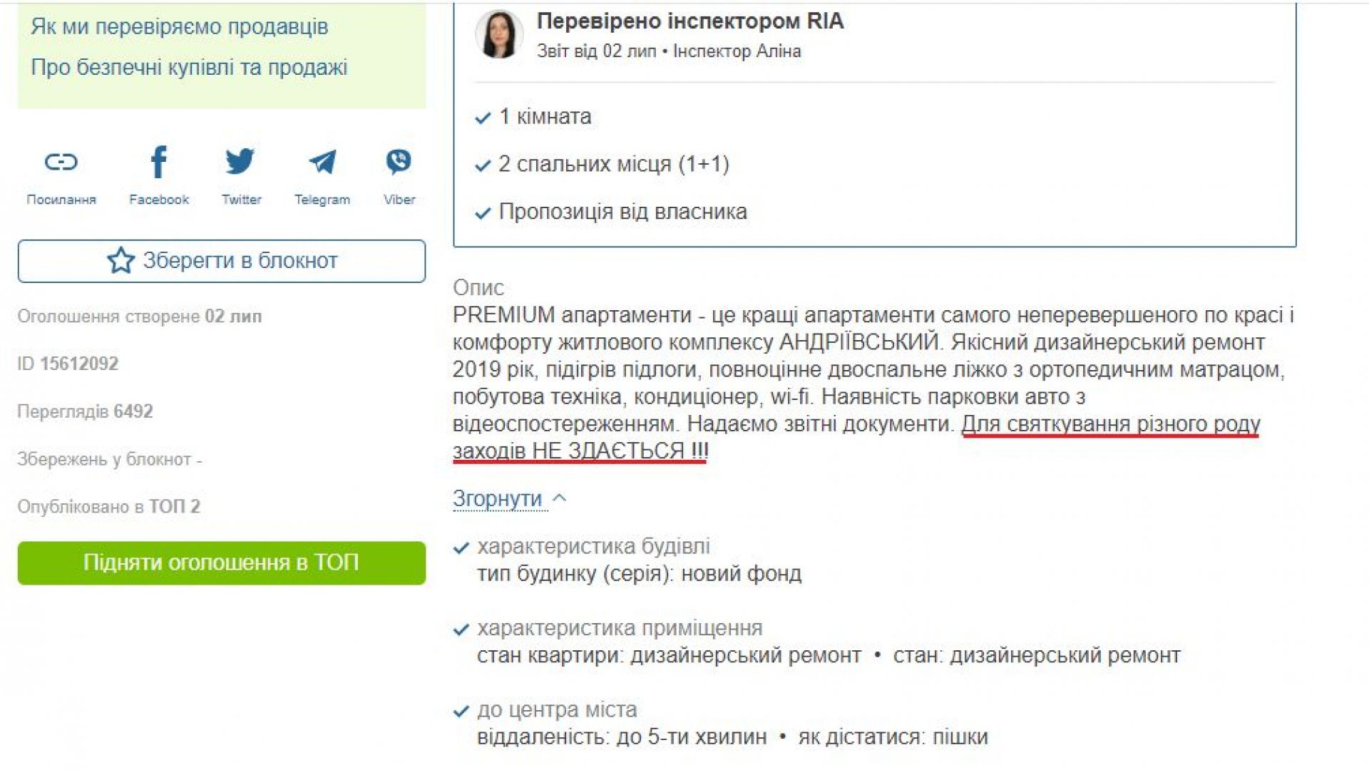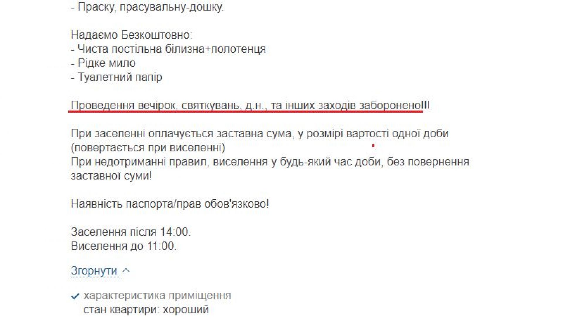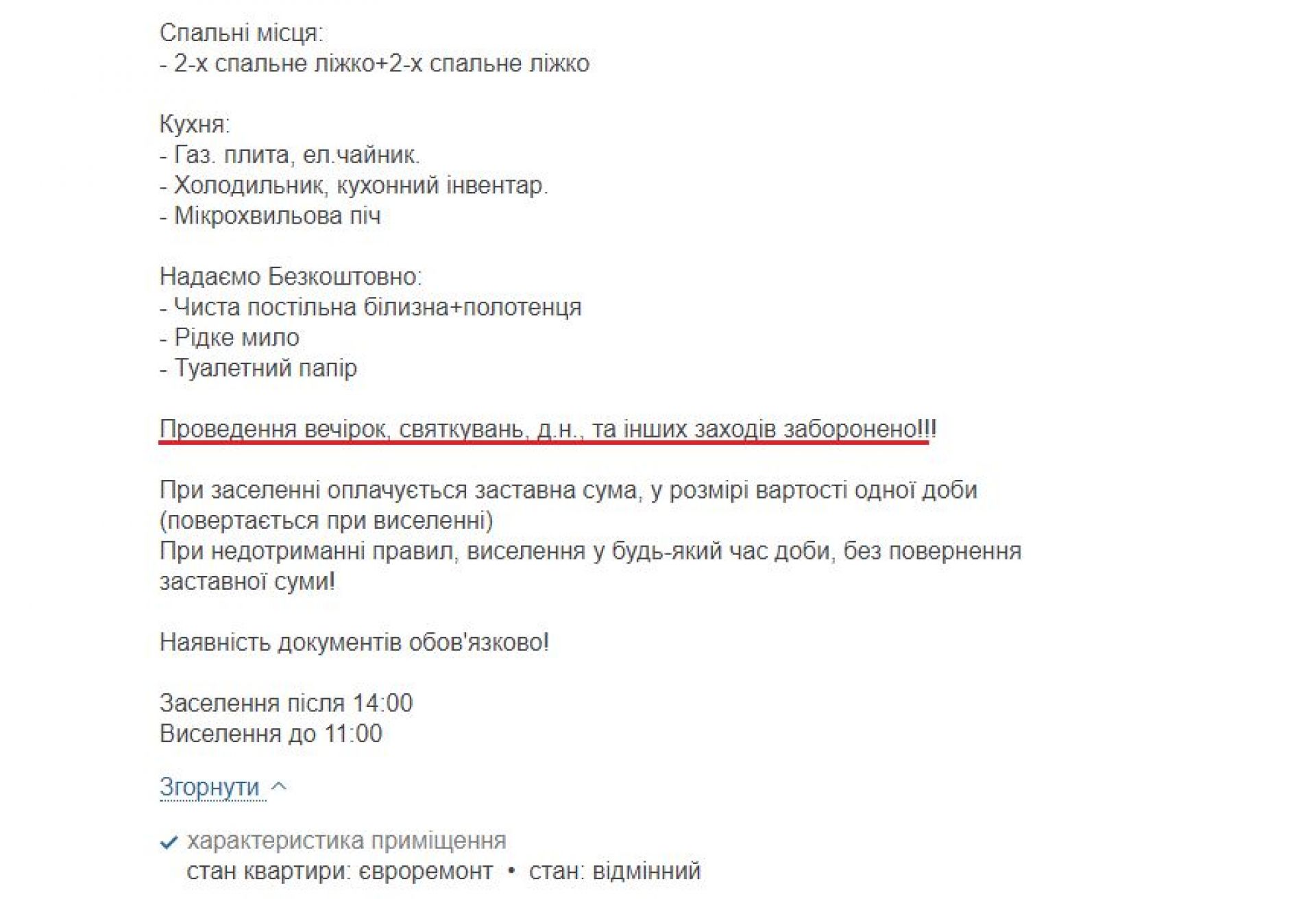 Дехто шукає квартири чи будинки на Новий рік у місті. Однак з цим значно важче. Багато власників відмовляються здавати подобово квартири для святкування різних заходів. Про це зразу вказують у оголошеннях, що квартиру здають лише для проживання, а різні святкування заборонені.