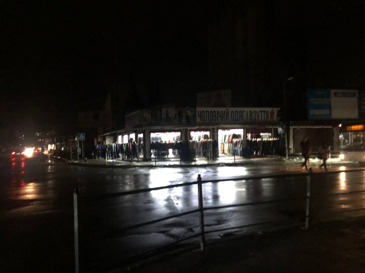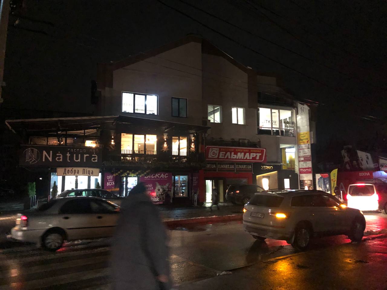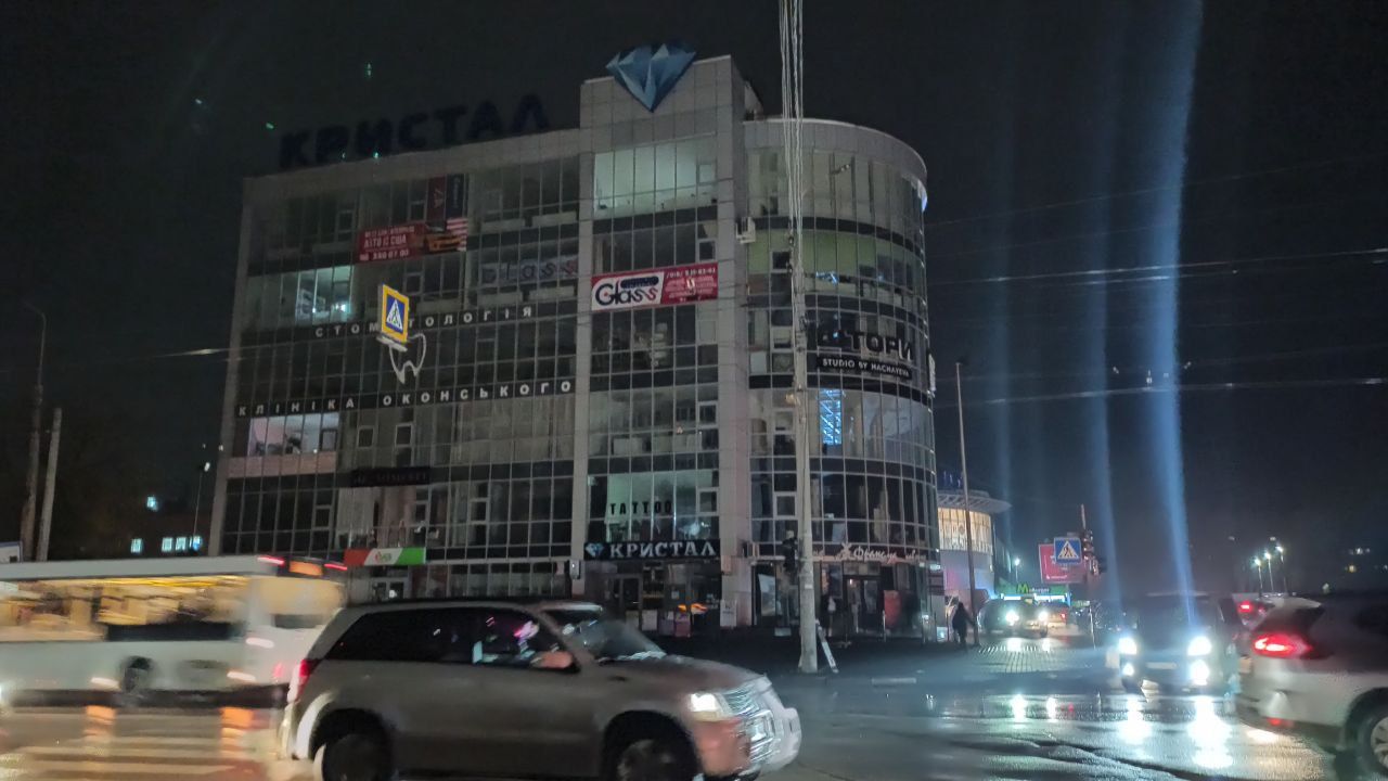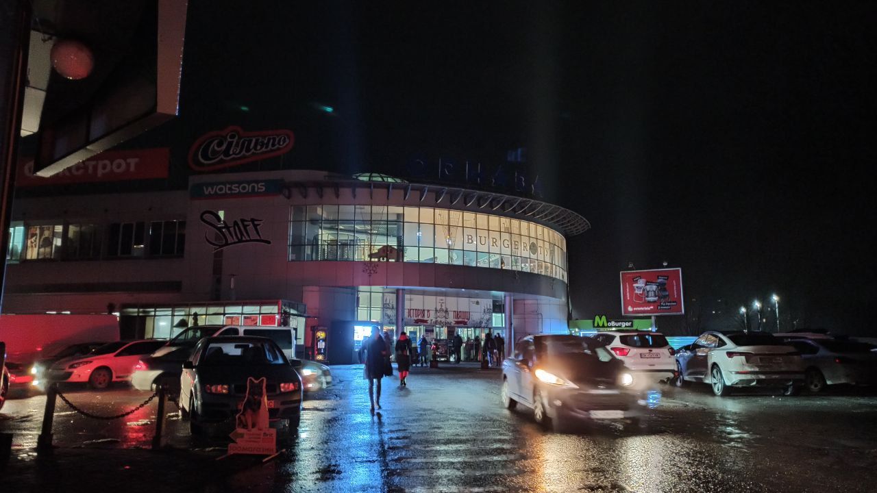 Не освітлюється і торговий центр «Кристал». Вже з торгового центру «Орнава» видніється світло, єдине – у продуктовому магазині трохи зменшили освітлення. Зокрема, вимкнули освітлення над холодильними камерами.
