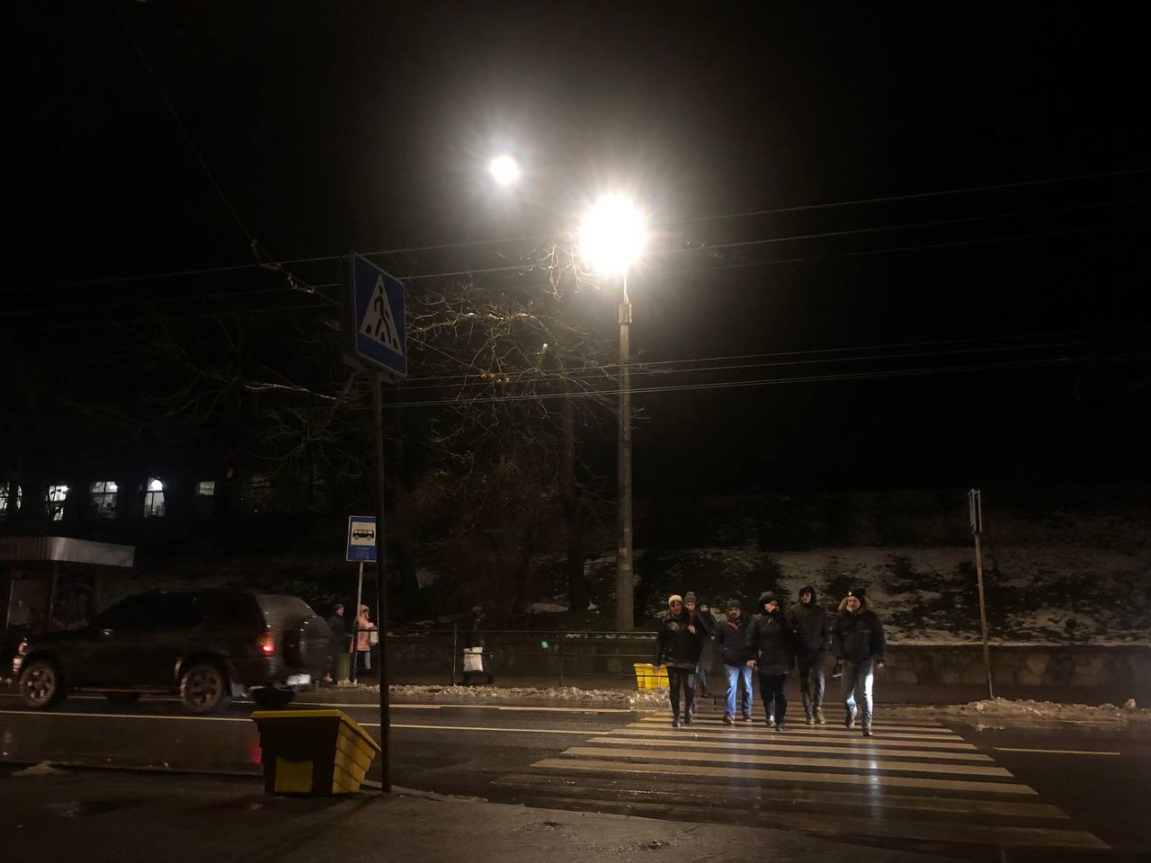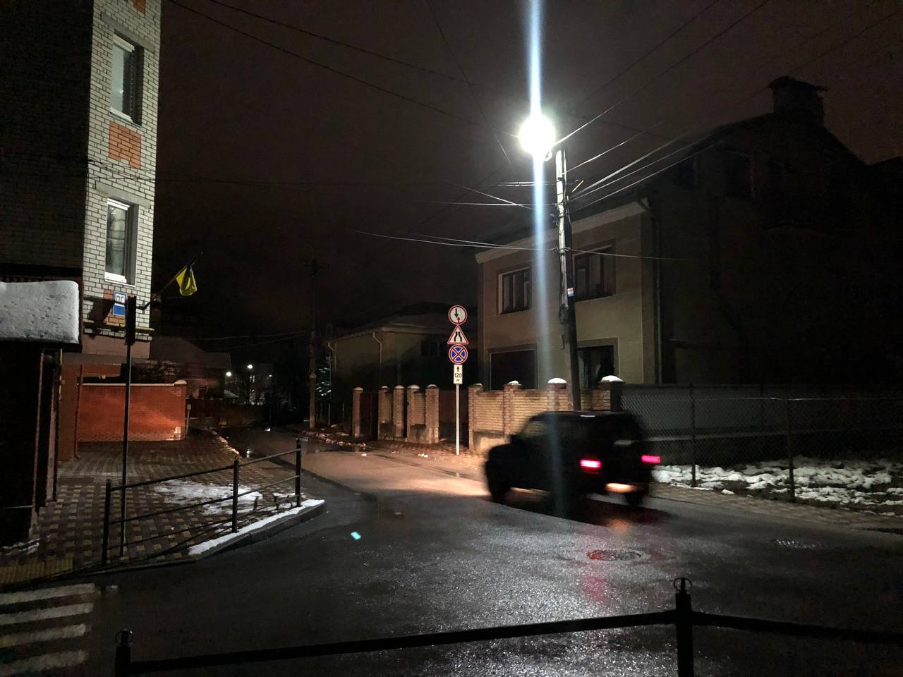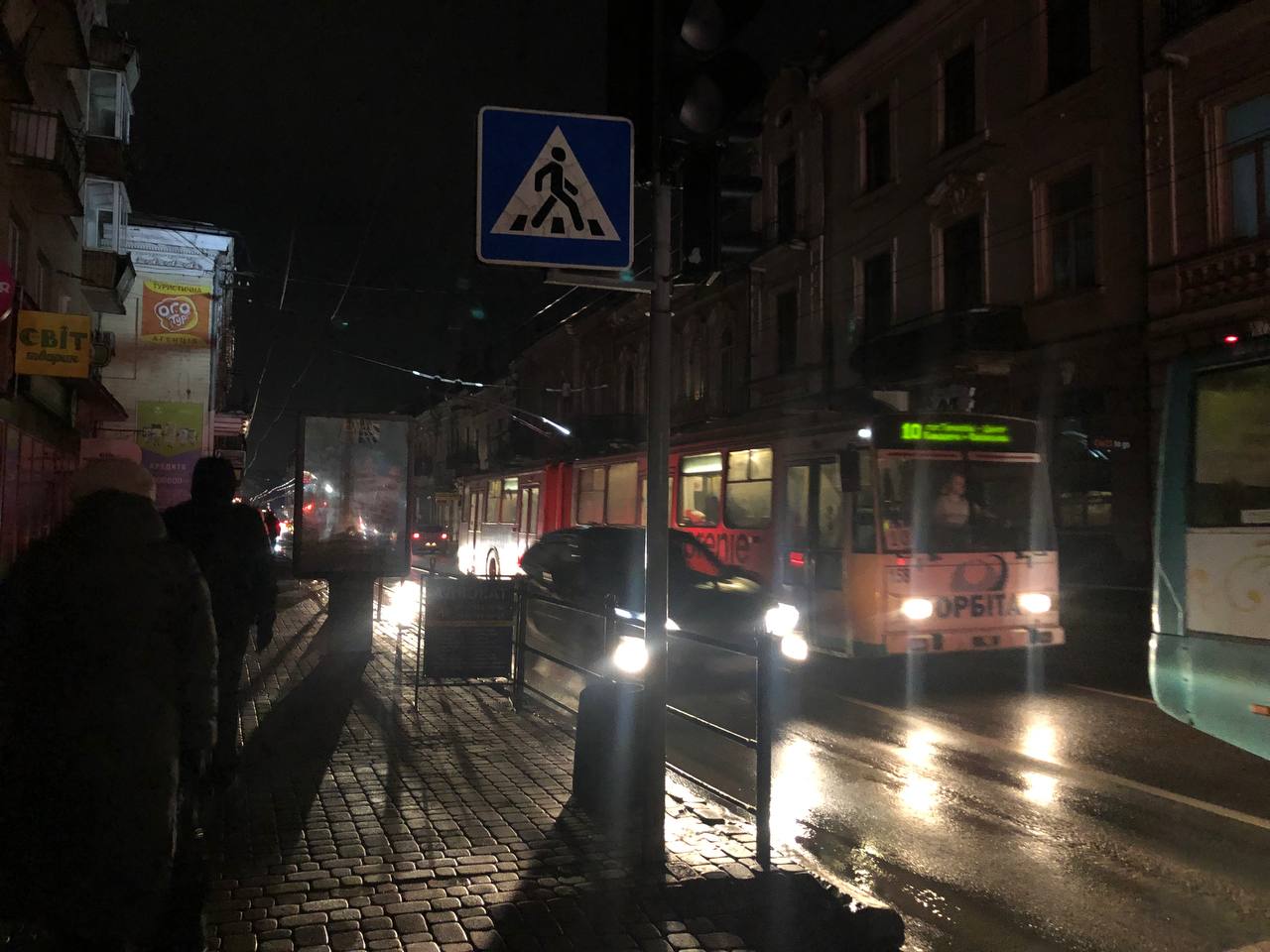 А ось по вулиці Князя Острозького майже всі ліхтарі працюють, хоча у квартирах темно. На пішохідних переходах увімкнені навіть по два ліхтарика.