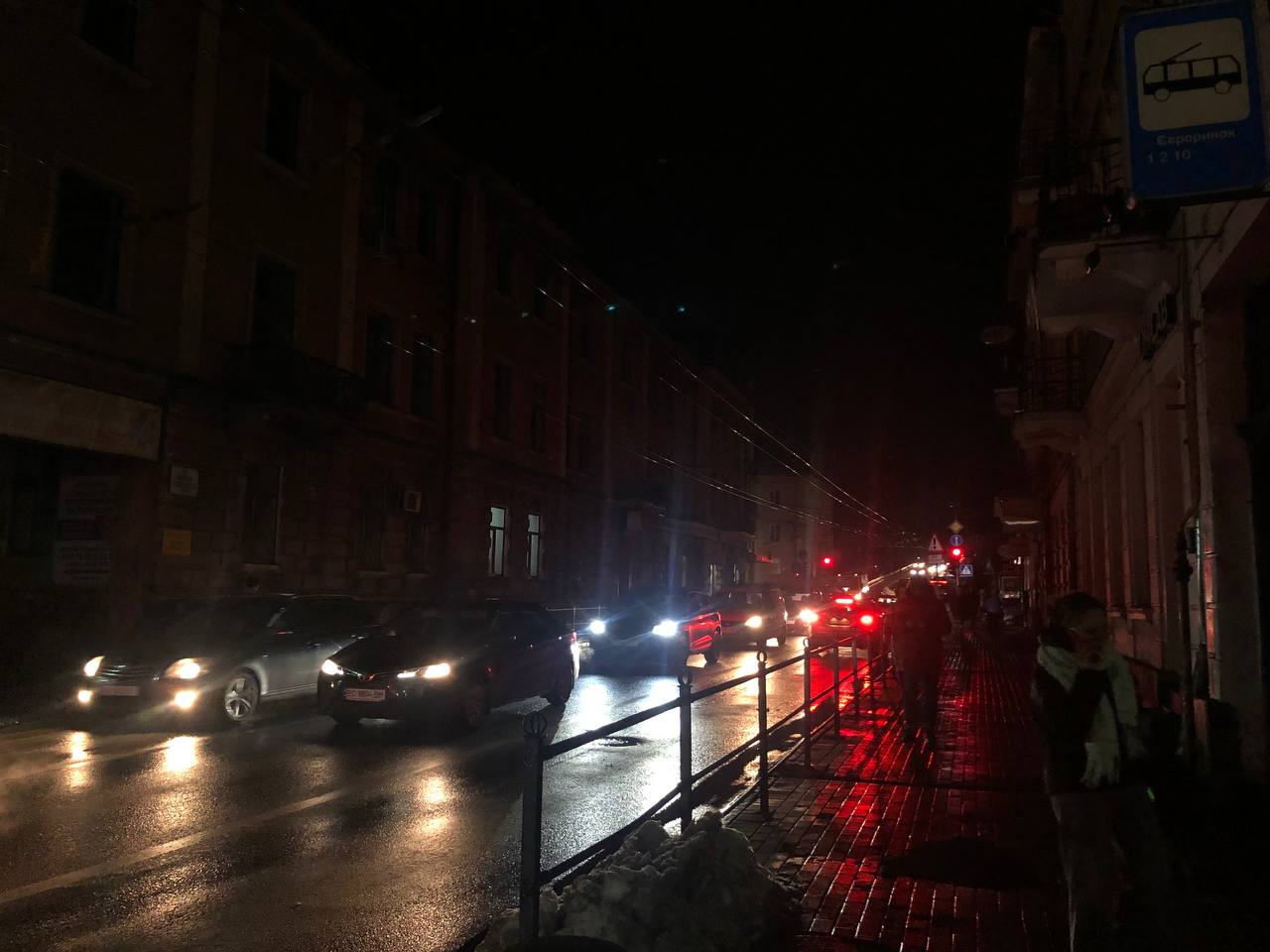 Майже вся центральна частина Тернополя у повній темряві. Лише трохи вулиці підсвічують фари автомобілів, світлофори та ліхтарики, що несуть у руках люди. Частина вулиці Руська (від вулиці Богдана Хмельницького і до Центрального універмагу) більш-менш освітлена. Світяться вітрини аптек та магазинів, трохи працюють вуличні ліхтарі, але через один. Бульвар Шевченка також без освітлення. Єдиний ліхтар, що працює, помітили на Театральній площі.