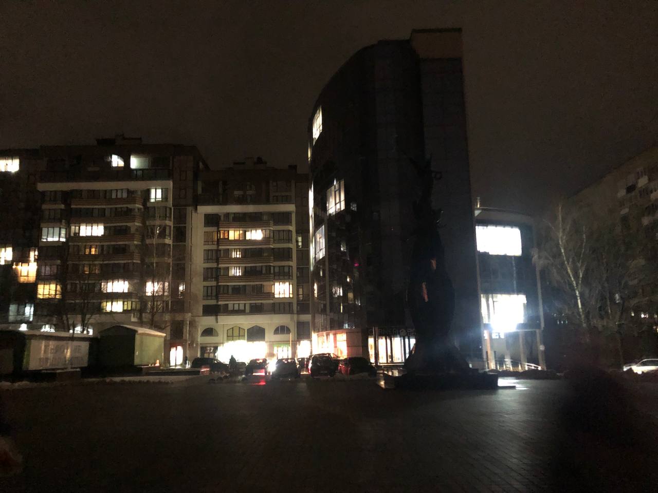 На площі Героїв Євромайдану ситуація аналогічна. У багатоповерхівках світяться один-два вікна. А ось магазини працюють від генераторів. Це можна зрозуміти від звуків, що видає техніка.