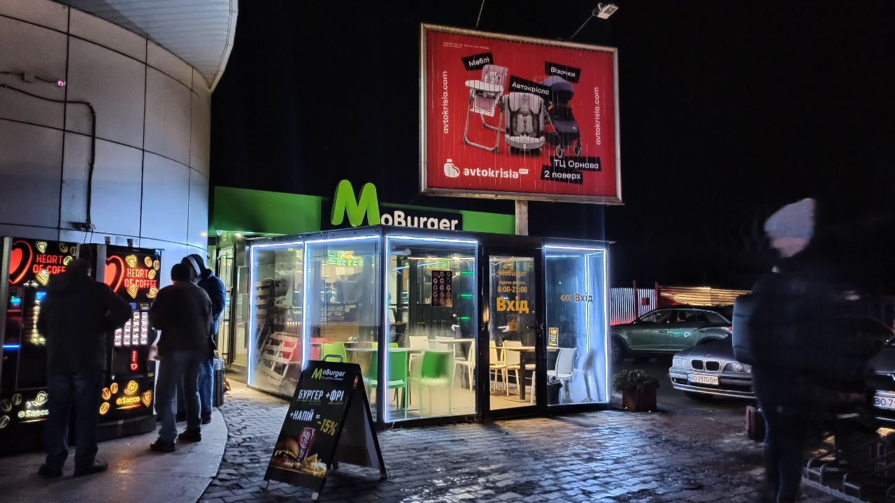 А ось біля «Орнави» одразу в очі кидається невеликий заклад харчування «Мобургер». Він не просто світиться, а ще й прикрашений ілюмінаціями.