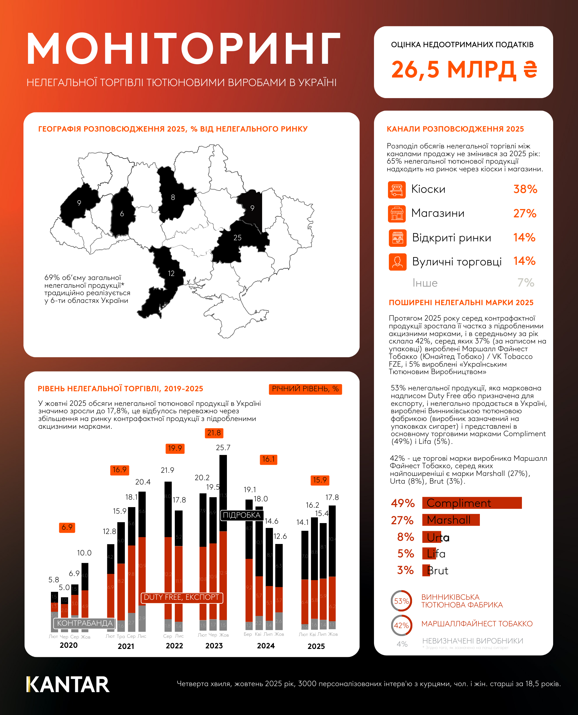 Близько 10,5% від загального обсягу ринку складає контрафакт, 6,2% – продукція без акцизних марок, маркована для експорту або для продажу в магазинах DutyFree, 1,1% – продукція, ідентифікована агенцією як контрабандна.