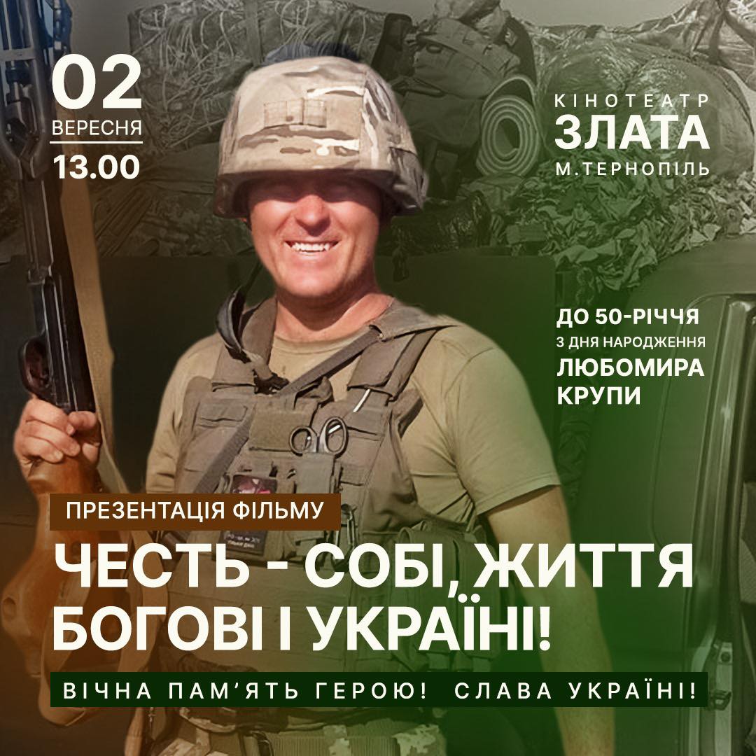 — Запрошуємо вшанувати пам'ять про Любомира Крупу та взяти участь в презентації фільму про Героя, —йдеться в повідомленні.