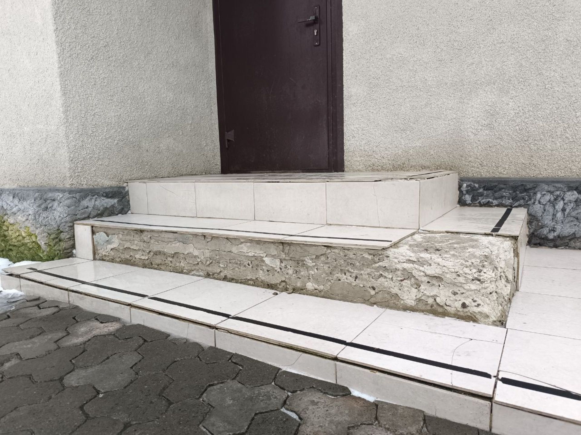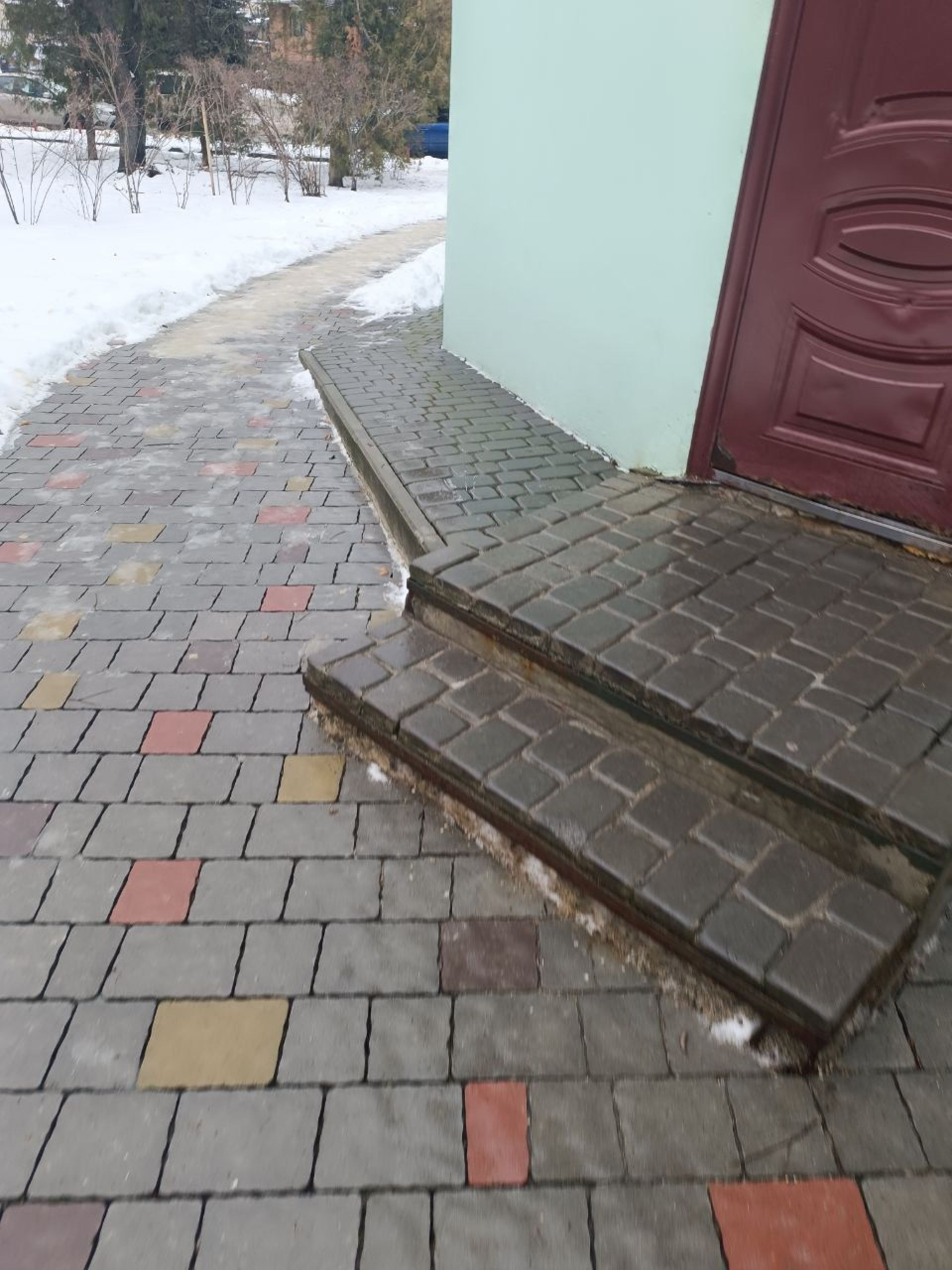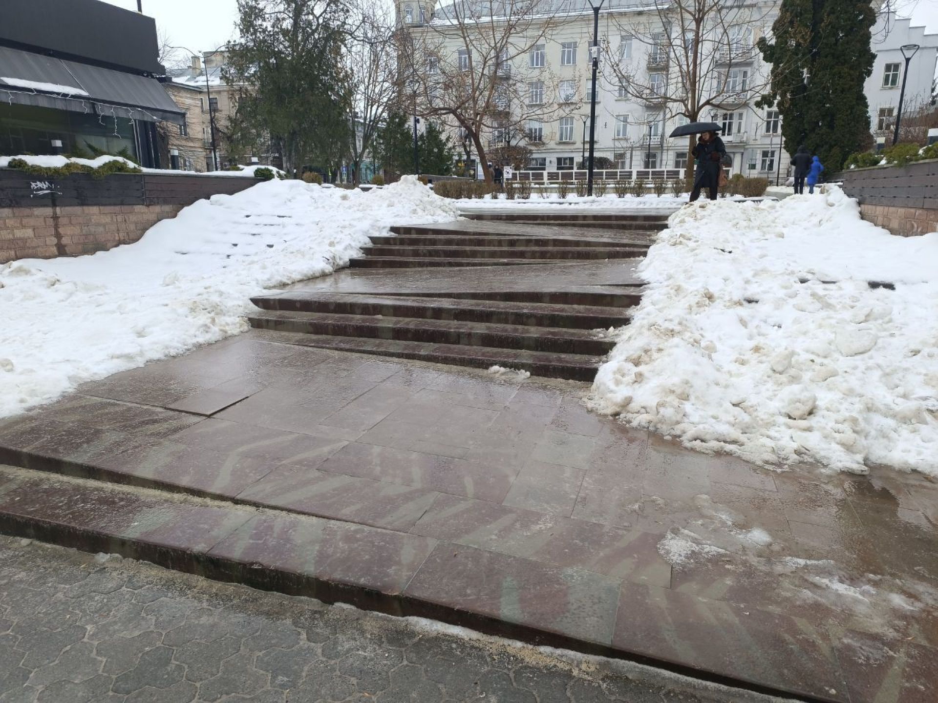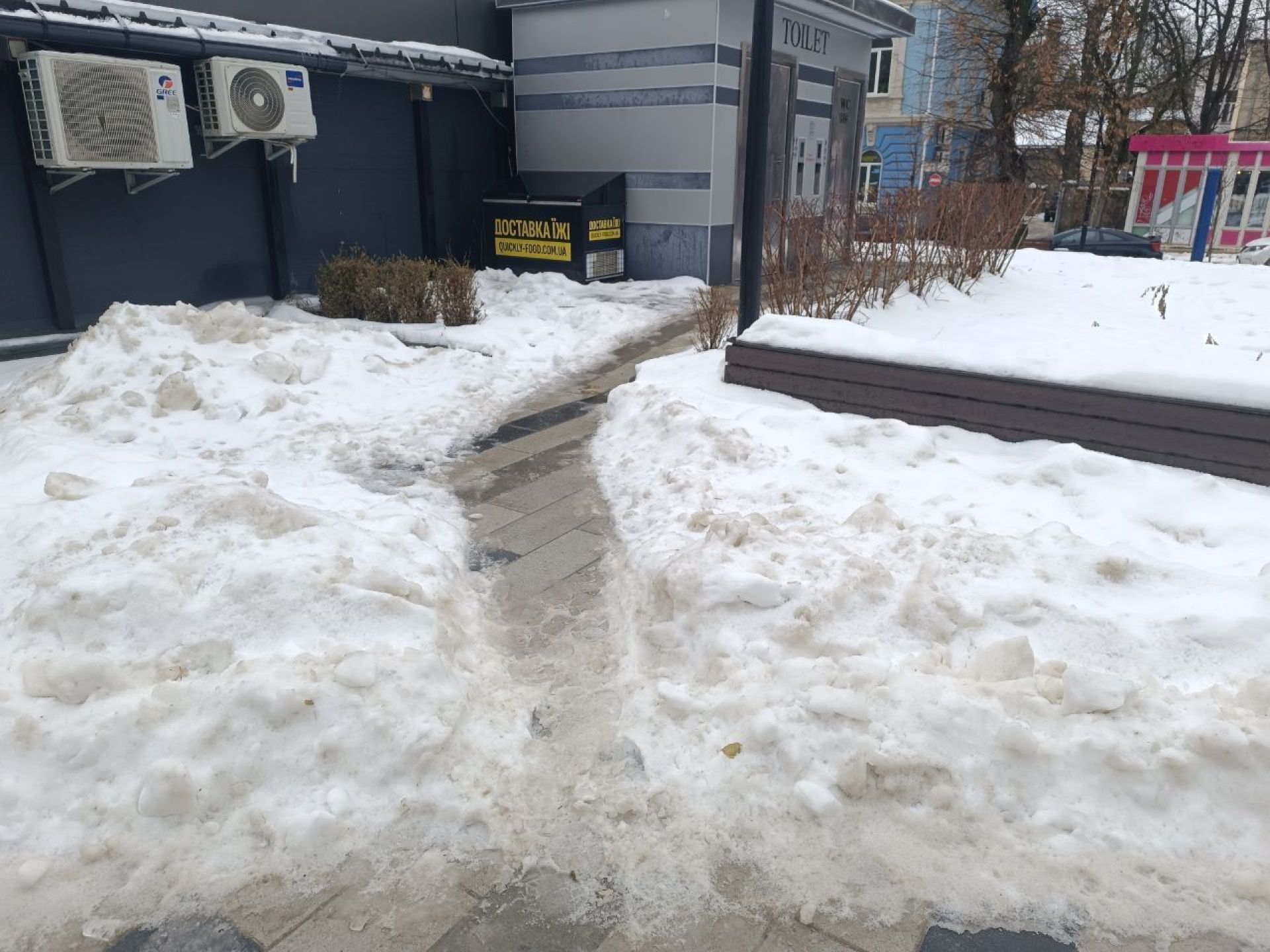 Схожий туалет є і у центрі міста біля фонтану «Кульбаба». Щоб скористатися ним людині на інвалідному візку треба об’їжджати сходи зі сторони вулиці Івана Франка. Сходи-пандус, розчистили від снігу лише по центру, тому пандусом скористатися не можна. Також біля самої вбиральні прочищена вузька стежка.