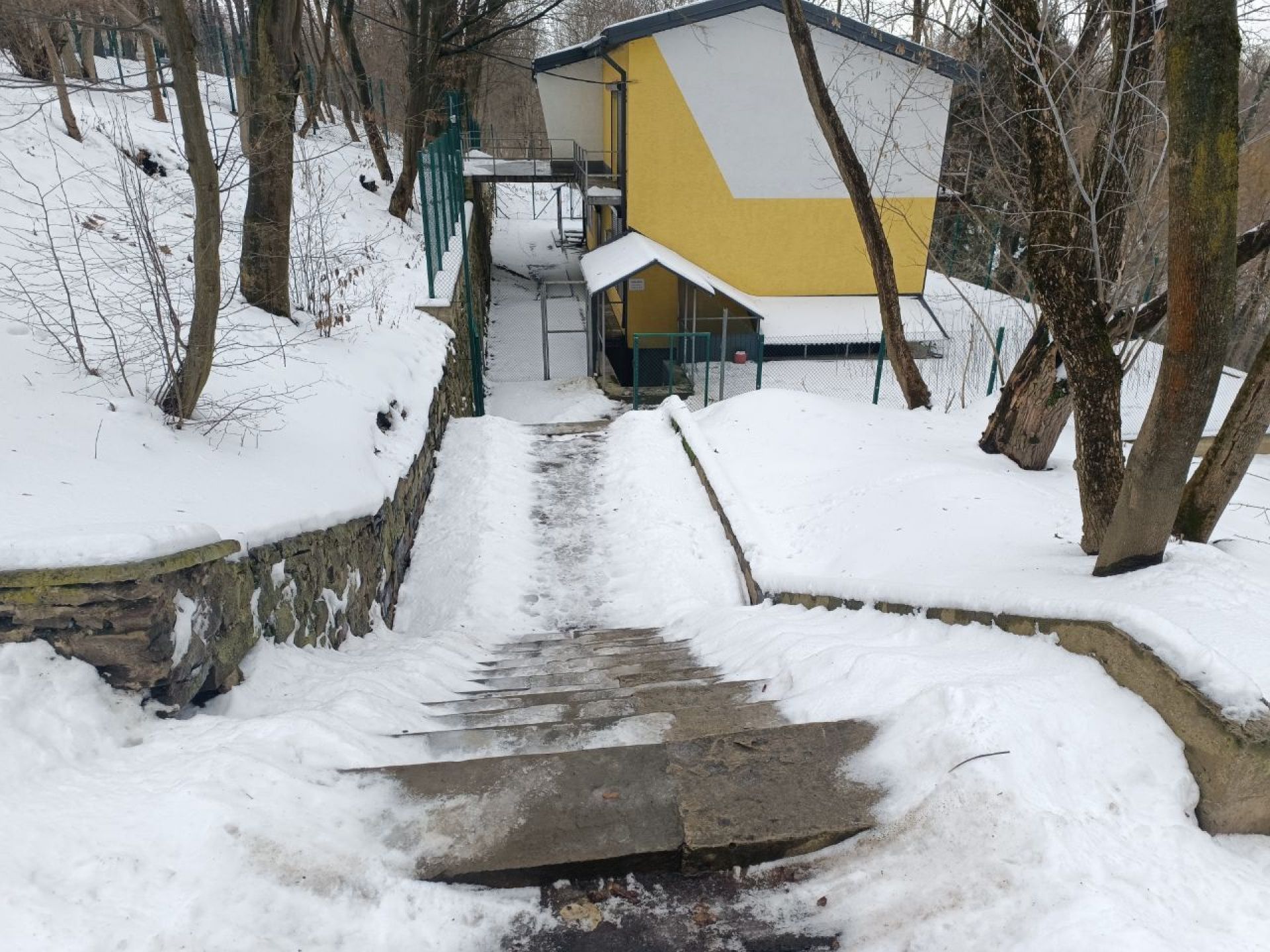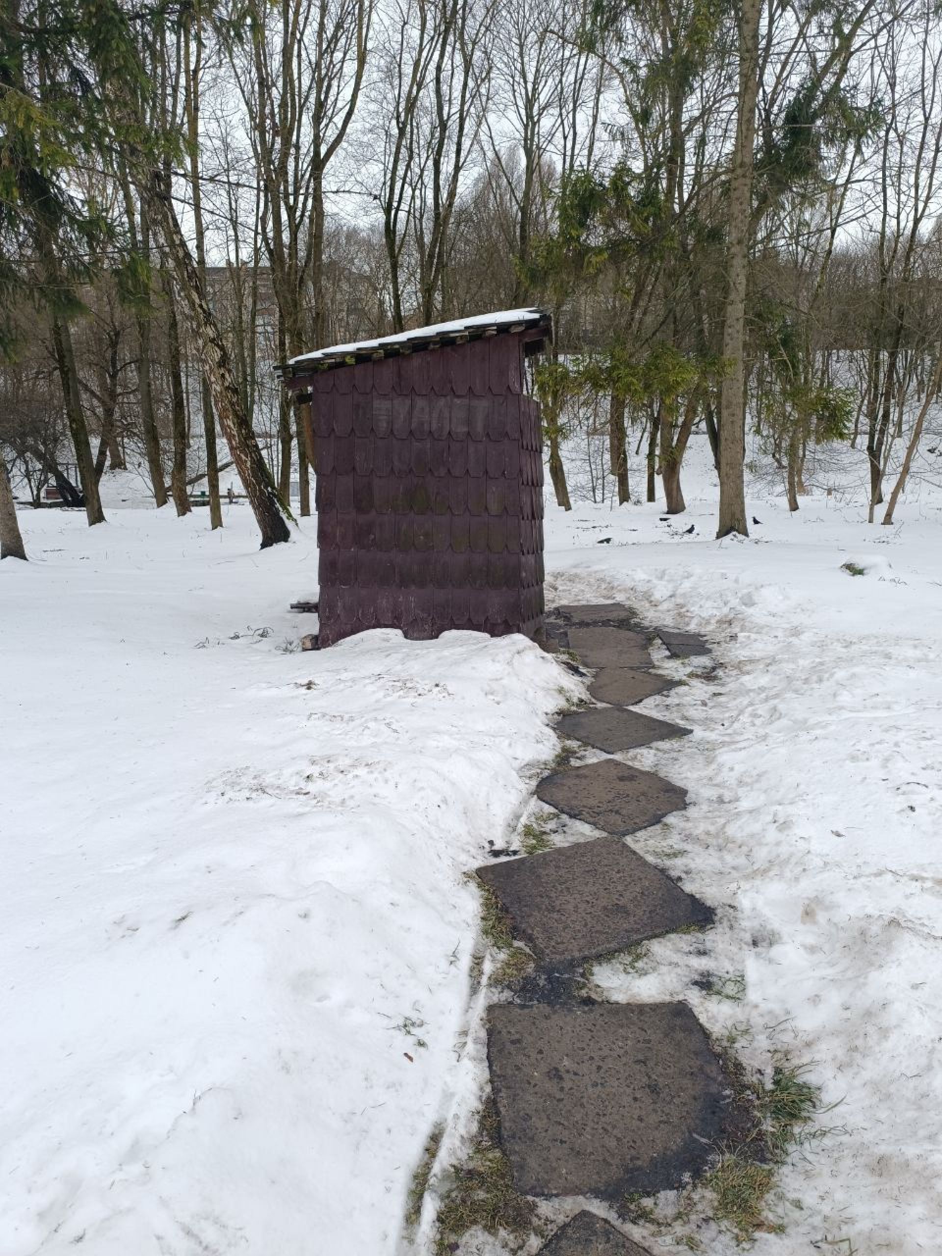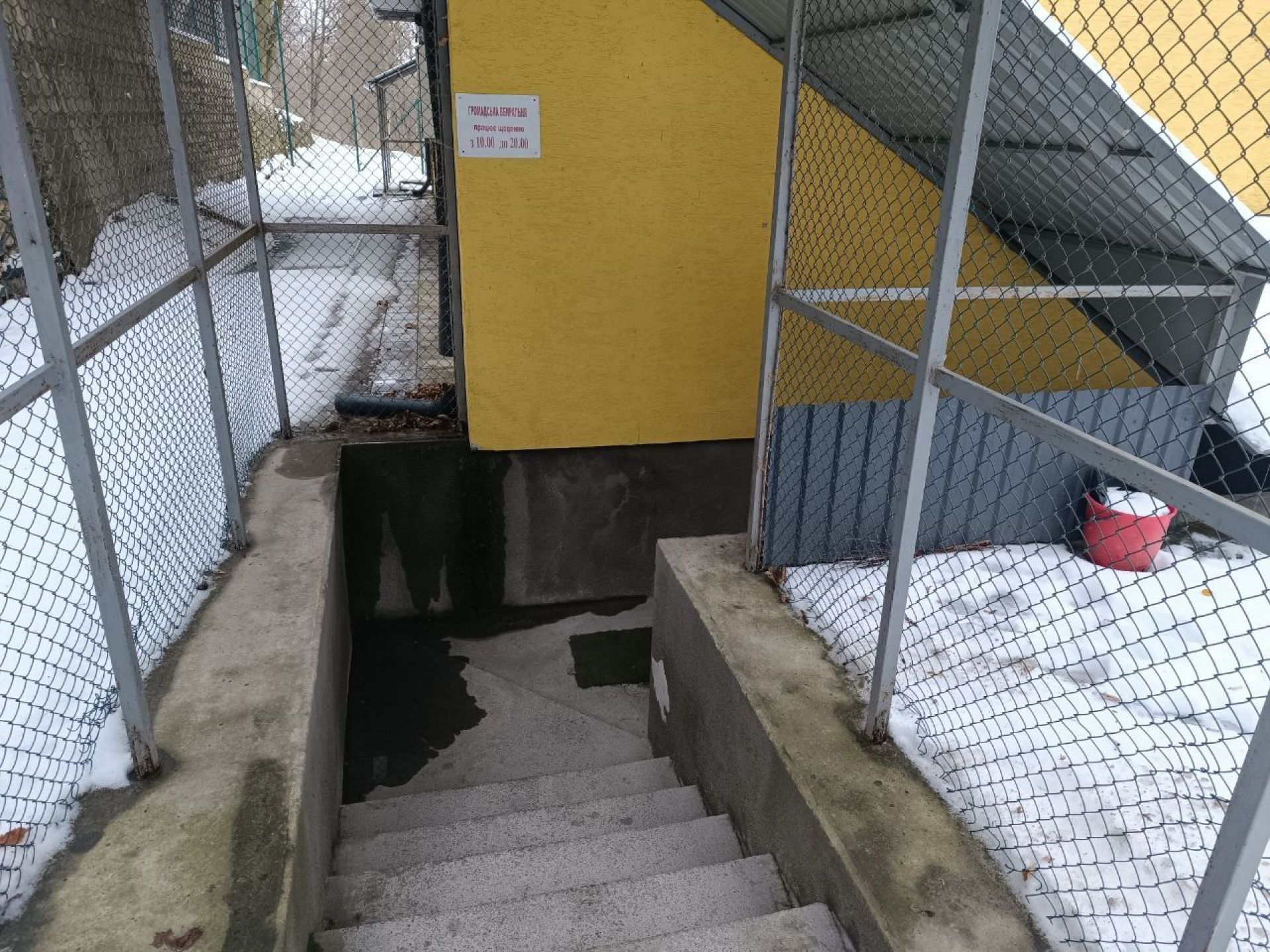 Туалети у парку Національного відродження також не пристосовані для людей з інвалідністю. Вони розташовані у підвальних приміщеннях, тож щоб скористатися – треба спуститися сходами. Біля дверей ми побачили оголошення з проханням зачиняти двері, щоб через мороз не замерзла вода в трубах.
