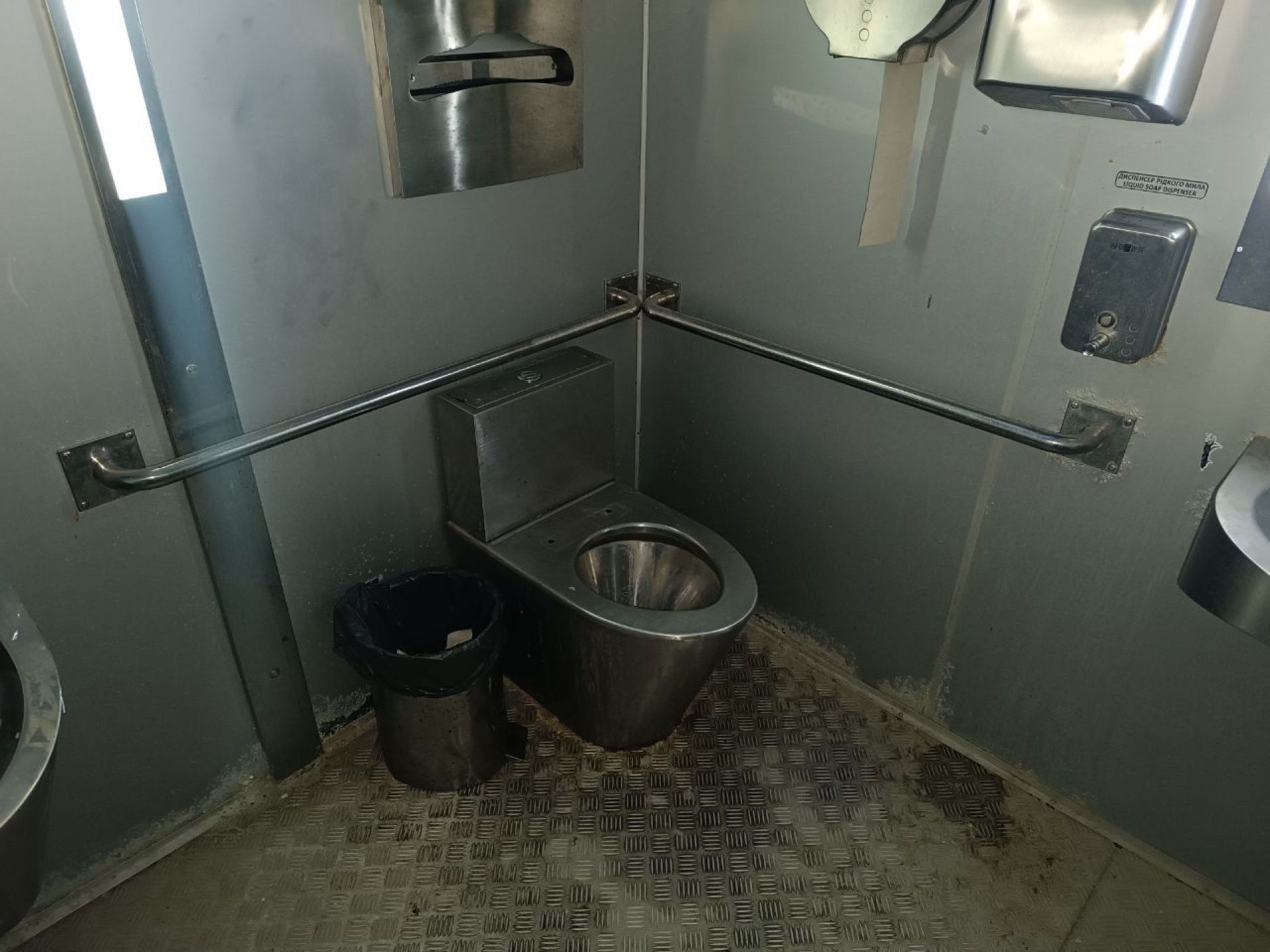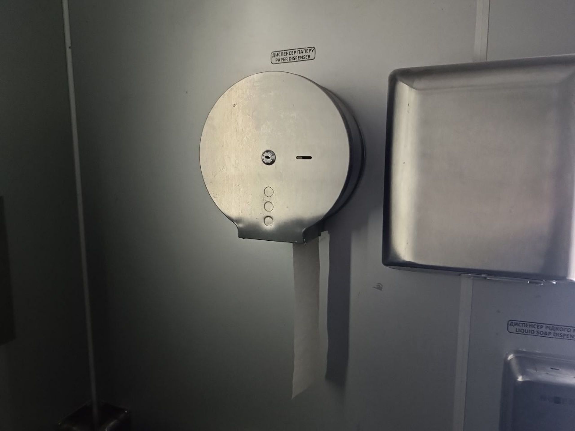 Туалет був без сидіння. Біля нього – два спеціальні поручні. Однак кнопок виклику допомоги не було. Всередині є вода, мило, туалетний папір та навіть антисептик. Також є пеленальний столик. Всередині було чисто. Неприємного запаху ми не відчули.