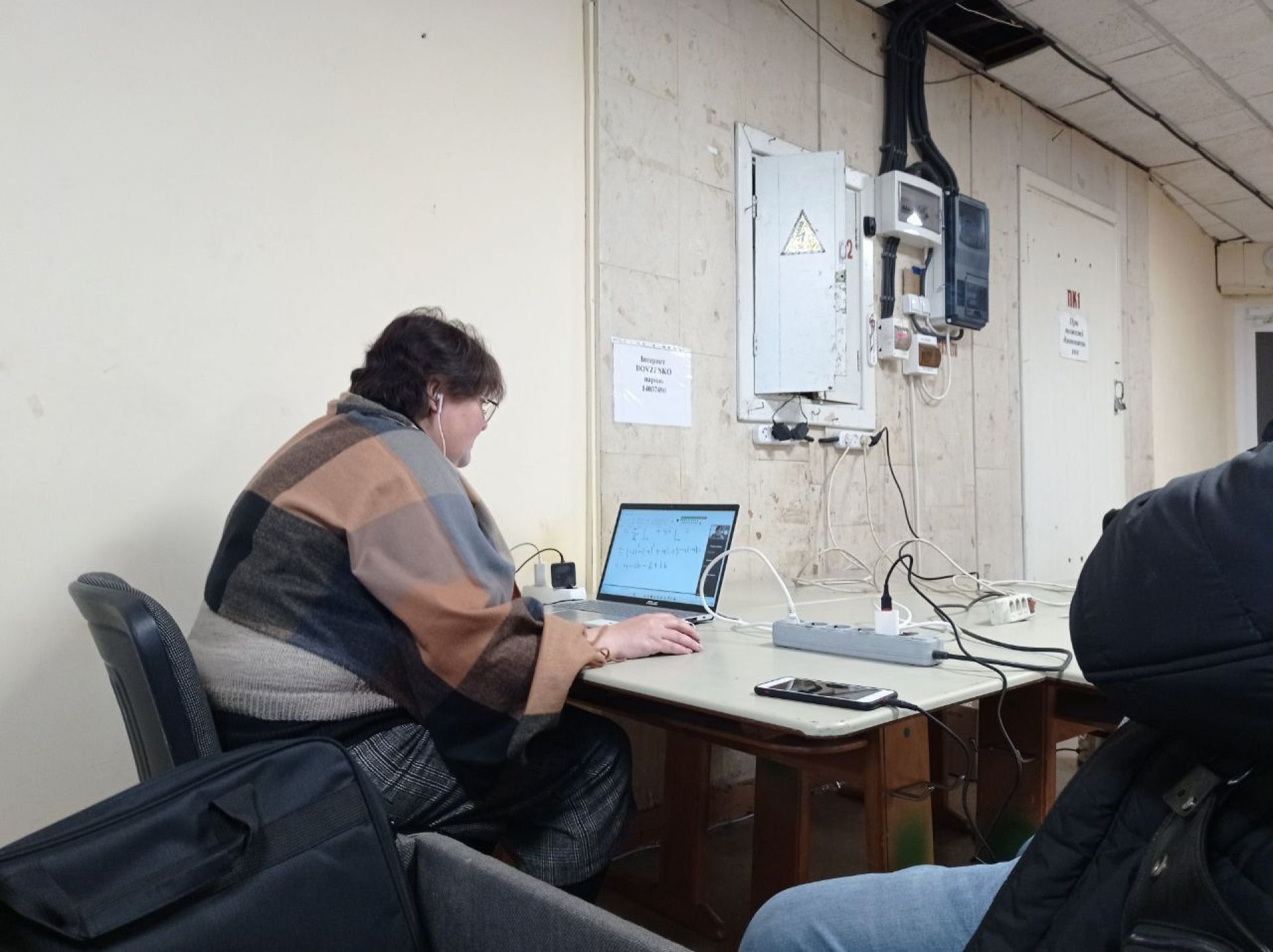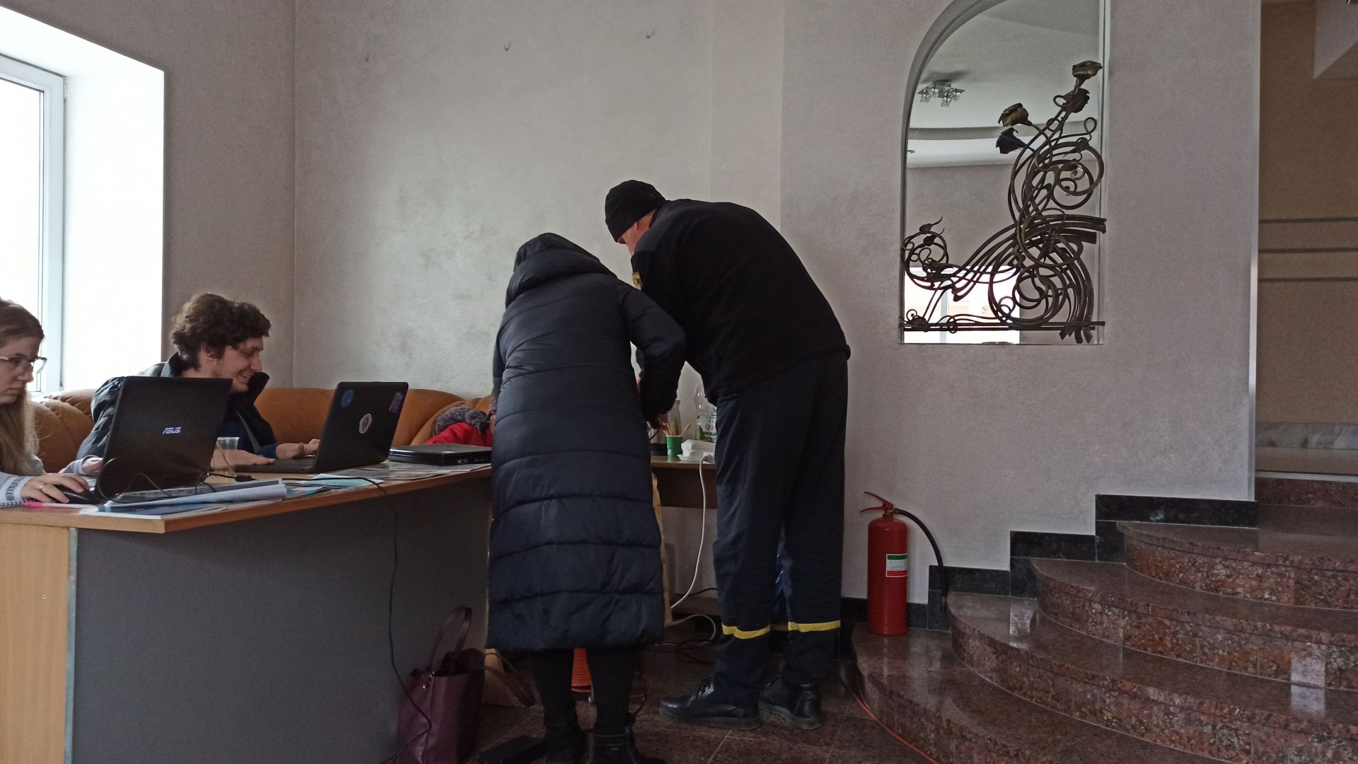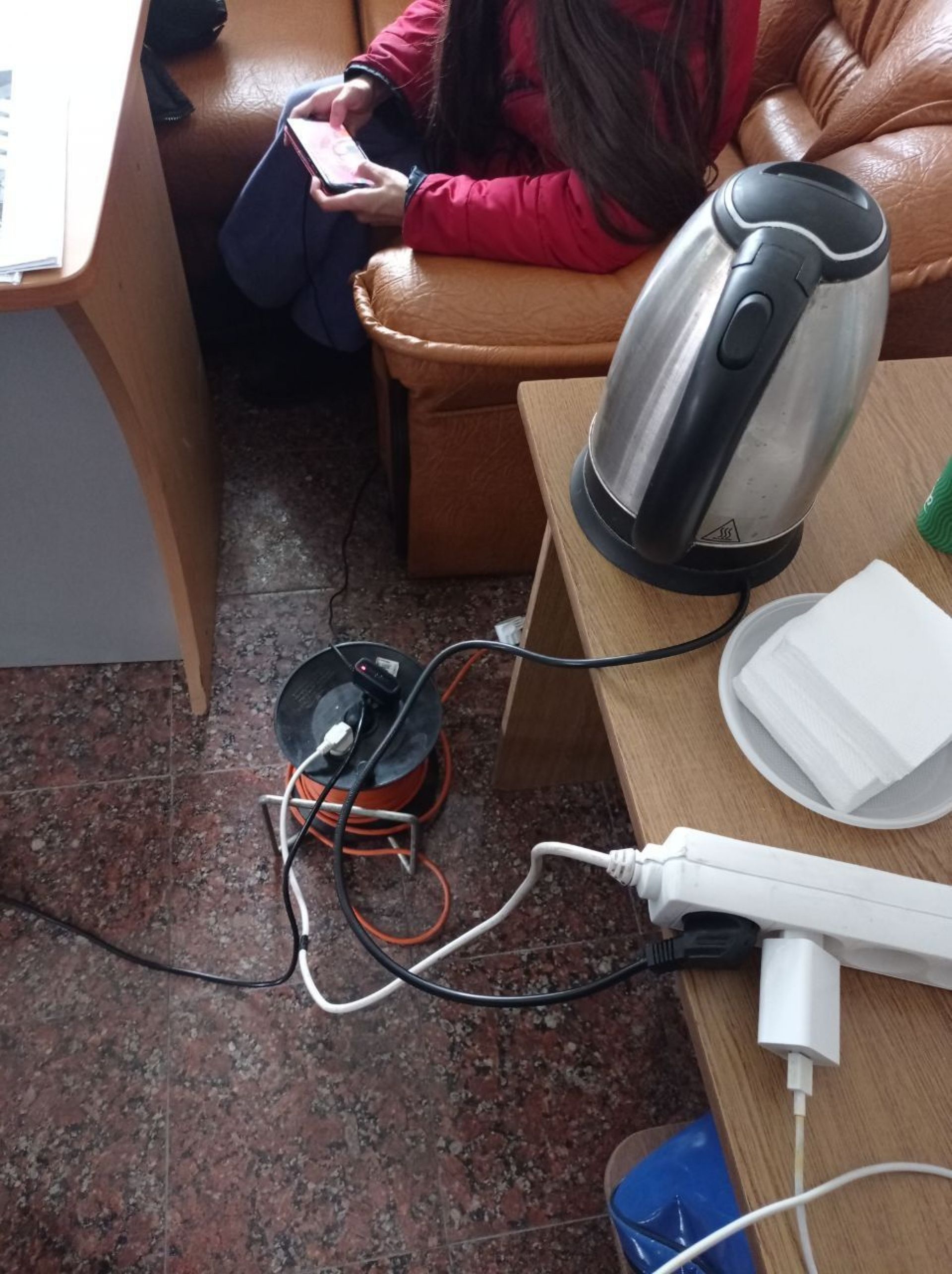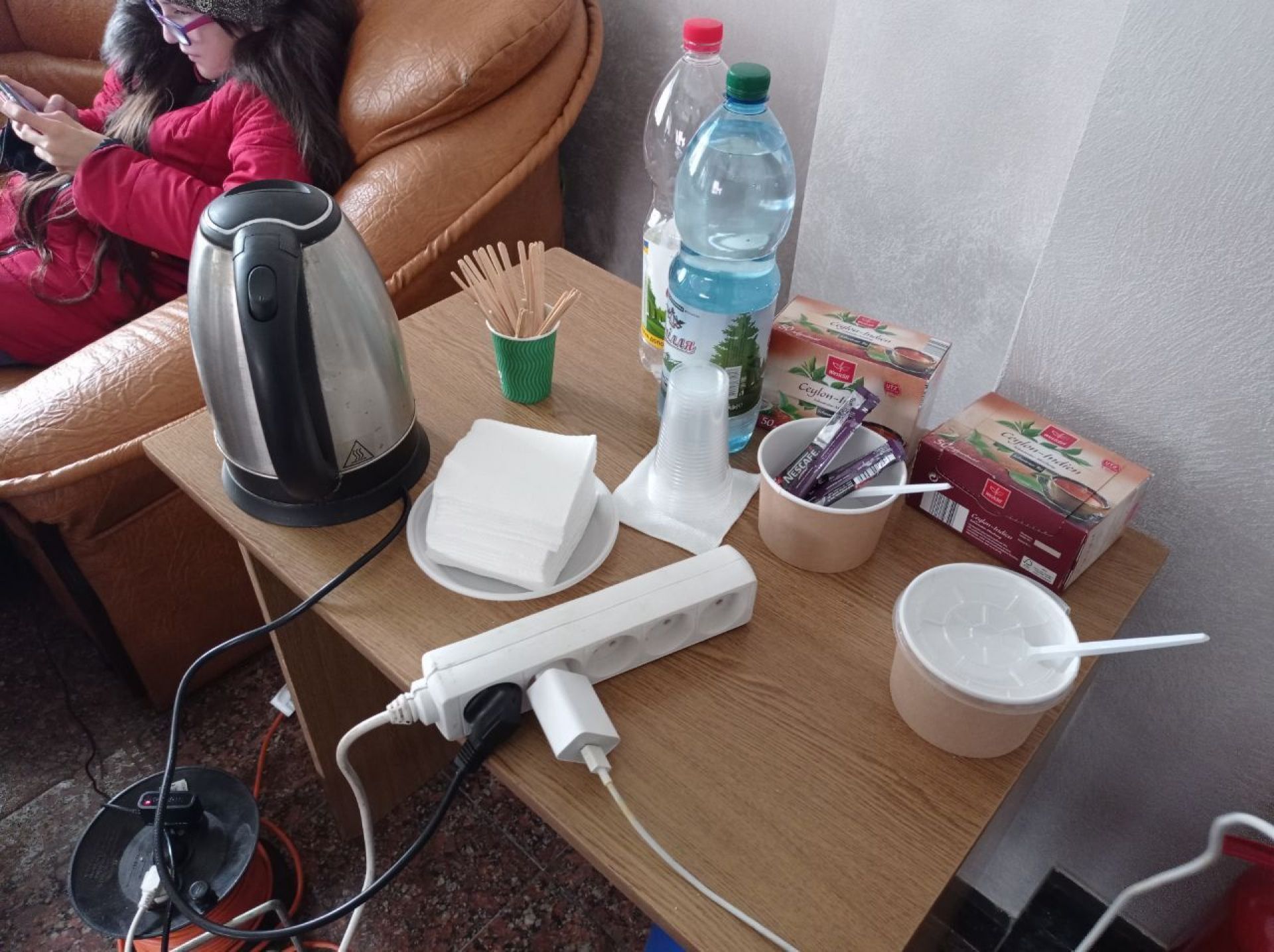 На невеликому столику під стіною були чайник, вода, чай та кава, серветки, пластикові стаканчики. Ми поставили телефон на підзарядку. Допоки перебували у пункті, сюди прийшла ще одна жінка попрацювати й запитала, чи може підключити до мережі смартфон і ноутбук. Облаштуватись їй допоміг черговий рятувальник. Чоловік періодично підходив до людей, цікавився, чи їм комфортно, чи нічого не потребують, пропонував зробити гарячий напій. Містяни, які прийшли сюди раніше, підказали нам пароль від Wi-Fi. Ми перевірили - інтернет з хорошою швидкістю. Але загалом приміщення цього пункту обігріву доволі мале. Тут всього один стіл, та не так багато місць для сидіння. То якщо сюди прийде багато людей - буде затісно. Крім того, зосередитись на роботі буде важко, оскільки тут прохідна – через коридор ходять рятувальники та інші працівники управління.