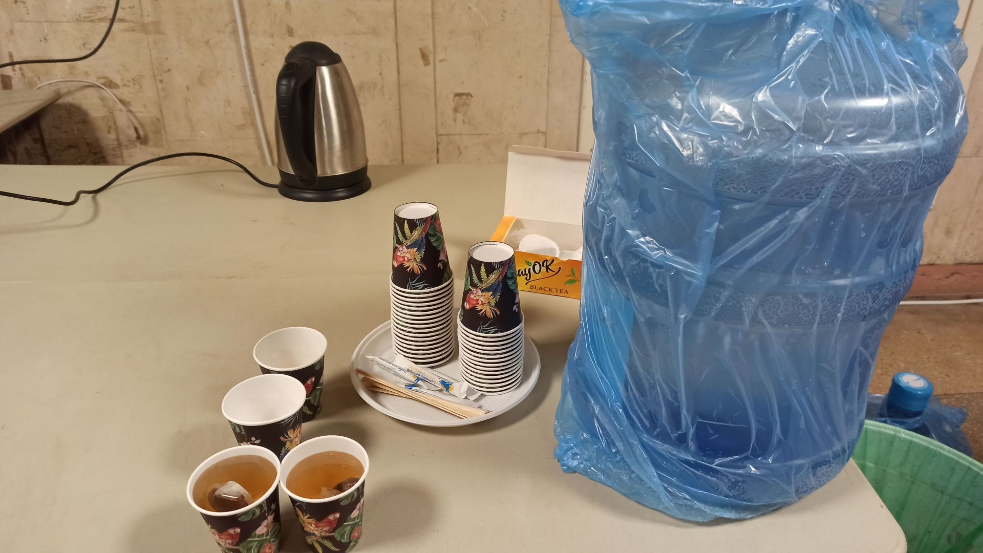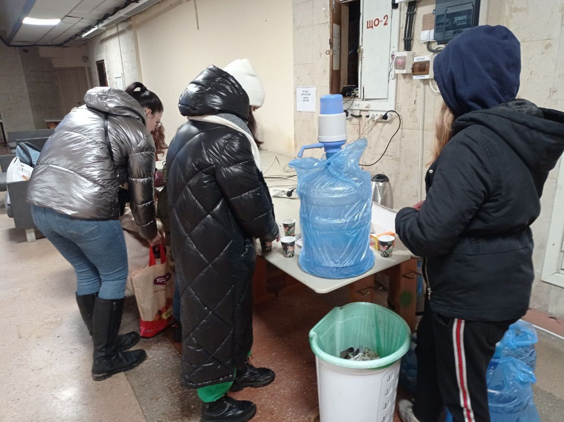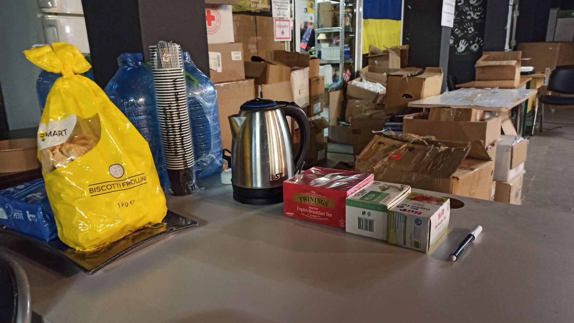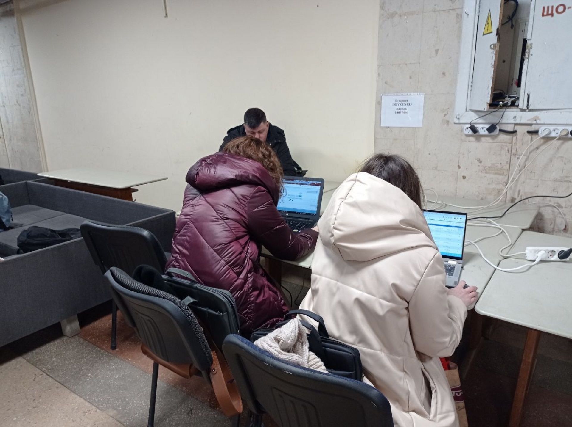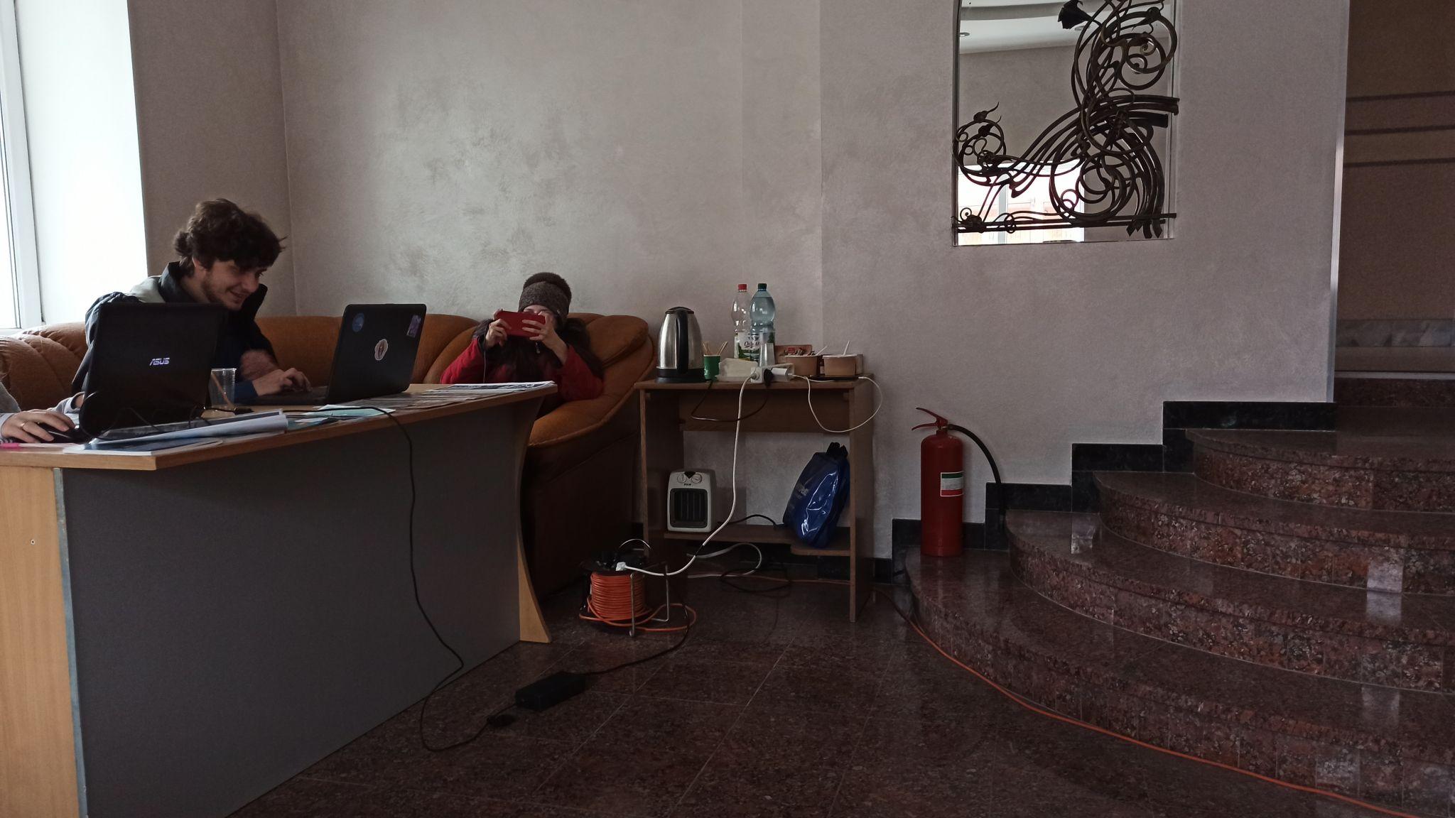 На невеликому столику під стіною були чайник, вода, чай та кава, серветки, пластикові стаканчики. Ми поставили телефон на підзарядку. Допоки перебували у пункті, сюди прийшла ще одна жінка попрацювати й запитала, чи може підключити до мережі смартфон і ноутбук. Облаштуватись їй допоміг черговий рятувальник. Чоловік періодично підходив до людей, цікавився, чи їм комфортно, чи нічого не потребують, пропонував зробити гарячий напій. Містяни, які прийшли сюди раніше, підказали нам пароль від Wi-Fi. Ми перевірили - інтернет з хорошою швидкістю. Але загалом приміщення цього пункту обігріву доволі мале. Тут всього один стіл, та не так багато місць для сидіння. То якщо сюди прийде багато людей - буде затісно. Крім того, зосередитись на роботі буде важко, оскільки тут прохідна – через коридор ходять рятувальники та інші працівники управління.