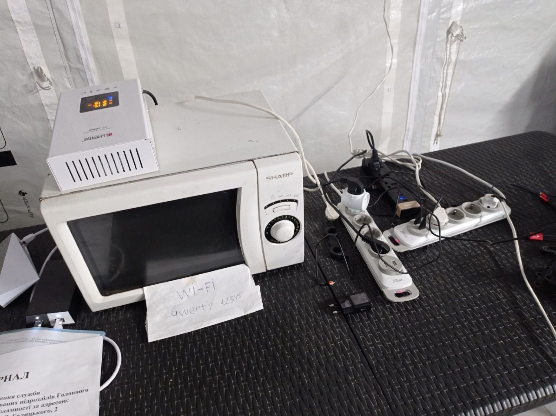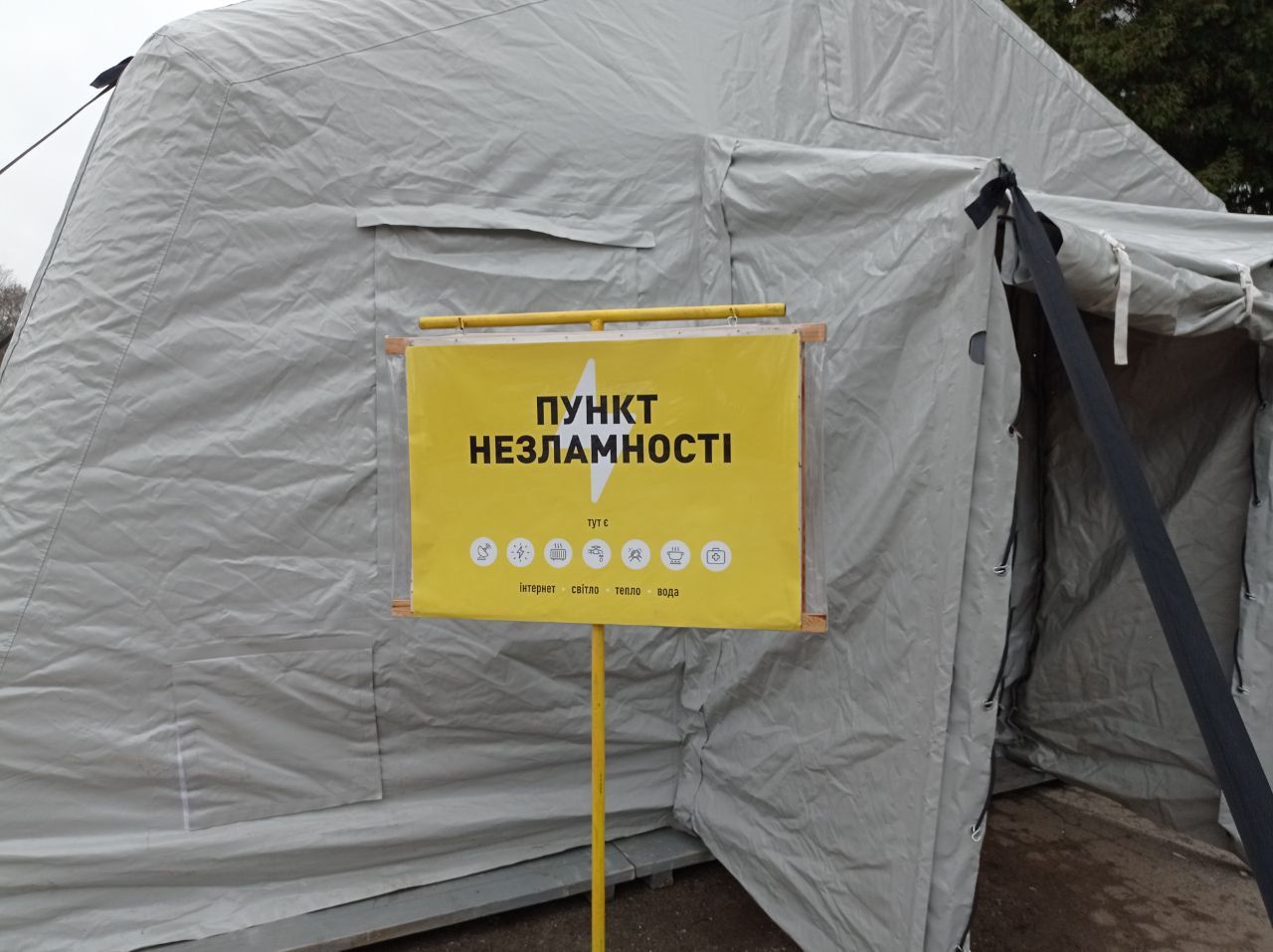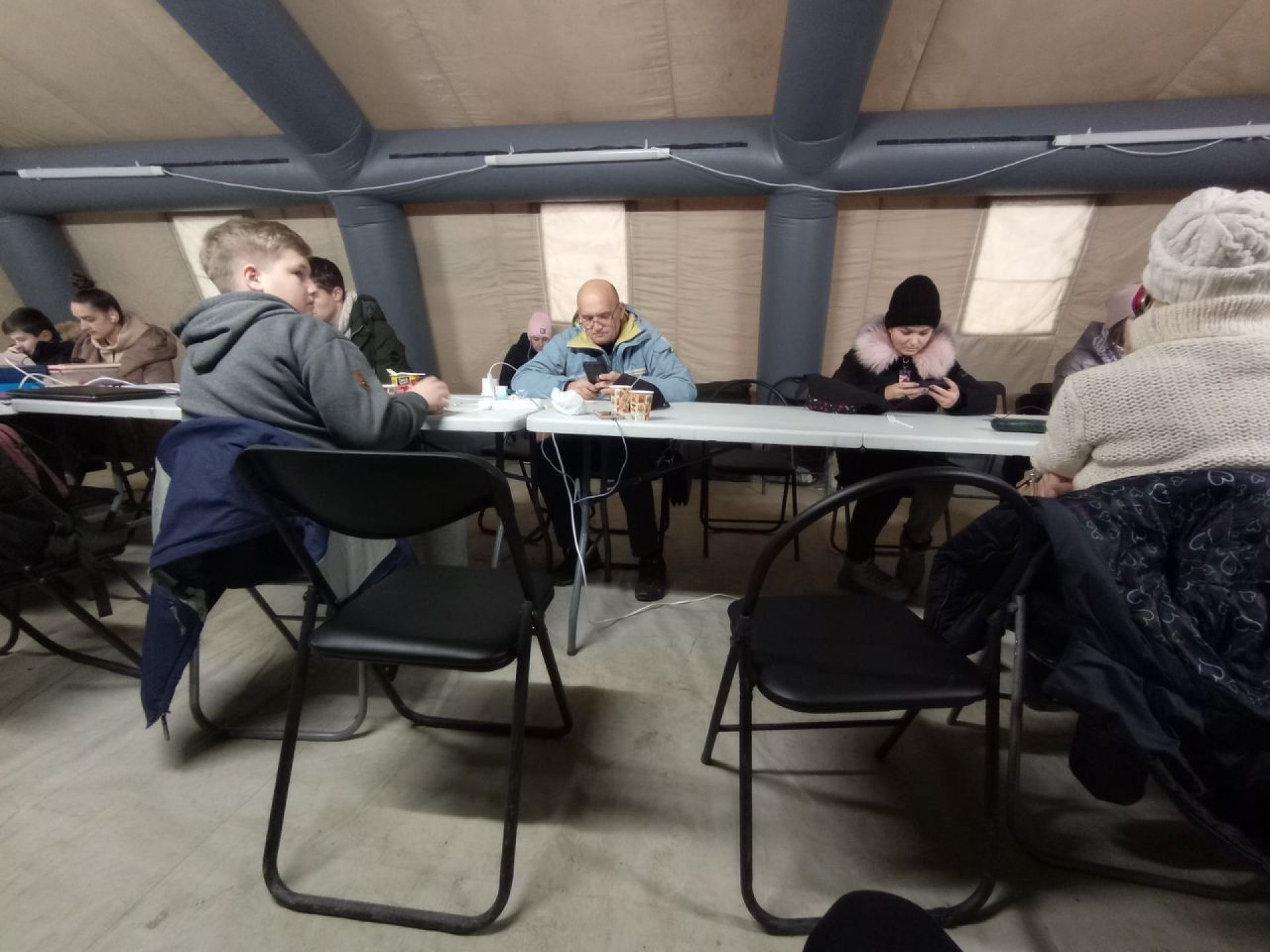 Всередині комфортно, достатньо розеток, щоб підзарядити техніку, є освітлення, окремий стіл з кількома чайниками та печивом. Як ми помітили, це найновіший намет серед тих, які встановили у місті. Він надувний. Але відчутно запах гуми, хоча до нього швидко звикаєш і не звертаєш уваги. Також працював термінал «Старлінк». Щоправда, через велику кількість користувачів інтернет був повільний. Тому значно комфортніше користуватись власним мобільним. У пункті чергували кілька рятувальників, допомагали людям. Пропонували чай та каву, радили, як підключитися до інтернету. Тут досить тихо, тому можна спокійно попрацювати або просто займатися власними справами, підзарядити техніку і відпочити.