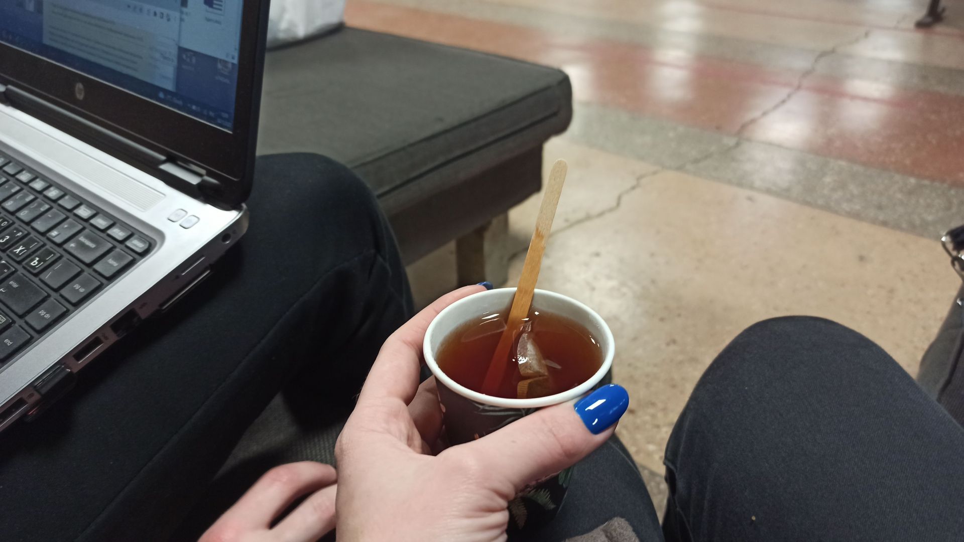 У довідковій ми запитали, де можна підзарядити техніку, на що нам відповіли, що слід шукати вільні розетки. Одна з таких була біля автоматів з кавою. Не дуже зручно стояти за кавовим апаратом з телефоном чи ноутбуком в руках, але принаймні тепло – на вокзалі є опалення. Дехто заряджав телефони від розеток, біля лавок. Столів немає, тож якщо вам потрібно попрацювати – це буде незручно. Тут є Wi-Fi, кілька безкоштовних мереж без паролів. З’єднання хороше, інтернет – швидкий.