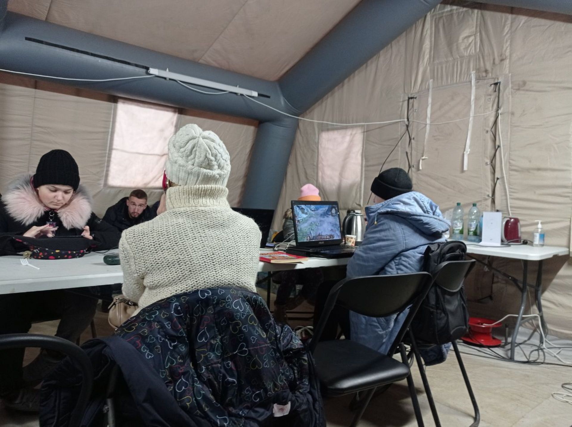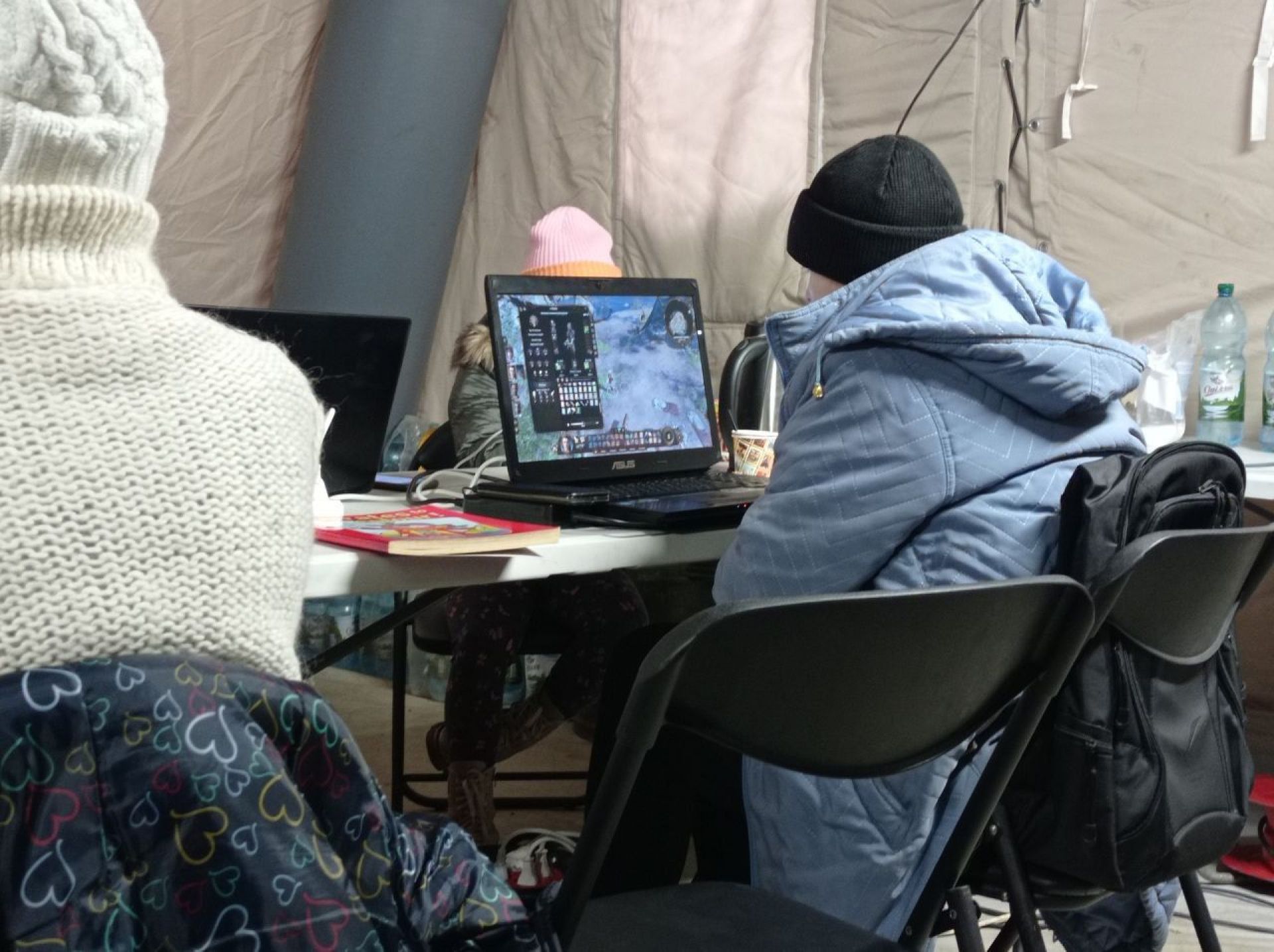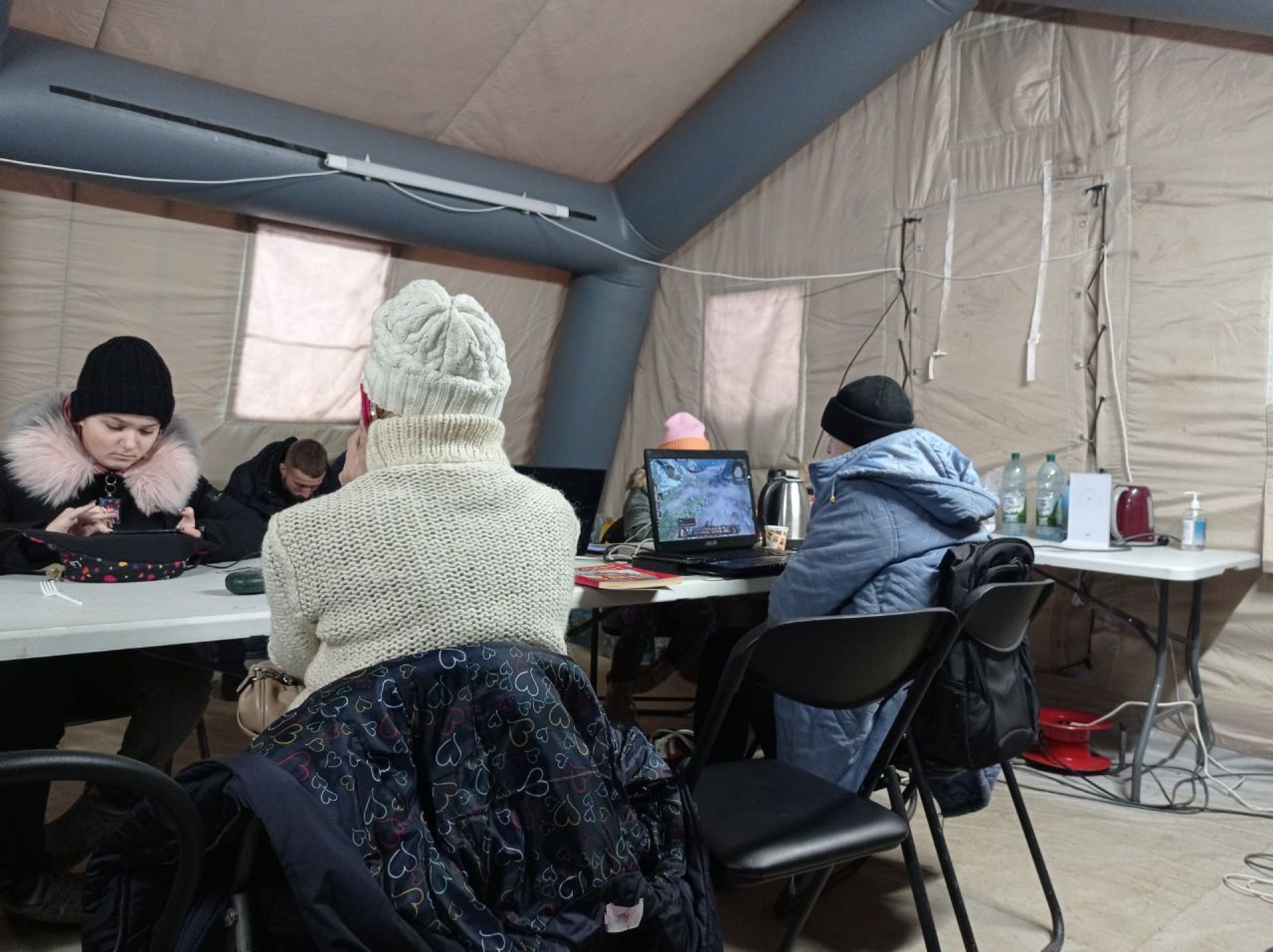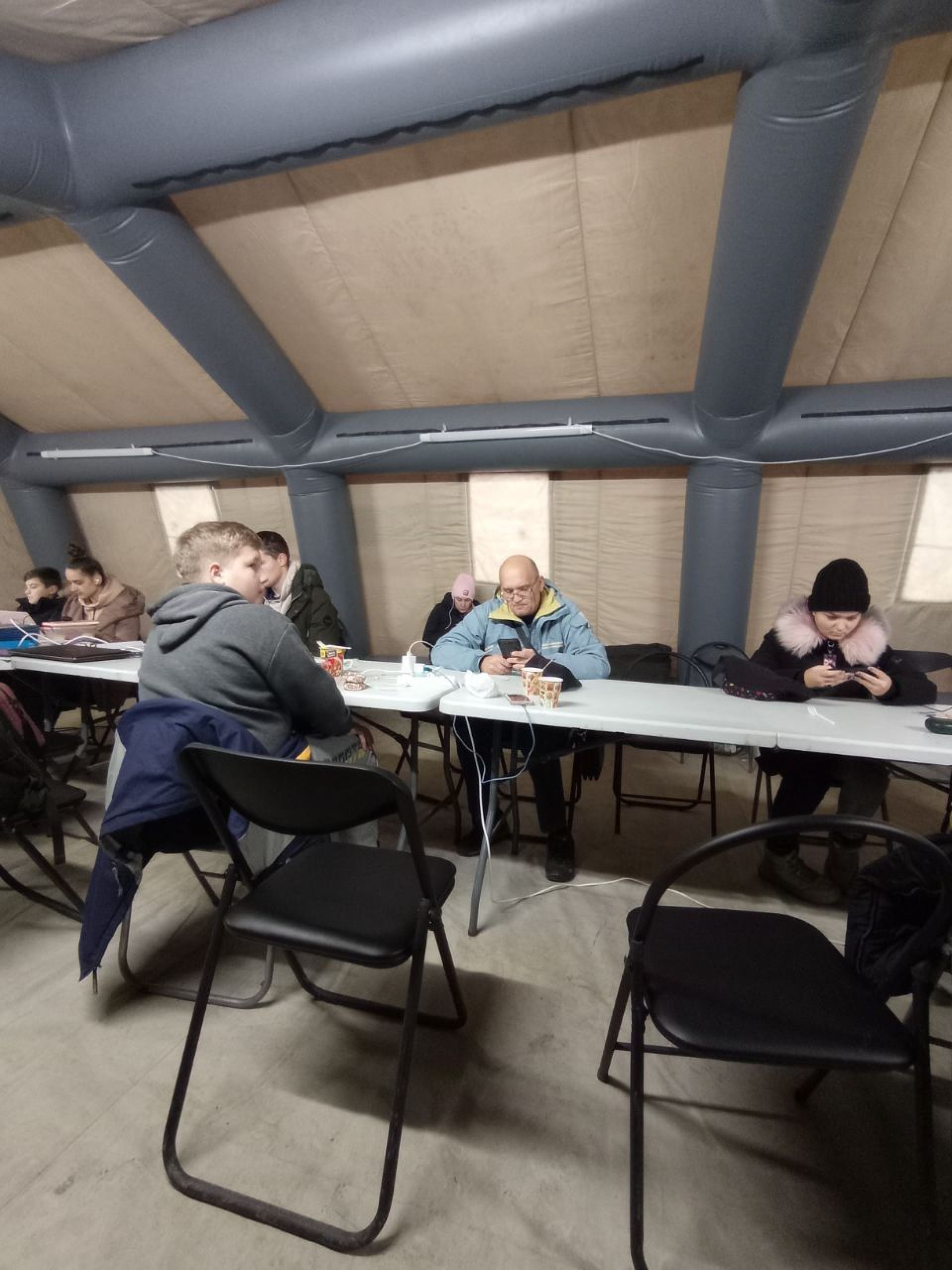 Це мобільний пункт обігріву, який розташований в наметі біля Палацу культури «Березіль». Під час нашого візиту значна частина масиву «Дружба» була без світла, тож всередині сиділи багато людей. Найбільше – школярів, які прийшли підзарядити телефони чи ноутбуки та посидіти в інтернеті. Дехто грав в ігри. Всередині є столи та стільці. Тут, на відміну від інших пунктів обігріву, не було лежаків – лише сидячі місця. Загалом було приблизно п’ятнадцять людей.
