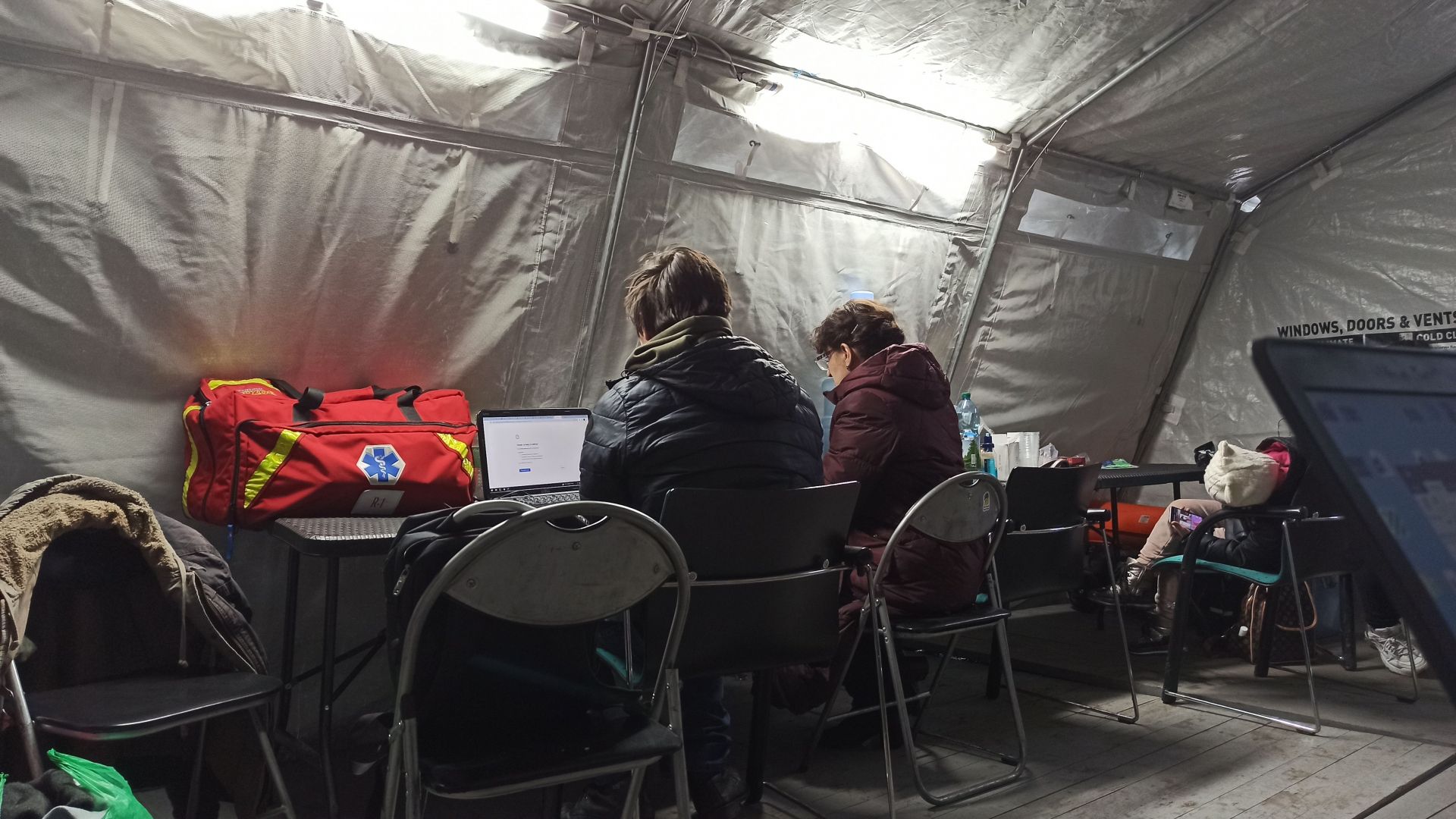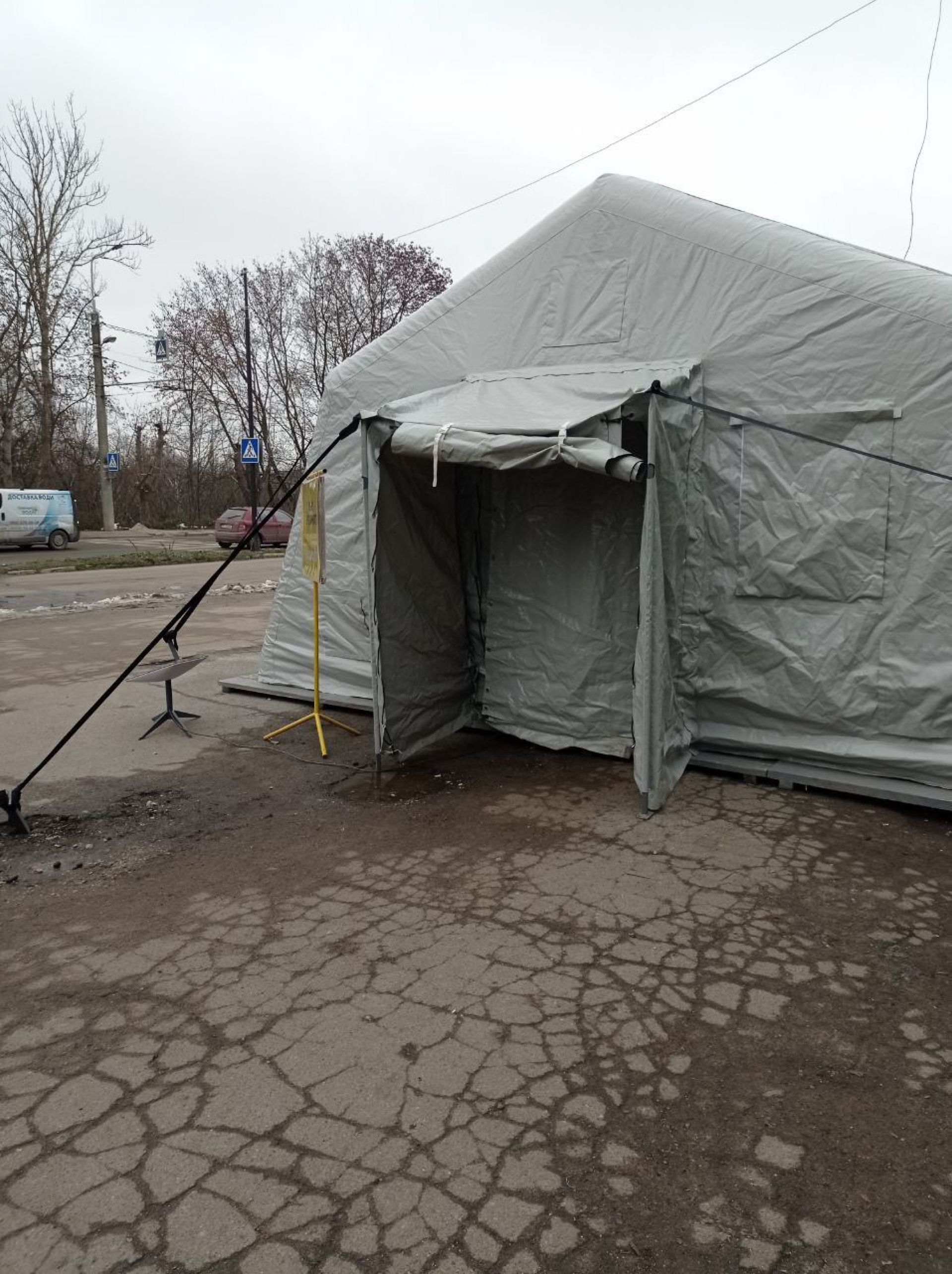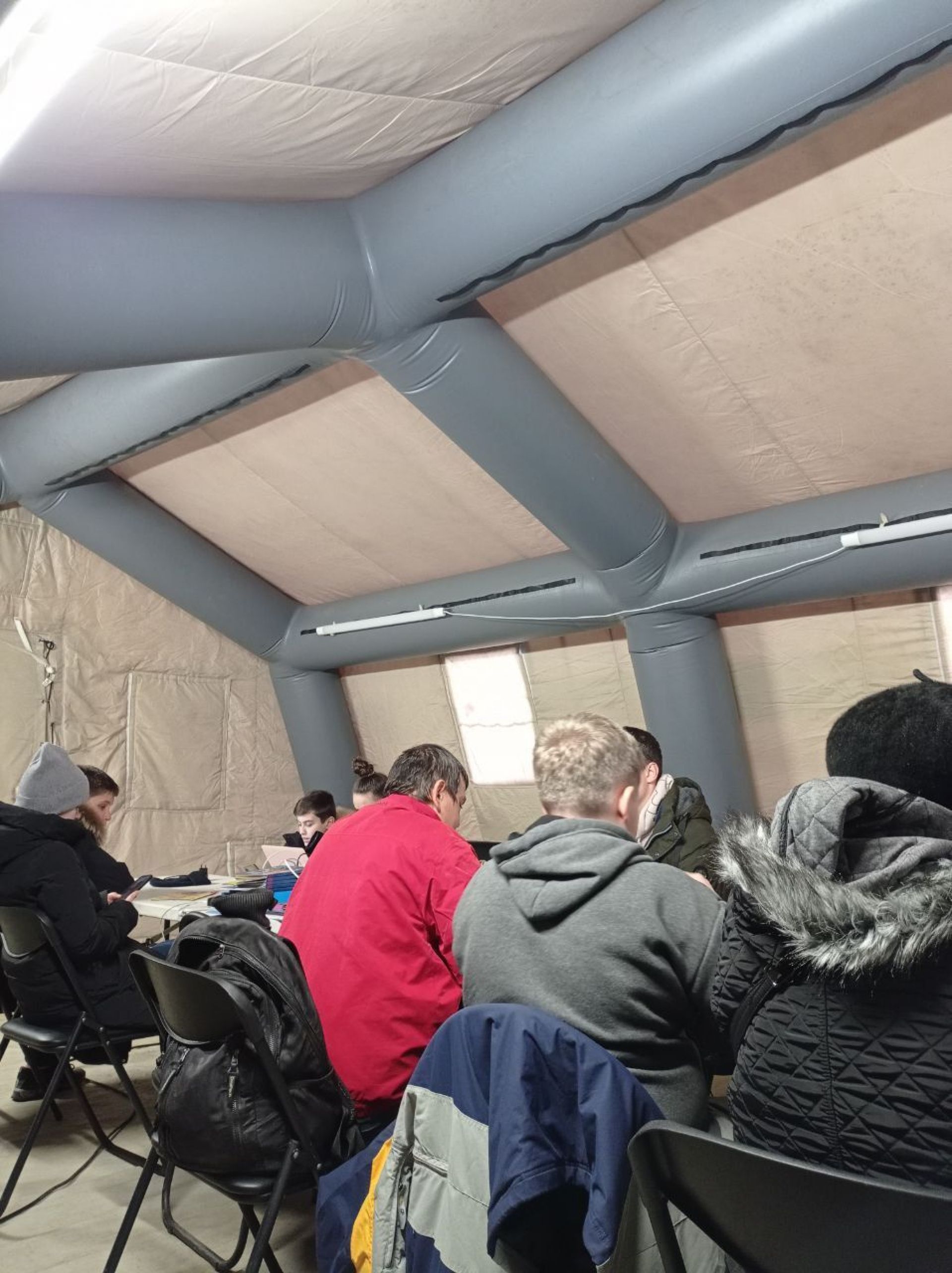 Це мобільний пункт обігріву, який розташований в наметі біля Палацу культури «Березіль». Під час нашого візиту значна частина масиву «Дружба» була без світла, тож всередині сиділи багато людей. Найбільше – школярів, які прийшли підзарядити телефони чи ноутбуки та посидіти в інтернеті. Дехто грав в ігри. Всередині є столи та стільці. Тут, на відміну від інших пунктів обігріву, не було лежаків – лише сидячі місця. Загалом було приблизно п’ятнадцять людей.