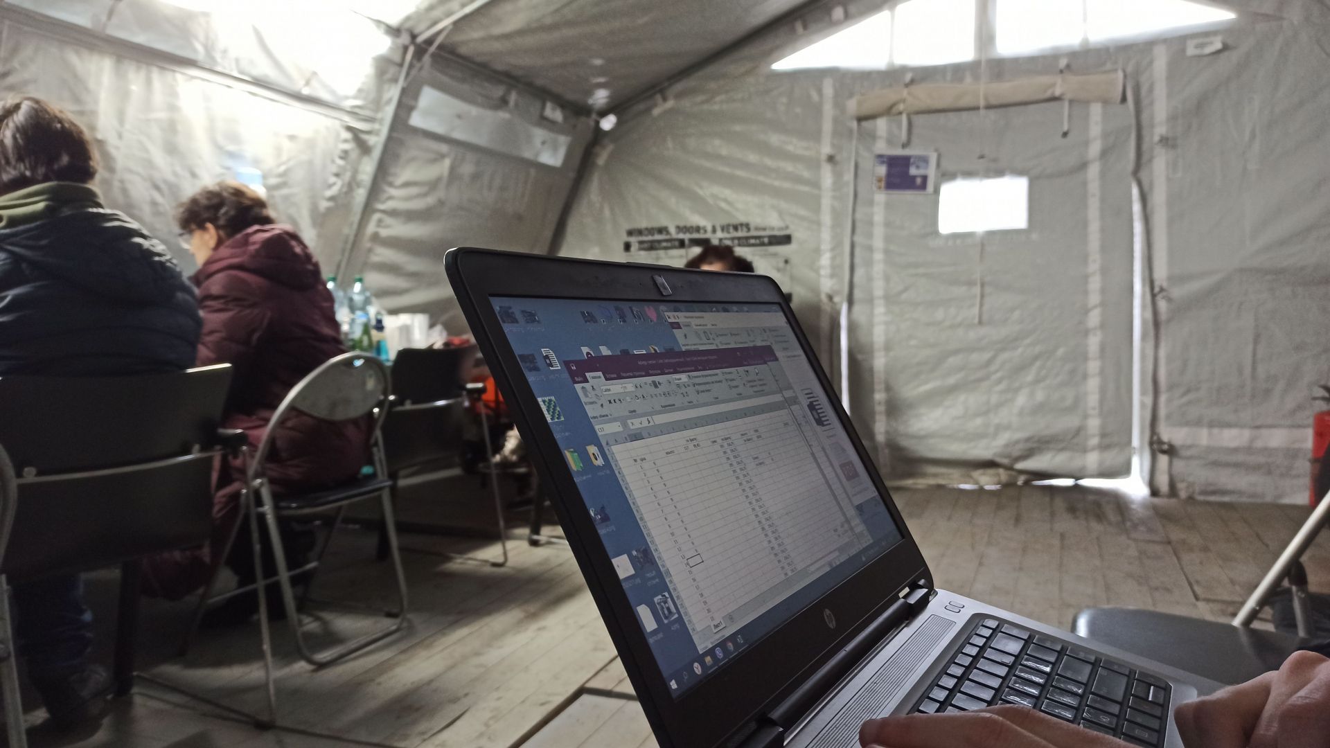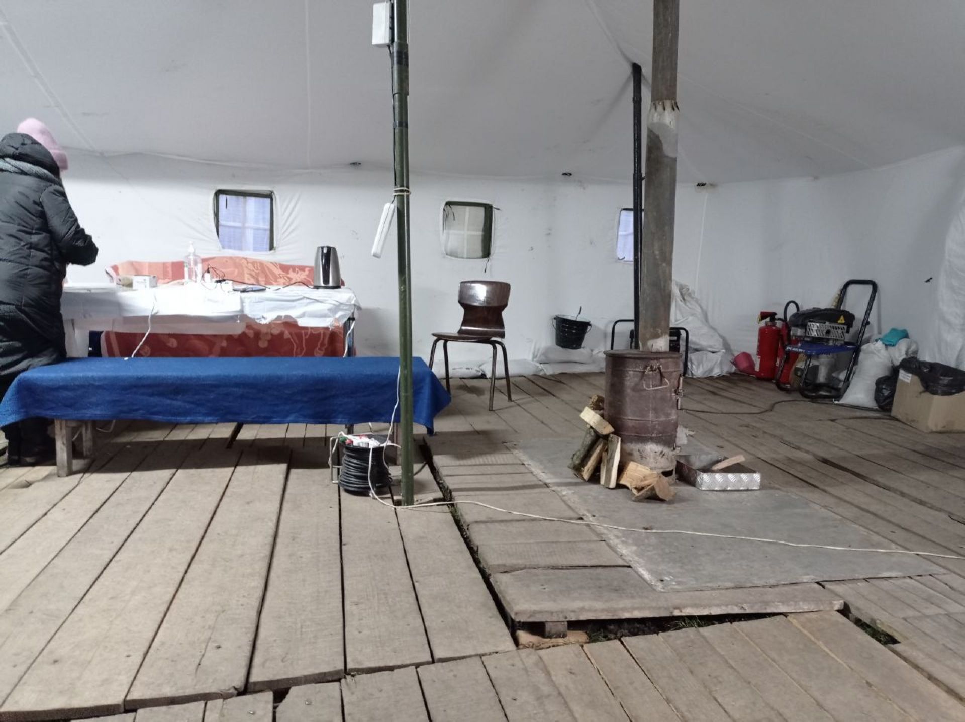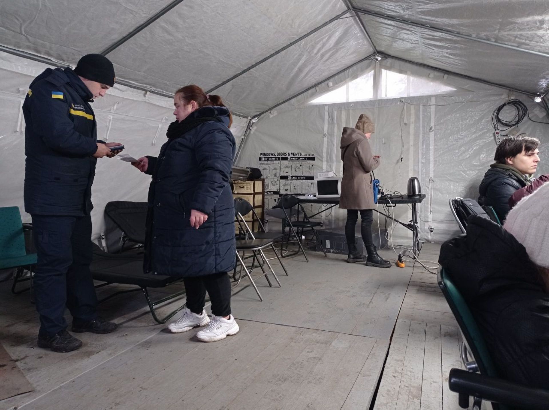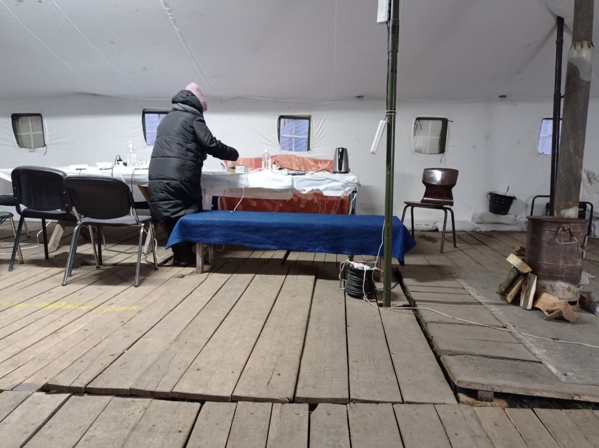 Це мобільний пункт обігріву, який розташований в наметі біля Палацу культури «Березіль». Під час нашого візиту значна частина масиву «Дружба» була без світла, тож всередині сиділи багато людей. Найбільше – школярів, які прийшли підзарядити телефони чи ноутбуки та посидіти в інтернеті. Дехто грав в ігри. Всередині є столи та стільці. Тут, на відміну від інших пунктів обігріву, не було лежаків – лише сидячі місця. Загалом було приблизно п’ятнадцять людей.