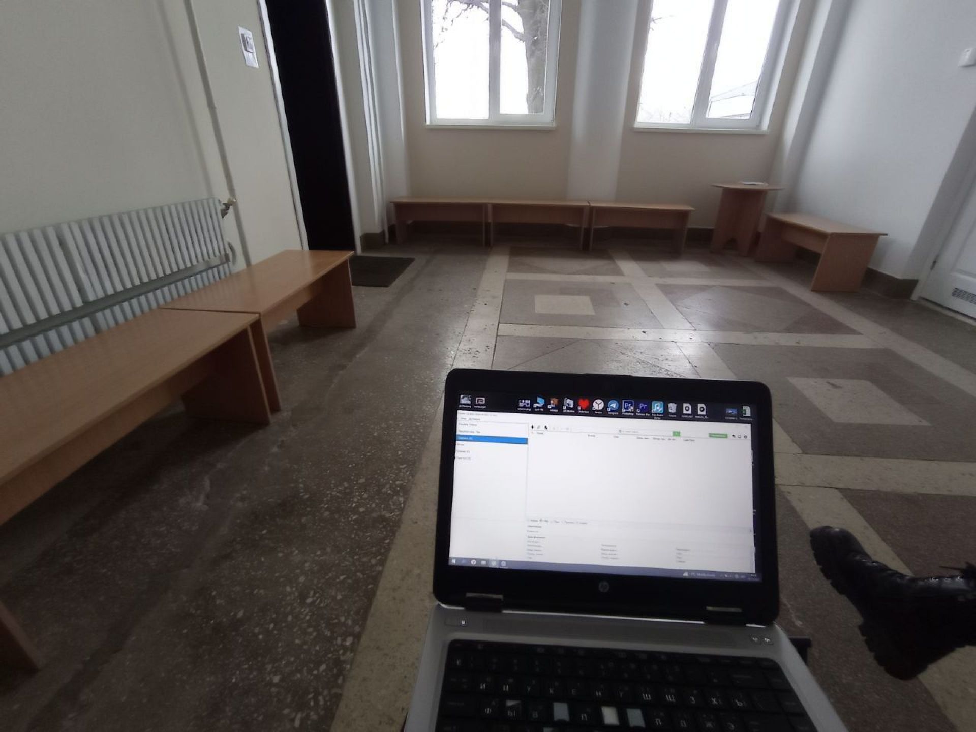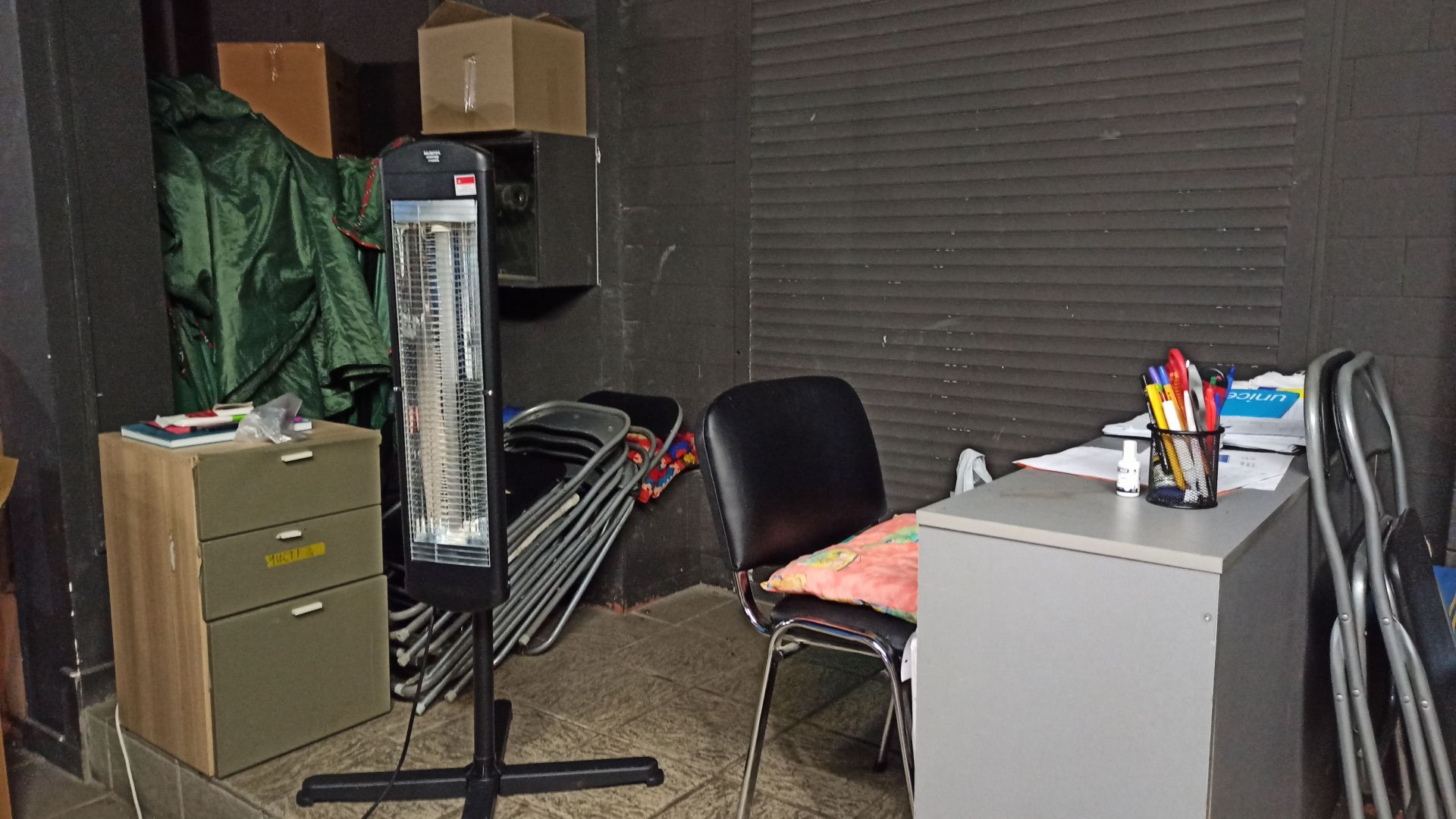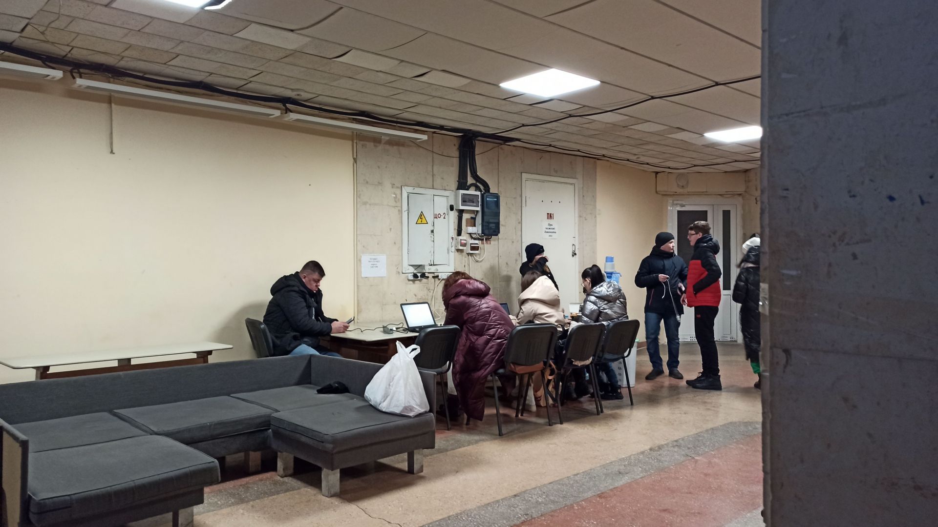 Ми покинули територію «Східного масиву», та не встигли відійти далеко, як нас гукнула інша жінка й покликала досередини. Виявилось, що чергову не повідомили про те, що на базі підприємства облаштували пункт незламності. Вона вибачилась перед нами, принесла подовжувач, аби підзарядити смартфони й ноутбуки, запропонувала заварити теплий чай чи каву. Вивіски, що на базі ПП діє пункт обігріву, ще немає. Нам розповіли, що пункт тільки запрацював, а вивіску ще не встигли зробити і почепити на двері. У приміщенні, куди нас впустили, стоять вісім лавок та два столики. На одному з них лежить упаковка одноразових масок. Пункт обігріву прямісінько біля вхідних дверей, але збоку на стіні батарея, тому тут тепло. Працівник підприємства, який проходив повз, на запитання, чи можна під’єднатись до їхнього Wi-Fi, відповів, що роутер мають, але інтернет наразі відсутній. Збоку розташована вбиральня, але зайти туди ви зможете лише зі спеціальним ключем, який слід попросити у чергової. У цьому новоствореному пункті незламності крім нас людей не було взагалі. Вочевидь, ми перші, хто взагалі про нього дізнався і прийшов сюди. Направду, працювати тут складно. Надто гучно, адже пункт в коридорі, а ще майже не ловить мобільний інтернет.