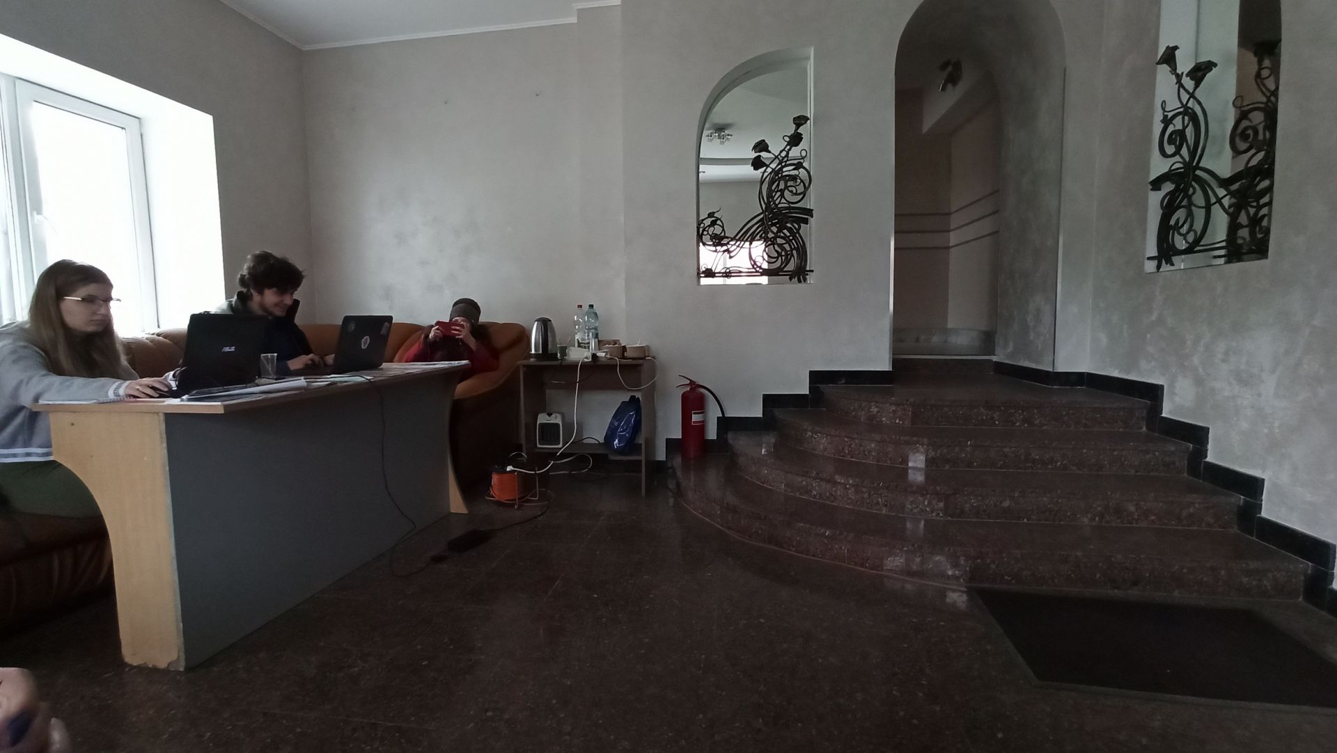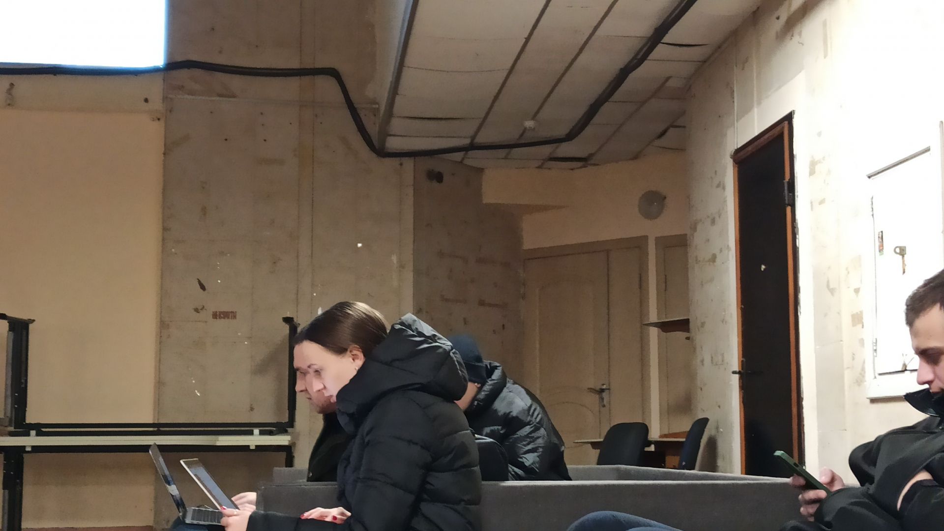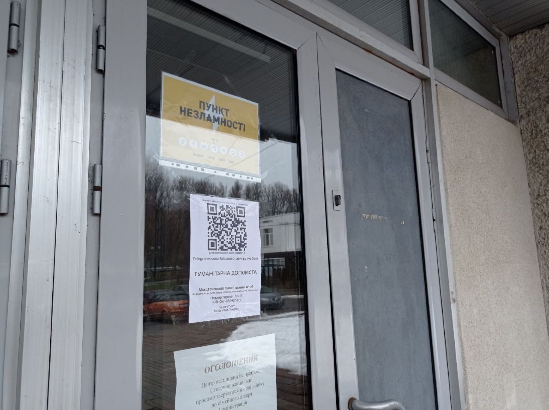 Ми покинули територію «Східного масиву», та не встигли відійти далеко, як нас гукнула інша жінка й покликала досередини. Виявилось, що чергову не повідомили про те, що на базі підприємства облаштували пункт незламності. Вона вибачилась перед нами, принесла подовжувач, аби підзарядити смартфони й ноутбуки, запропонувала заварити теплий чай чи каву. Вивіски, що на базі ПП діє пункт обігріву, ще немає. Нам розповіли, що пункт тільки запрацював, а вивіску ще не встигли зробити і почепити на двері. У приміщенні, куди нас впустили, стоять вісім лавок та два столики. На одному з них лежить упаковка одноразових масок. Пункт обігріву прямісінько біля вхідних дверей, але збоку на стіні батарея, тому тут тепло. Працівник підприємства, який проходив повз, на запитання, чи можна під’єднатись до їхнього Wi-Fi, відповів, що роутер мають, але інтернет наразі відсутній. Збоку розташована вбиральня, але зайти туди ви зможете лише зі спеціальним ключем, який слід попросити у чергової. У цьому новоствореному пункті незламності крім нас людей не було взагалі. Вочевидь, ми перші, хто взагалі про нього дізнався і прийшов сюди. Направду, працювати тут складно. Надто гучно, адже пункт в коридорі, а ще майже не ловить мобільний інтернет.