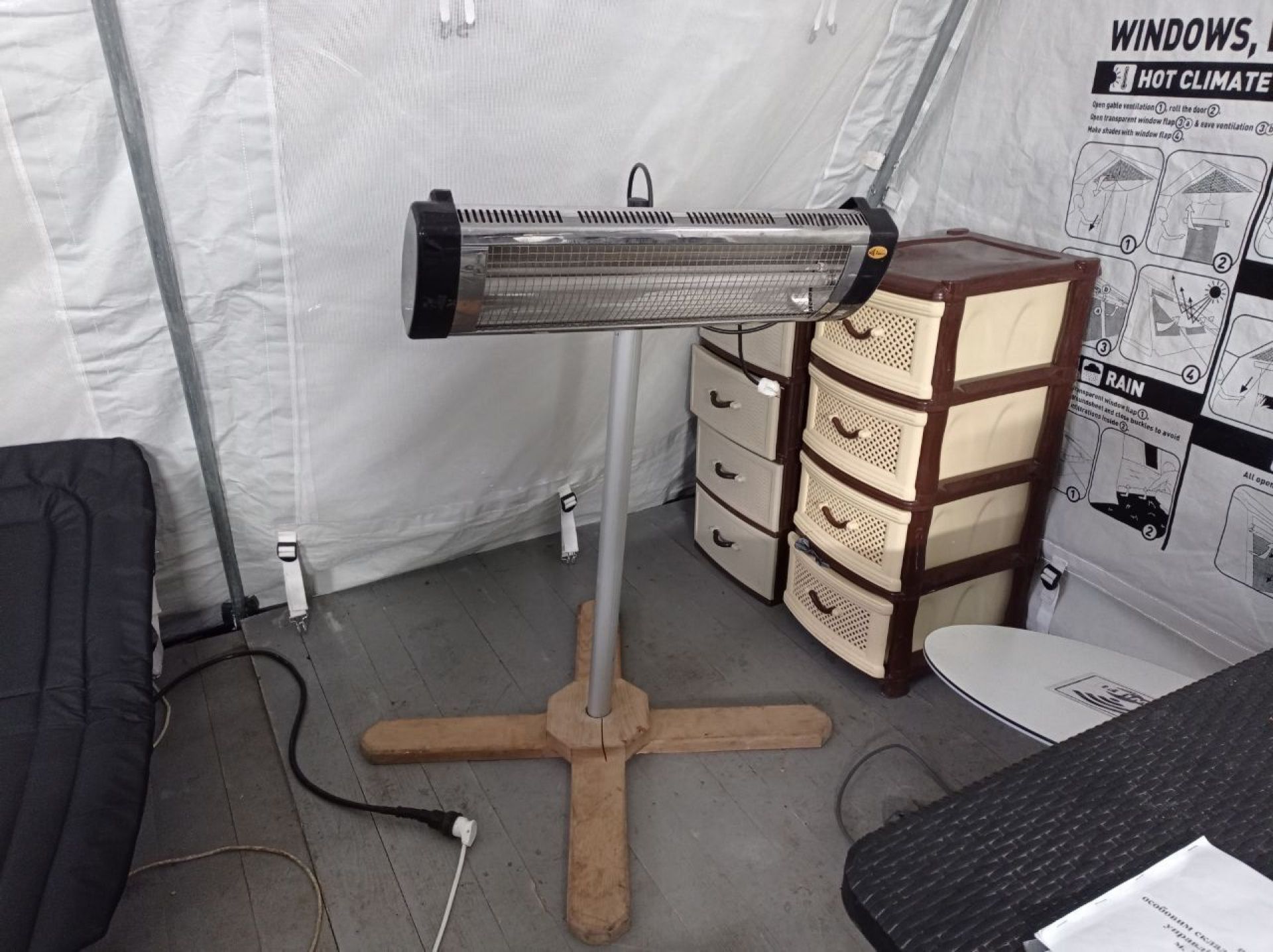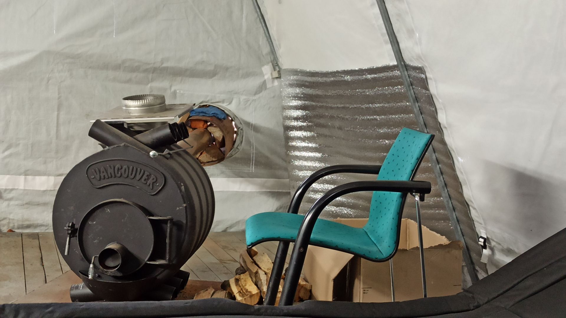 Цей пункт обігріву є одним з трьох мобільних пунктів, які встановлені у різних мікрорайонах міста. На сайті Тернопільської мерії вказали, що він працює цілодобово. Пункт виглядає як звичайний водонепроникний намет. Підлога всередині з дерев’яних дощок, хитається під ногами. Ще надворі помічаємо, як з труби йде дим. В наметі упродовж дня палять в буржуйці, але всеодно тут не надто тепло, тому люди не знімають верхній одяг. На момент наших відвідин у пункті сиділи кілька містян, серед яких – мама з дитиною. Дівчинка дивилася мультик. Дехто працював з ноутбуком.