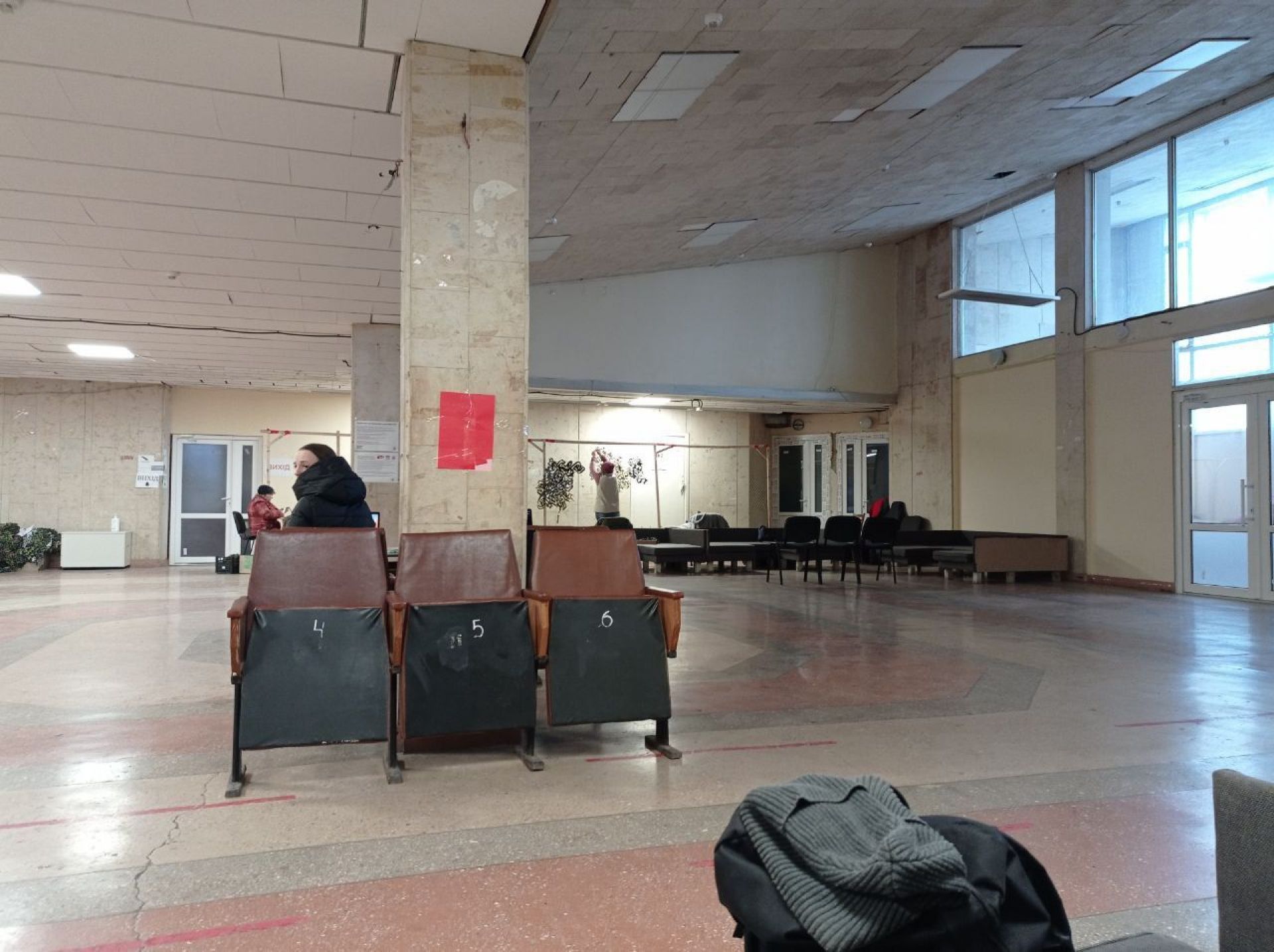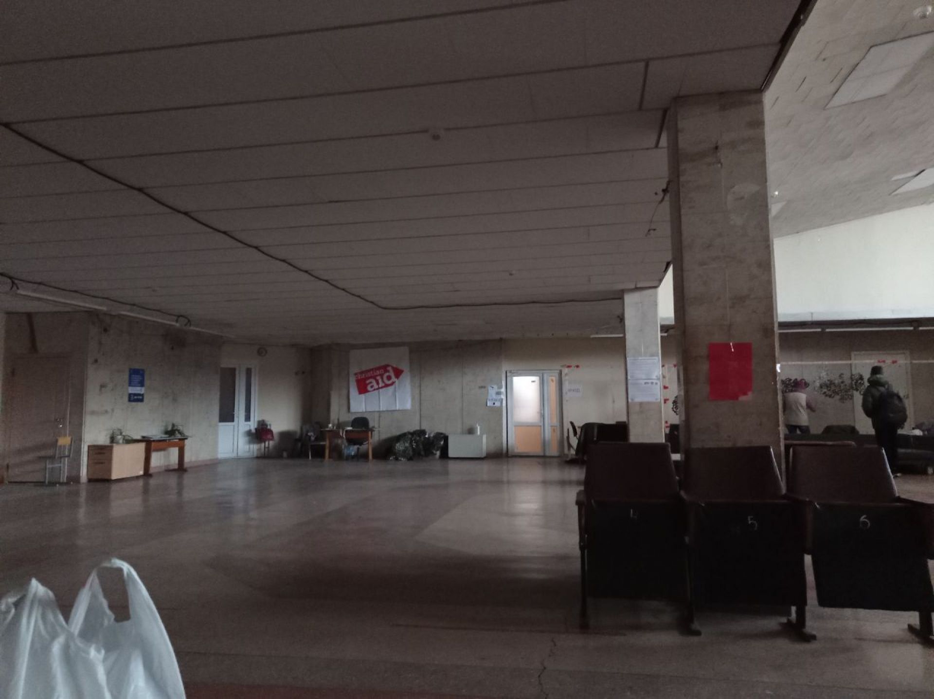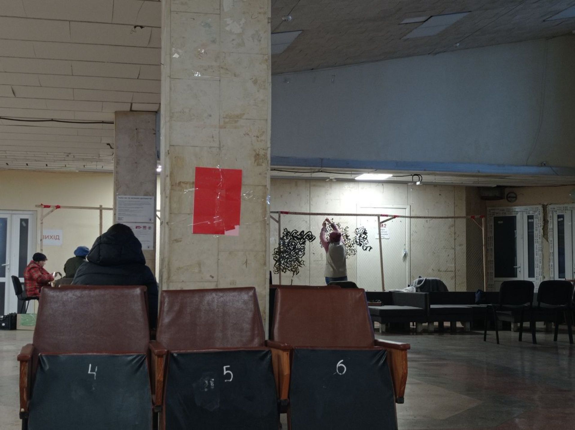 На вході до приміщення залізничного вокзалу була вивіска, що тут облаштований «Пункт незламності». Але, як виявилось, окремого місця, де можна зарядити телефон, немає. Другий поверх вокзалу був перекритий. На першому поверсі у різних залах люди очікували на потяг.