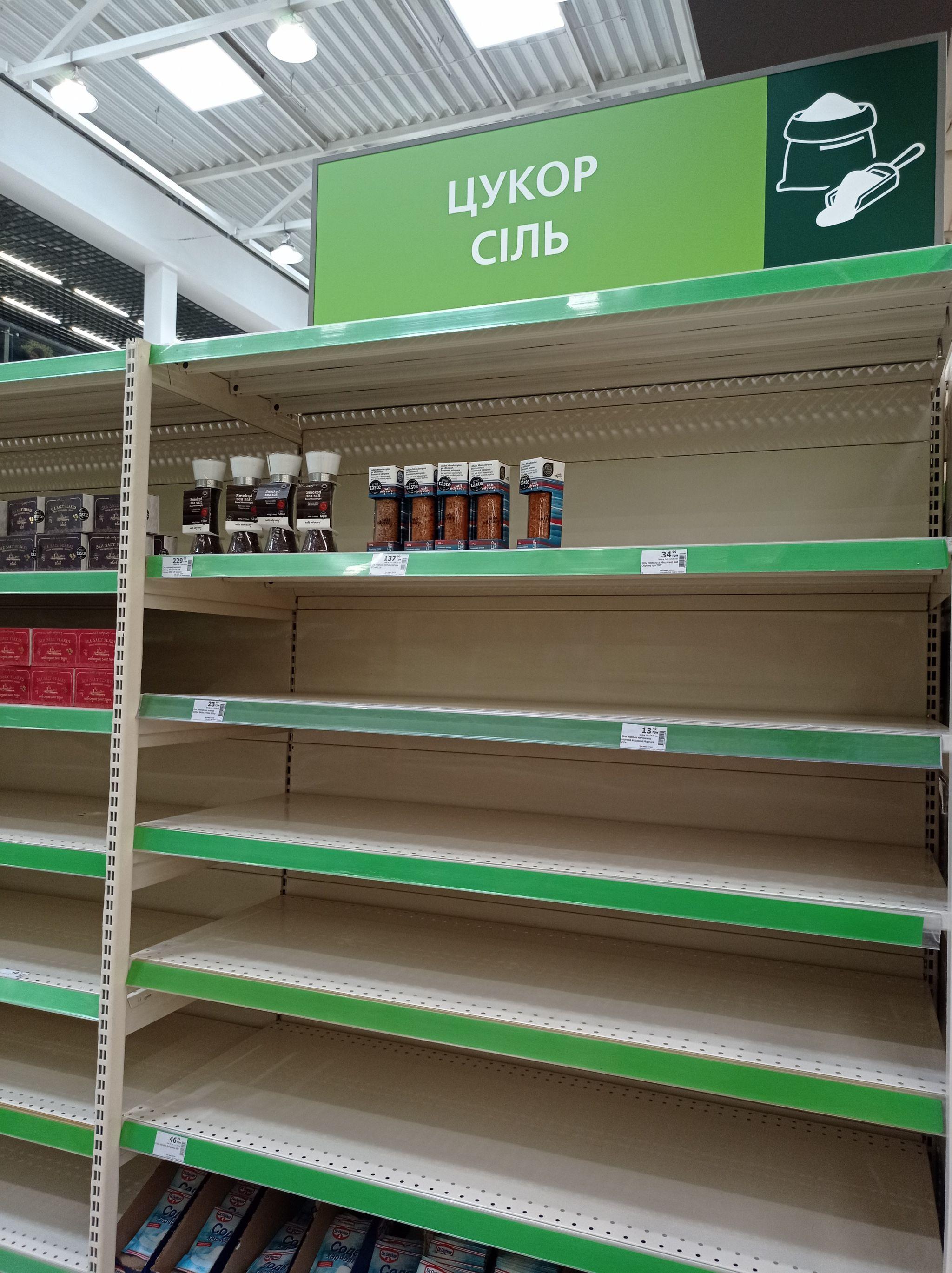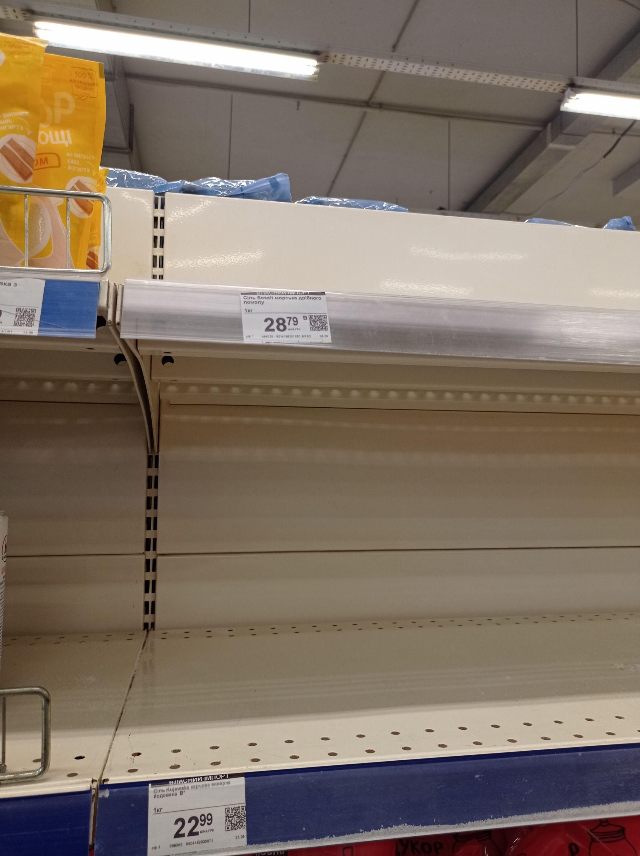 У супермаркеті ще зранку була сіль, але все розкупили – розповіла одна з продавчинь. Полиця порожня. Однак кажуть, ще мають привезти сіль.