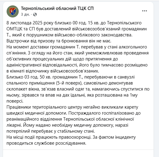 «8 листопада 2025 року близько 00 год. 15 хв. до Тернопільського ОМТЦК та СП був доставлений військовозобов’язаний громадянин Т., який є порушником військово-облікового законодавства. Відстрочки від призову та бронювання він не має.