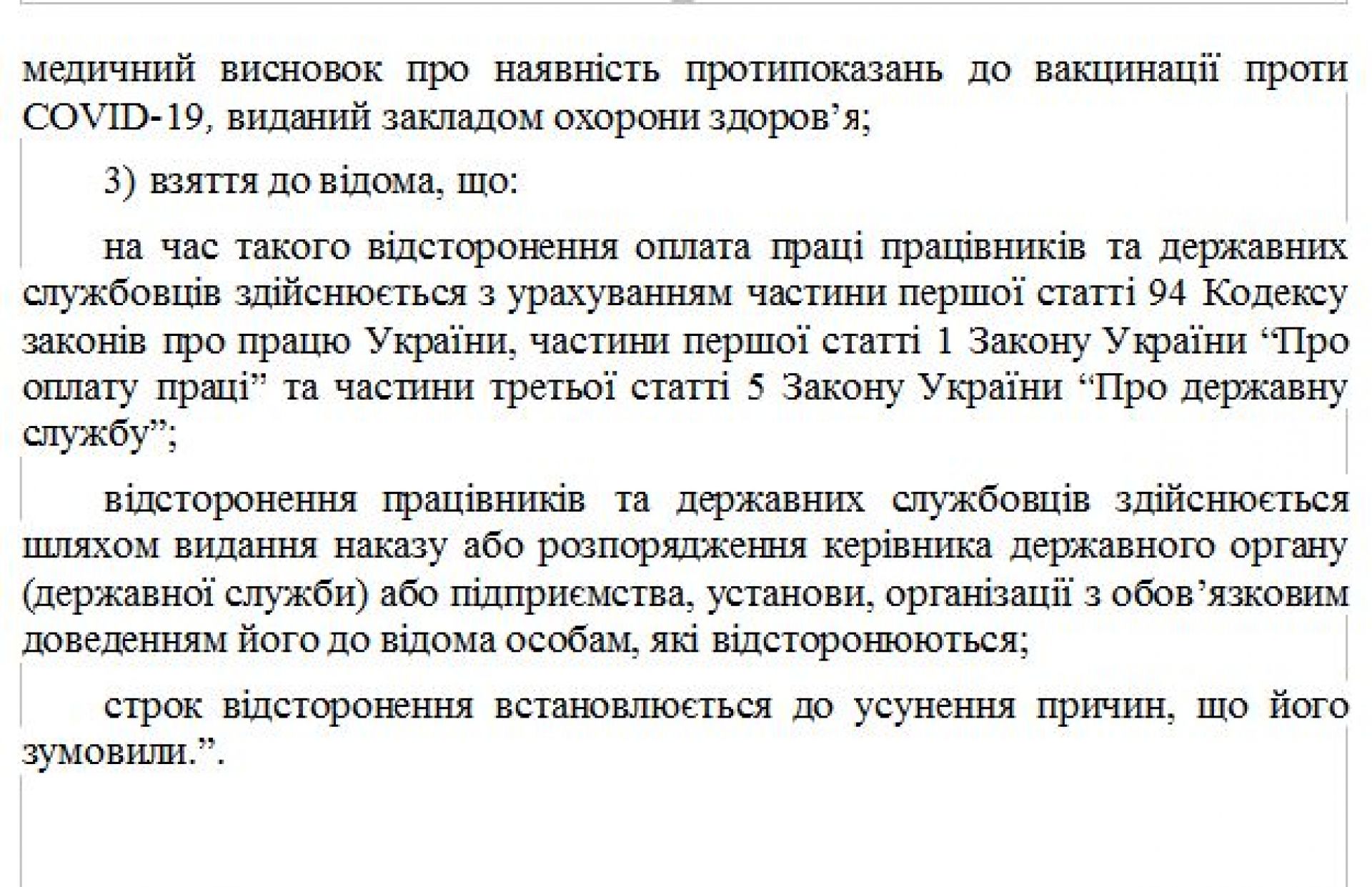 Кабмін затвердив порядок відсторонення співробітників підприємств, установ та організацій, які підлягають обов'язковому щепленню від COVID-19, який діятиме з 08 листопада. Що передбачається новою Постановою Кабміну від 20 жовтня 2021 року №1096?