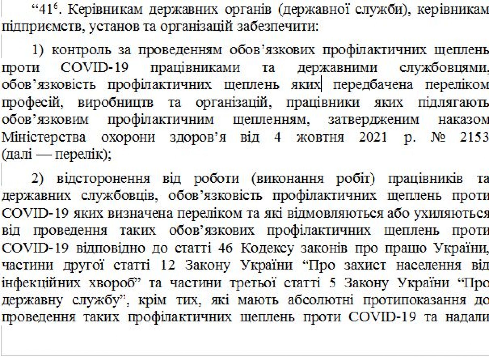 Спільний представницький орган профспілок не підтримує наказ МОЗ від 04 жовтня 2021 р. №2133, яким затверджено зазначений Перелік, оскільки ці документи мають дискримінаційні ознаки, суперечать національним та міжнародним нормативно-правовим актам, згідно з якими вакцинація є добровільною. Застосування до працівника заходів примусу та/або дисциплінарного стягнення за відмову вакцинуватися від хвороби COVID-19, викликаної вірусом SARS- CoV-2, є неправомірним.