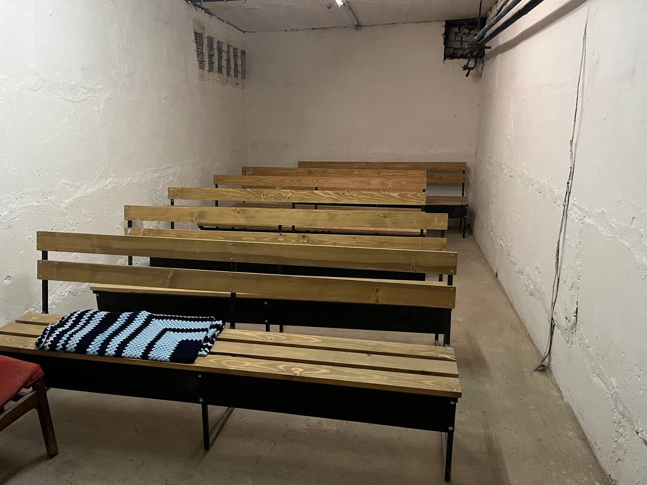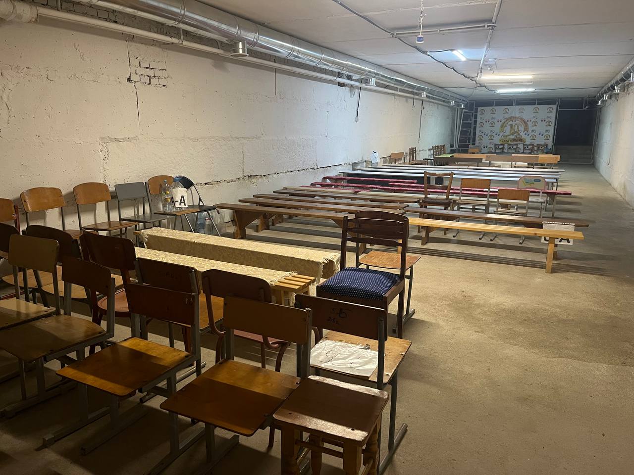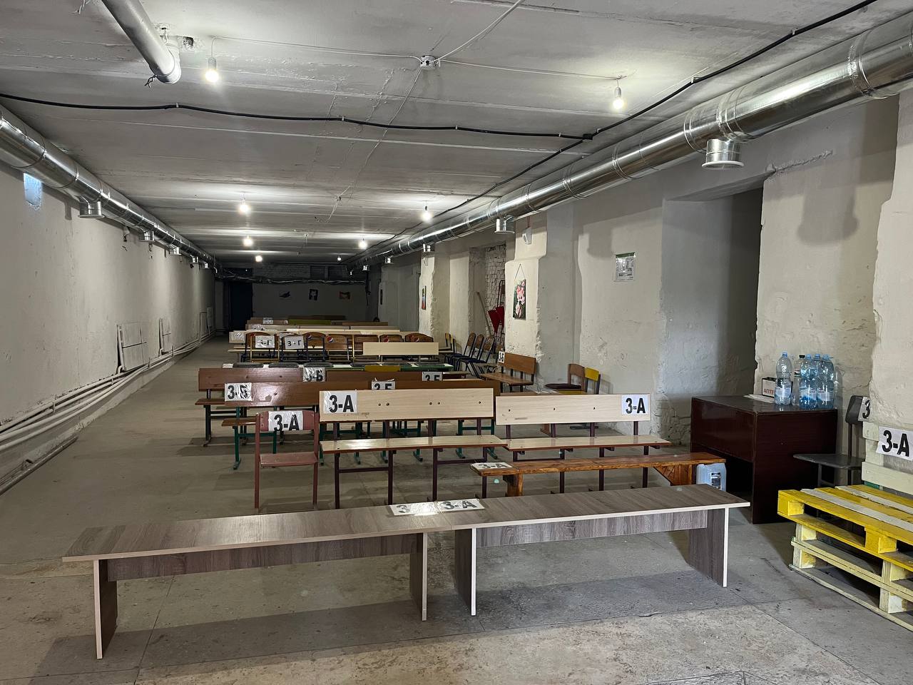 Під час нашого перебування в укритті було чисто, освітлення, запаси бутильованої питної води, працювала вентиляційна система. Для зручності встановлені лавки, стільці, парти. Є окрема кімната з диваном, де можуть перебувати батьки з маленькими дітьми.