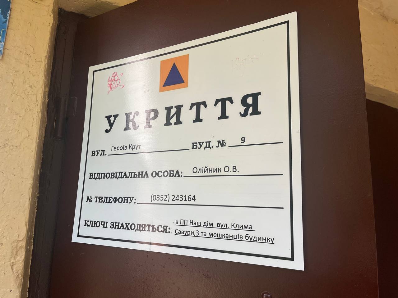 Про те, що там має бути приміщення, де можна переховуватися під час ворожих атак, свідчить відповідний вказівник з написом. З вказівки відомо, що укриття належить Тернопільському фаховому коледжу. А ось чи дозволяють там перебувати пересічним людям – невідомо, адже зв’язатися з керівництвом телефоном нам не вдалося.