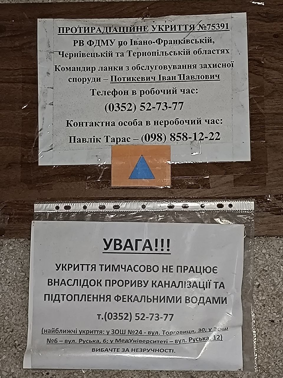 На дверях є повідомлення: «Прорив каналізації, тимчасово не працює». Але мешканці навколишніх будинків розповідають, що укриття зачинене вже кілька місяців. За цей час жодних робіт з відновлення не проводили. Люди обурені, адже мова йде про безпеку та життя під час тривоги.