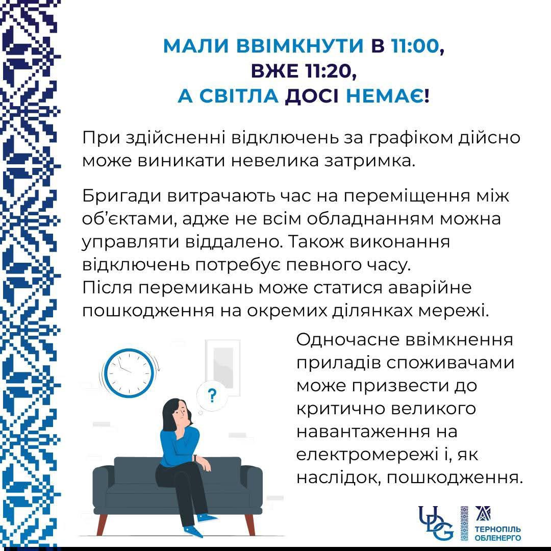 Будь ласка, перевіряйте причину відключення на офіційному сайті АТ «Тернопільобленерго» у розділі «Планові/поточні відключення» або за посиланням (https://www.toe.com.ua/breakPlan)