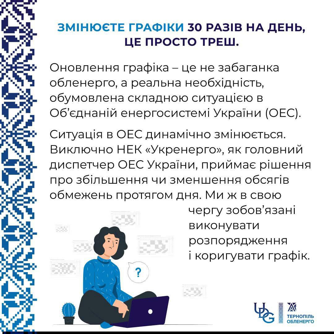 Оновлення графіка - це не забаганка обленерго, а реальна необхідність, обумовлена складною ситуацією в Обʼєднаній енергосистемі України (ОЕС). Ситуація в ОЕС динамічно змінюється.