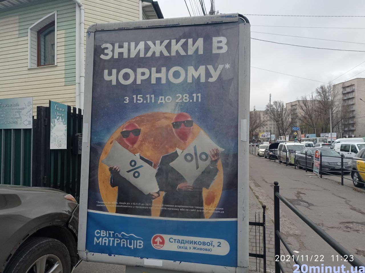 Про день наближення знижок нагадують і рекламні банери. Знижки до 60% на окремі товари в магазині «Світ матраців». Діятиме пропозиція до 28 листопада.