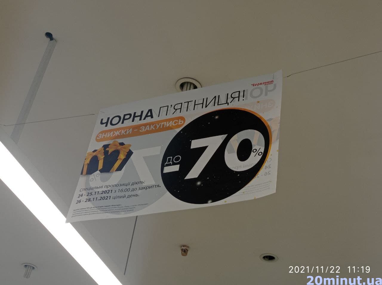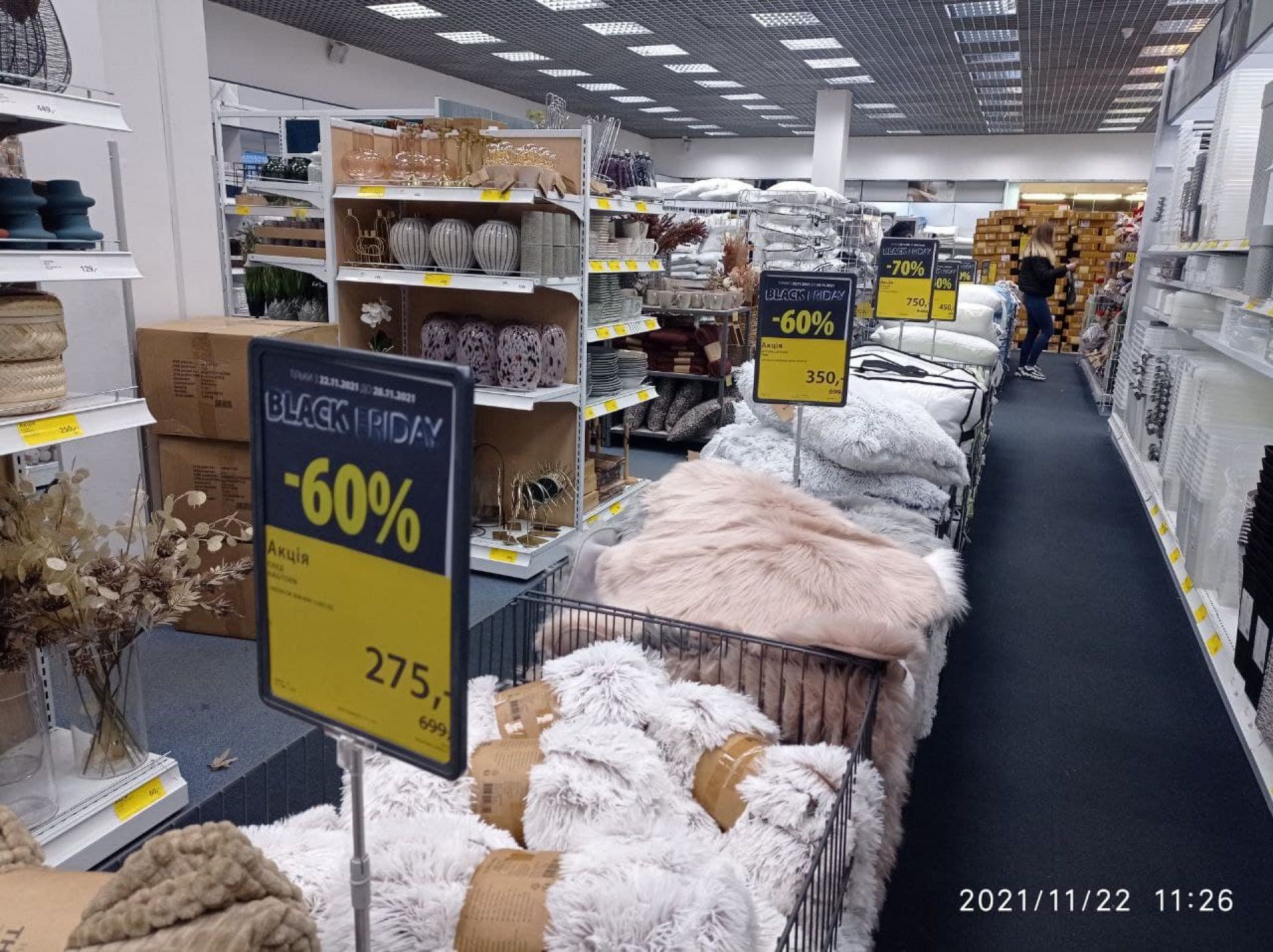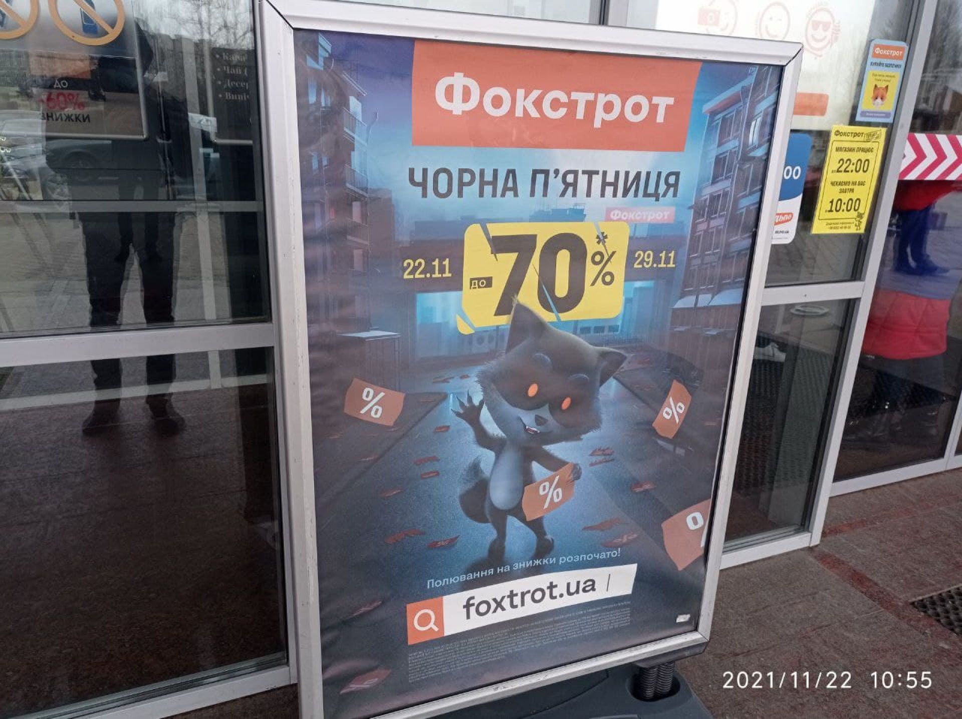 У ТЦ «Орнава» на вході вивіска – «Знижки до 60%». У магазині побутової техніки «Фокстрот» знижки на деякі товари – серед них смартфони, ноутбуки, комплектуючі, побутову техніку тощо. Період Триватимуть вони з 22 до 29 листопада. До прикладу, ноутбук ASUS G513IC коштує 37 тис. гривень, в акційний період – 34 тисячі. Пилосос PHILIPS за 4,4 тис гривень по акції обійдеться в 3 тисячі.