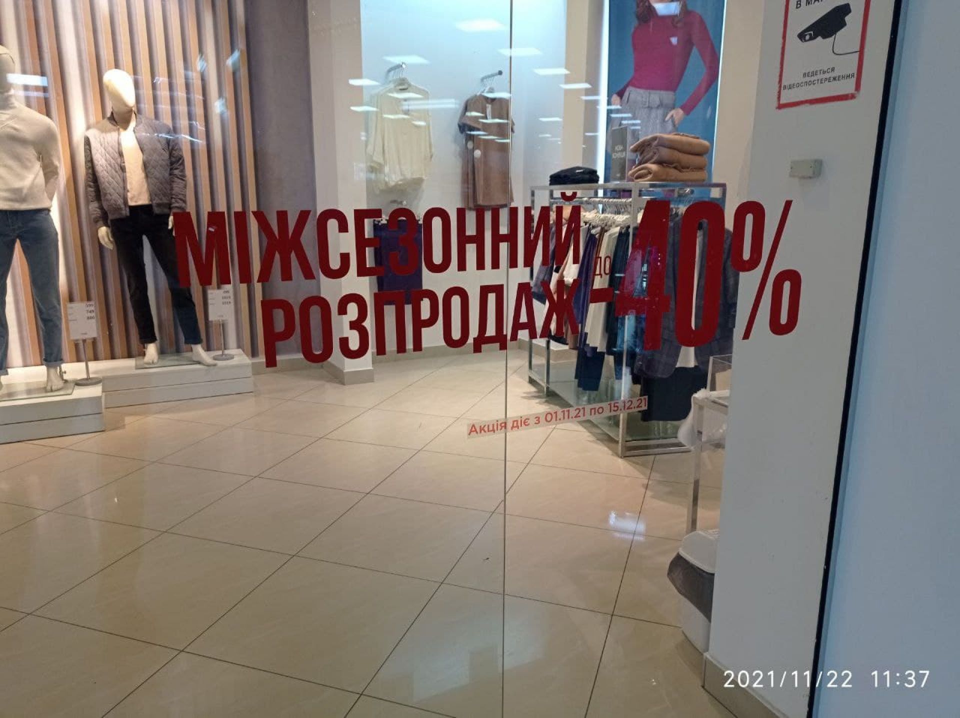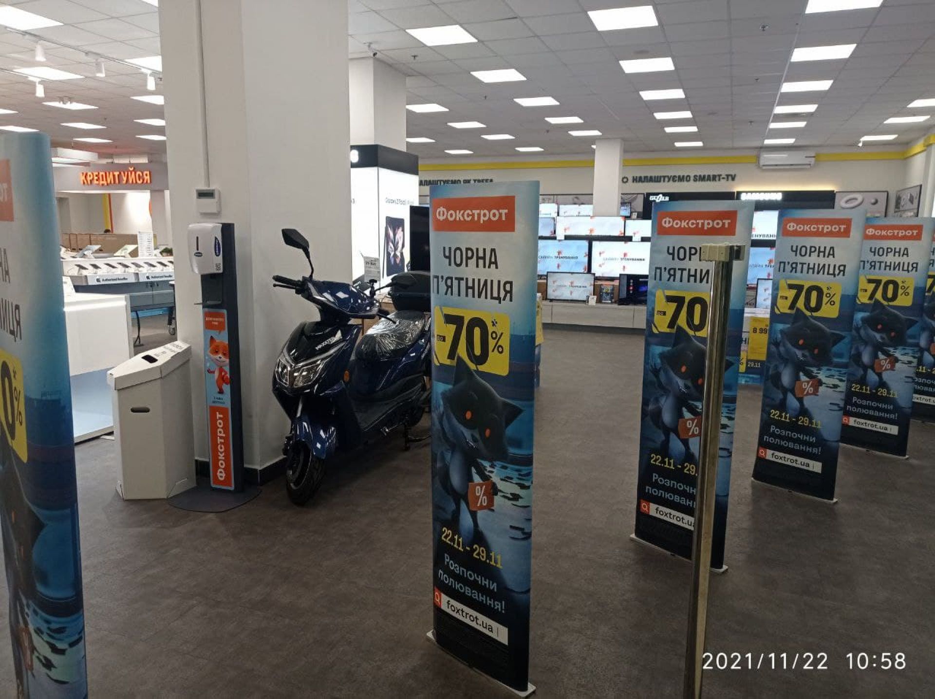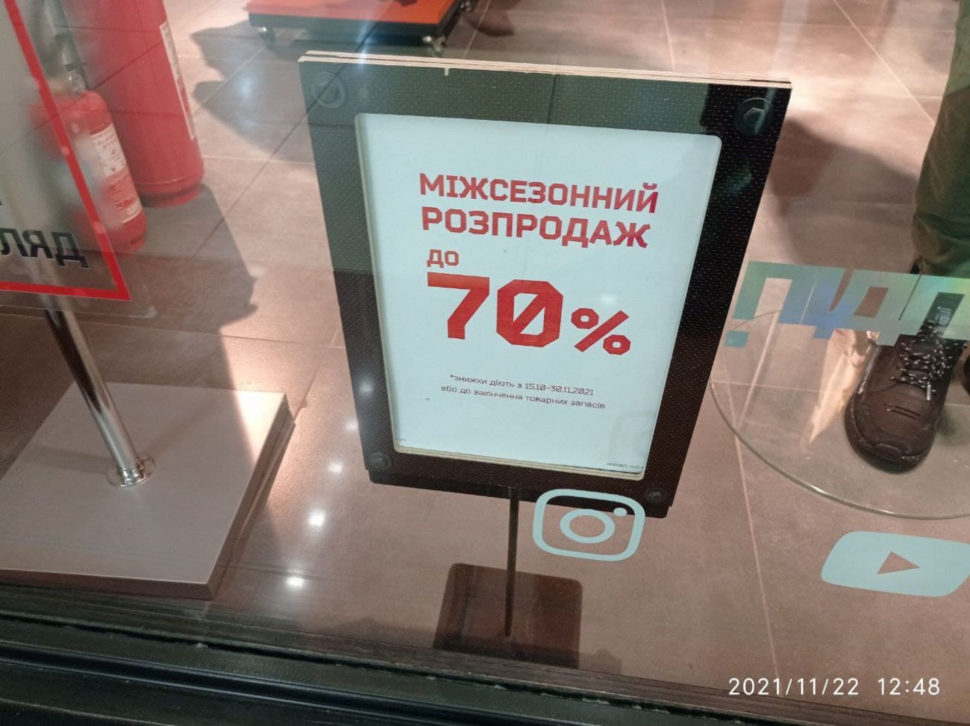 У ТЦ «Орнава» на вході вивіска – «Знижки до 60%». У магазині побутової техніки «Фокстрот» знижки на деякі товари – серед них смартфони, ноутбуки, комплектуючі, побутову техніку тощо. Період Триватимуть вони з 22 до 29 листопада. До прикладу, ноутбук ASUS G513IC коштує 37 тис. гривень, в акційний період – 34 тисячі. Пилосос PHILIPS за 4,4 тис гривень по акції обійдеться в 3 тисячі.