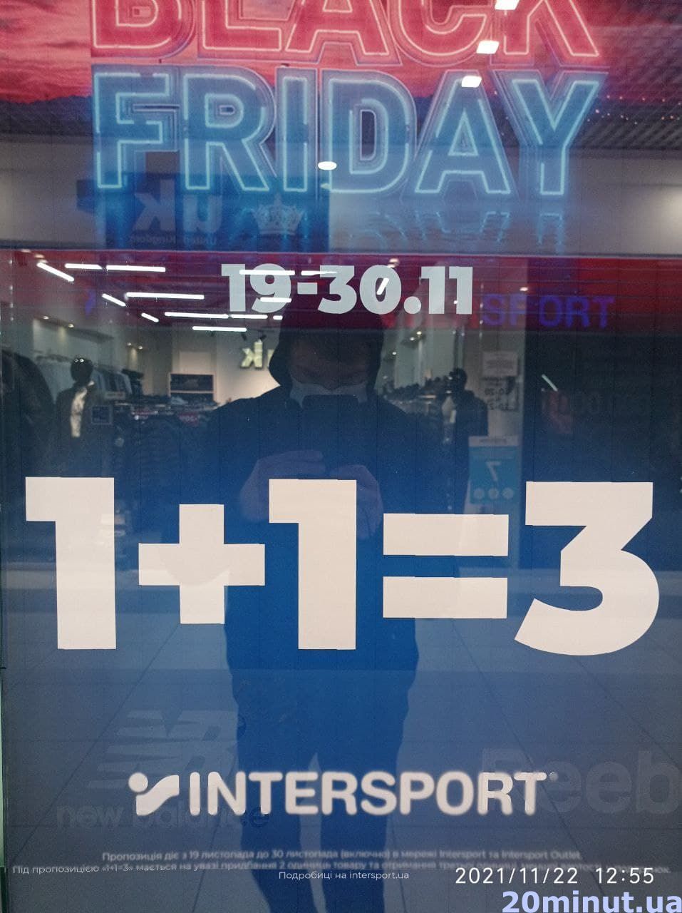 У магазині спортивних товарів Intersport акція «1+1=3» до 30 листопада. Третя річ в чеку з найнижчою ціною буде безкоштовною.