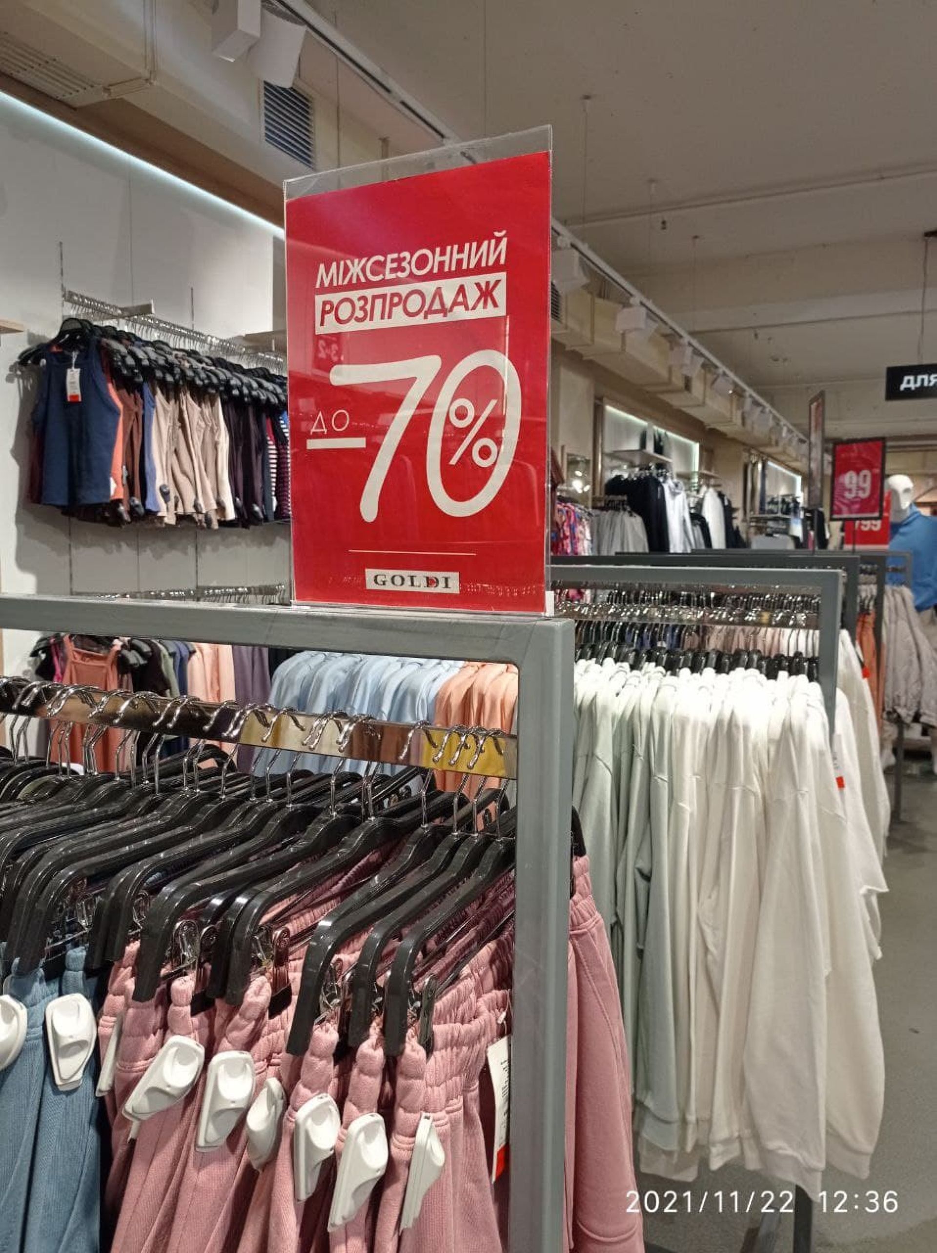У магазині Goldi до 28 листопада діятиме акція «3 за 2» – третя найдешевша річ в чеку коштуватиме 1 гривню. Діє ця пропозиція на увесь товар, але в чеку має бути не більше одного товару з «червоним цінником». Також там діє міжсезонний розпродаж. Ці речі з «червоними цінниками» можна купити зі знижкою до 70%.