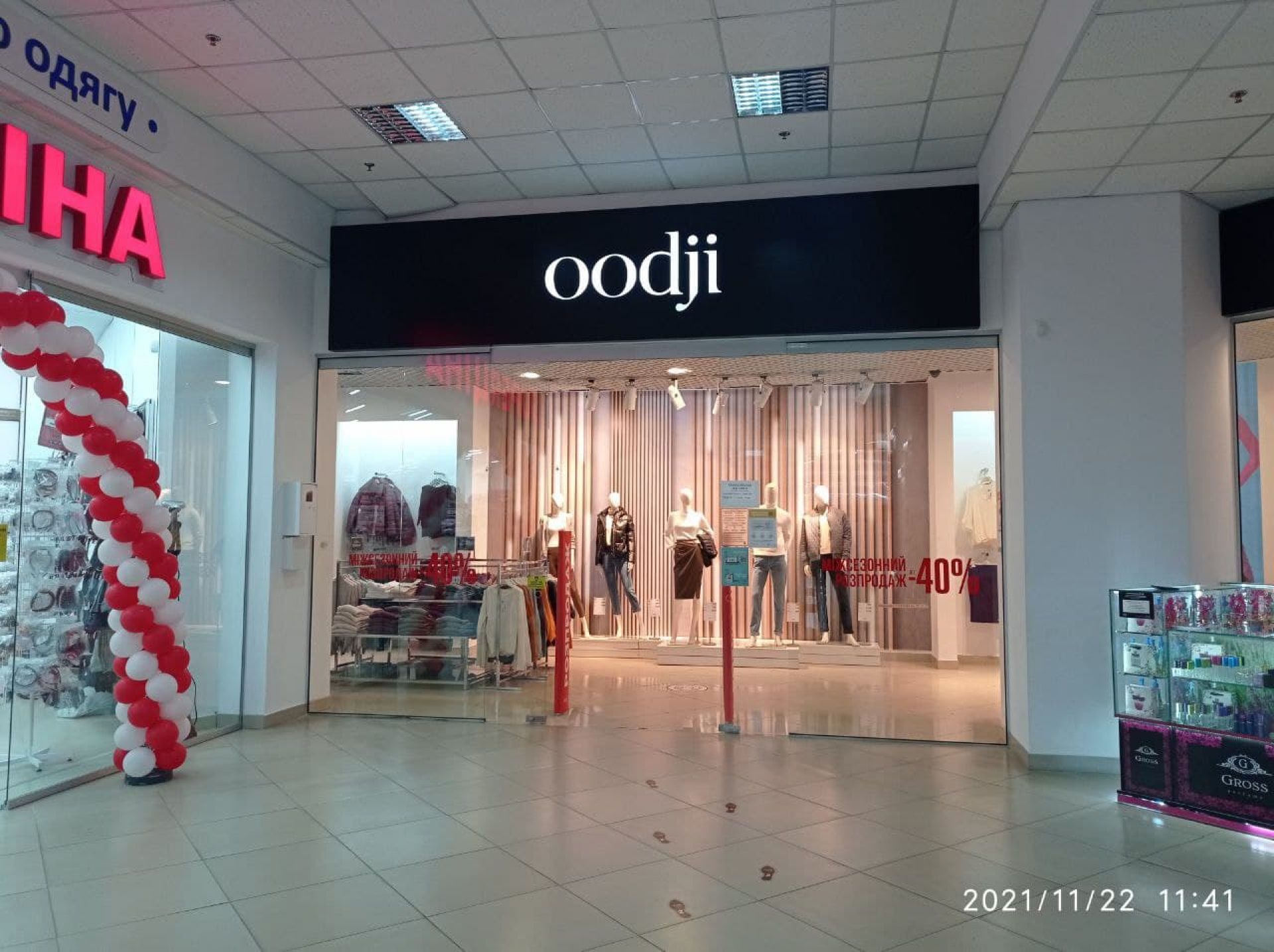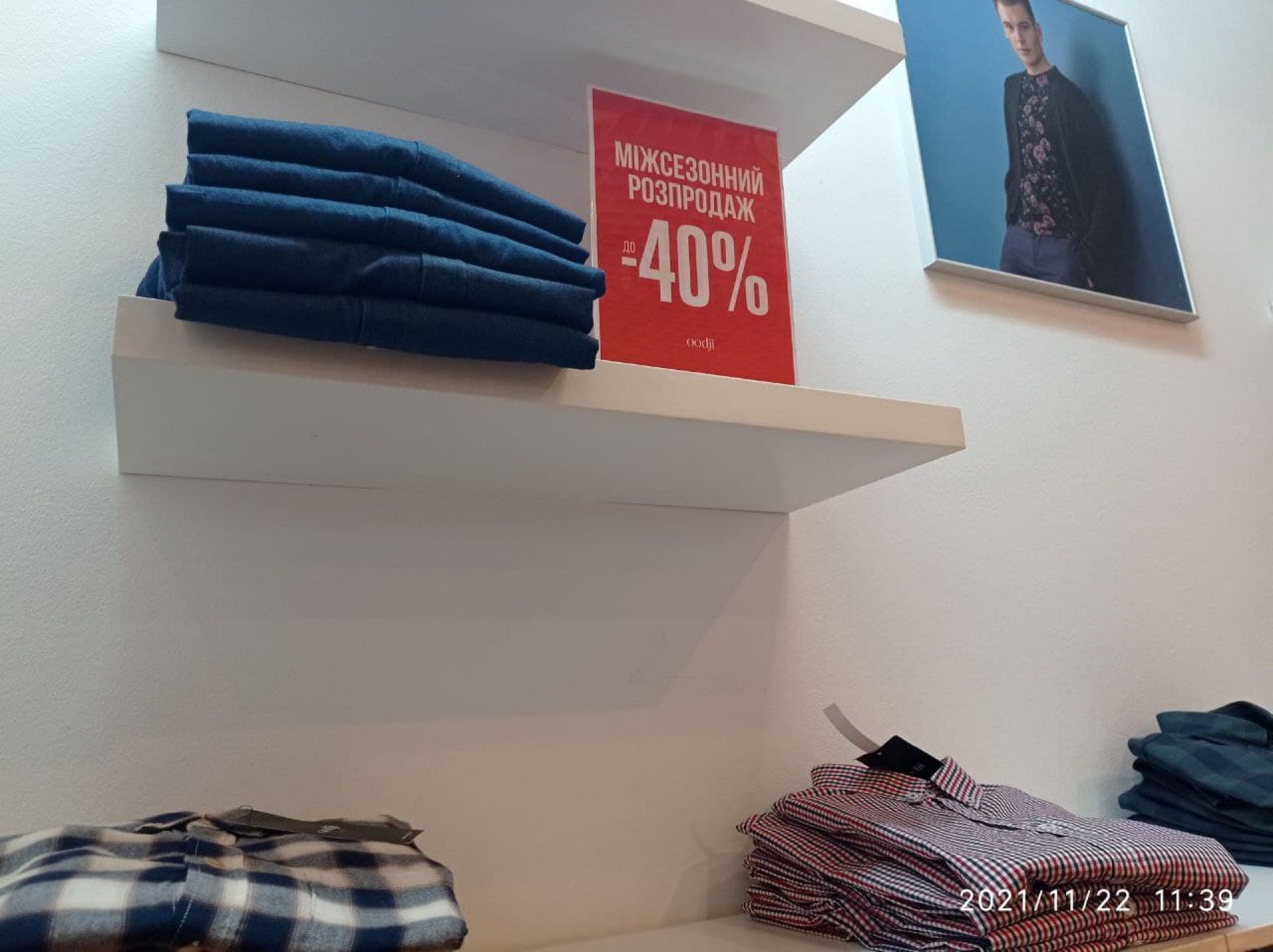У ЦУМі ми побачили знижки в магазині одягу Oodji. Там міжсезонний розпродаж. Деякі речі дешевші до 40%. Діятиме акція до 15 грудня. Дешевше можна купити сорочки, штани, джинси, верхній одяг, тощо. Такий товар лежить на окремих полицях. Нова ціна вказана поруч зі старою на ціннику.