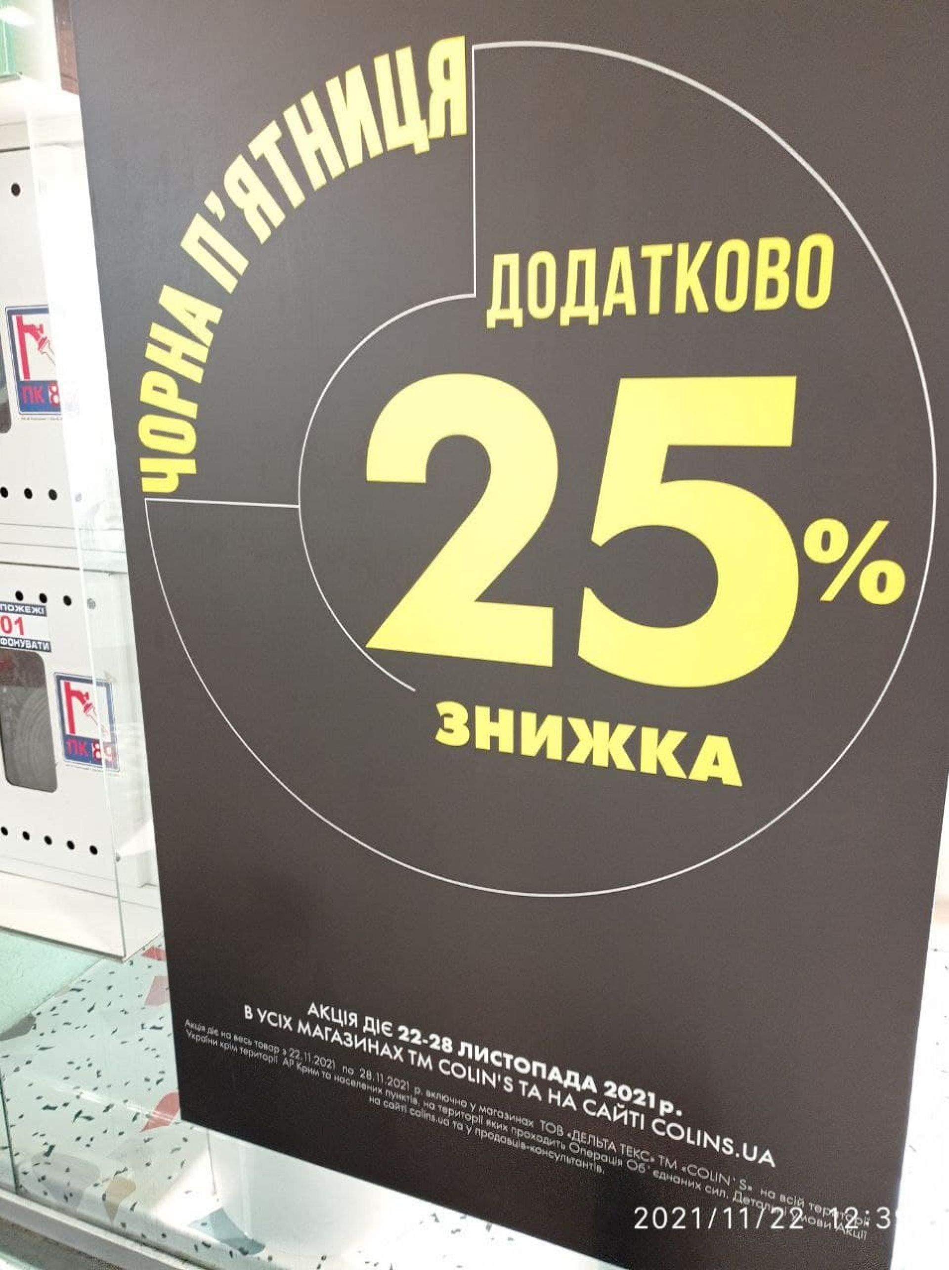 У магазині Colin`s до 28 листопада – 25% знижка на будь-який товар. Навіть на акційні речі, які продають зі знижкою, діє знижка «п’ятниці» в 25% – пояснили консультанти.