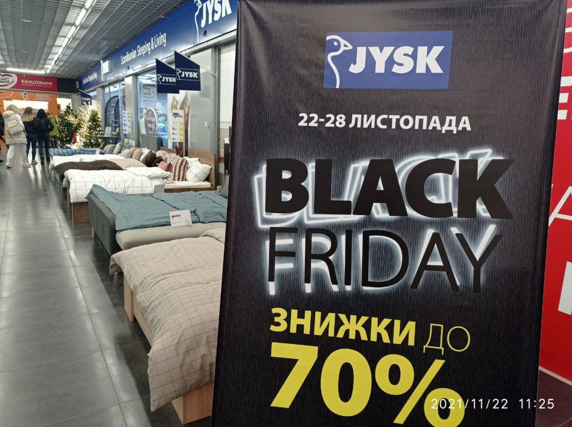 У магазині JYSK знижки до 70% триватимуть до 28 листопада. Більшість товарів, як ми помітили, з жовтими акційними цінниками. Знижки 60–70% на ковдри, подушки, матраци, деякі меблі.
