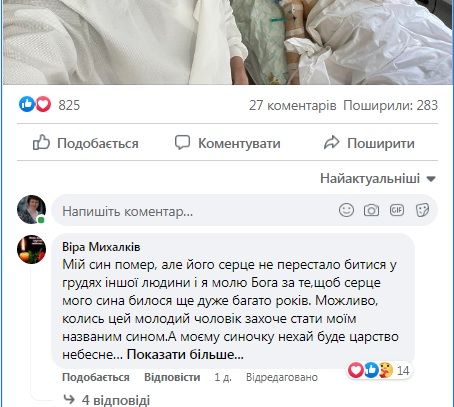 Під одним з дописів у фейсбуці про цю пересадку написала відгук, ймовірно, мама чоловіка, який став донором.