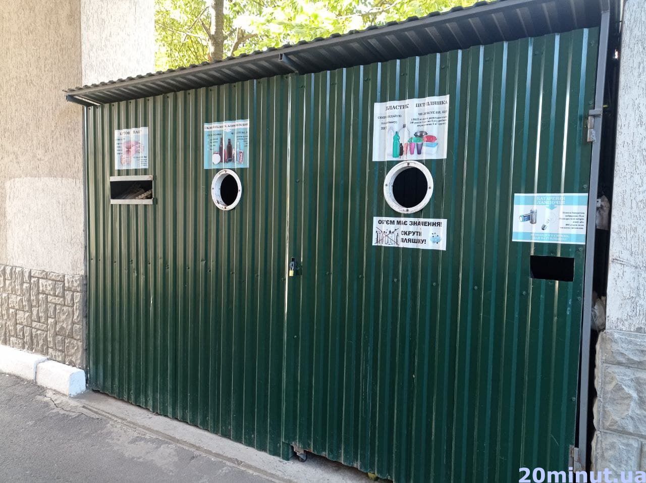 Біля деяких будинків встановили по кілька контейнерів для різного типу сміття. Ось такий ми помітили на вулиці Острозького.