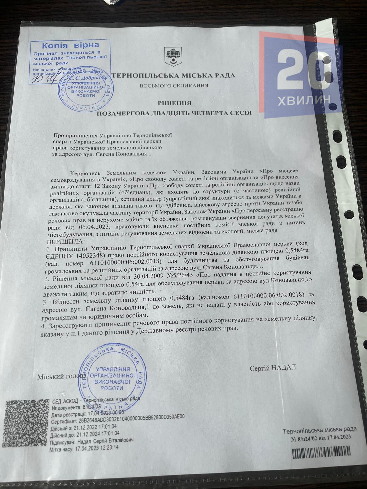 А ось так у міській раді подають підстави для прийняття свого рішення. Для читачів «20 хвилин» ми показуємо копію документа з мокрими печатками.